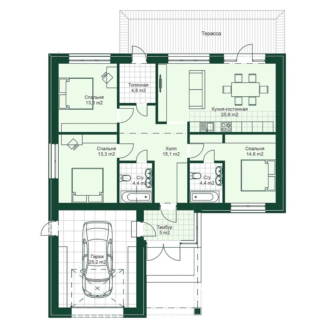 Благодаря единому архитектурному стилю экопоселок выглядит современно и гармонично. На закрытой территории имеется детская и спортивная площадка, а также общая зона отдыха, оборудованная беседками. Мы предлагаем 8 проектов домов на выбранном вами участке. Дополнительная опция – гараж 25,2м² для вашего автомобиля (уточняйте стоимость).