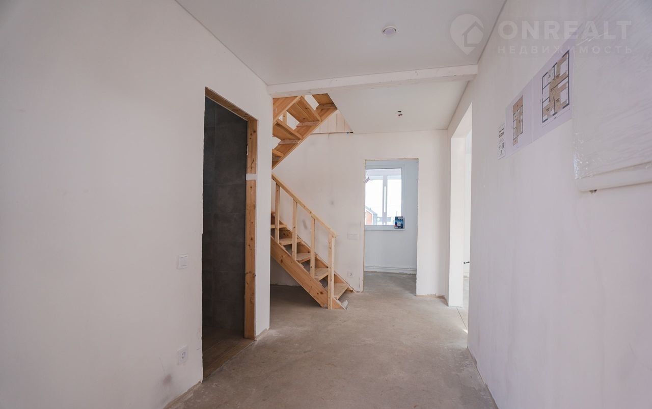 Отделка Whitе Вох: стены - подготовлены под покраску, на полу - стяжка с теплым полом на первом этаже и ОСБ, в с/у - плитка на первом этаже, шпатлевка на втором. Натяжные потолки, светильники, розетки, выключатели.