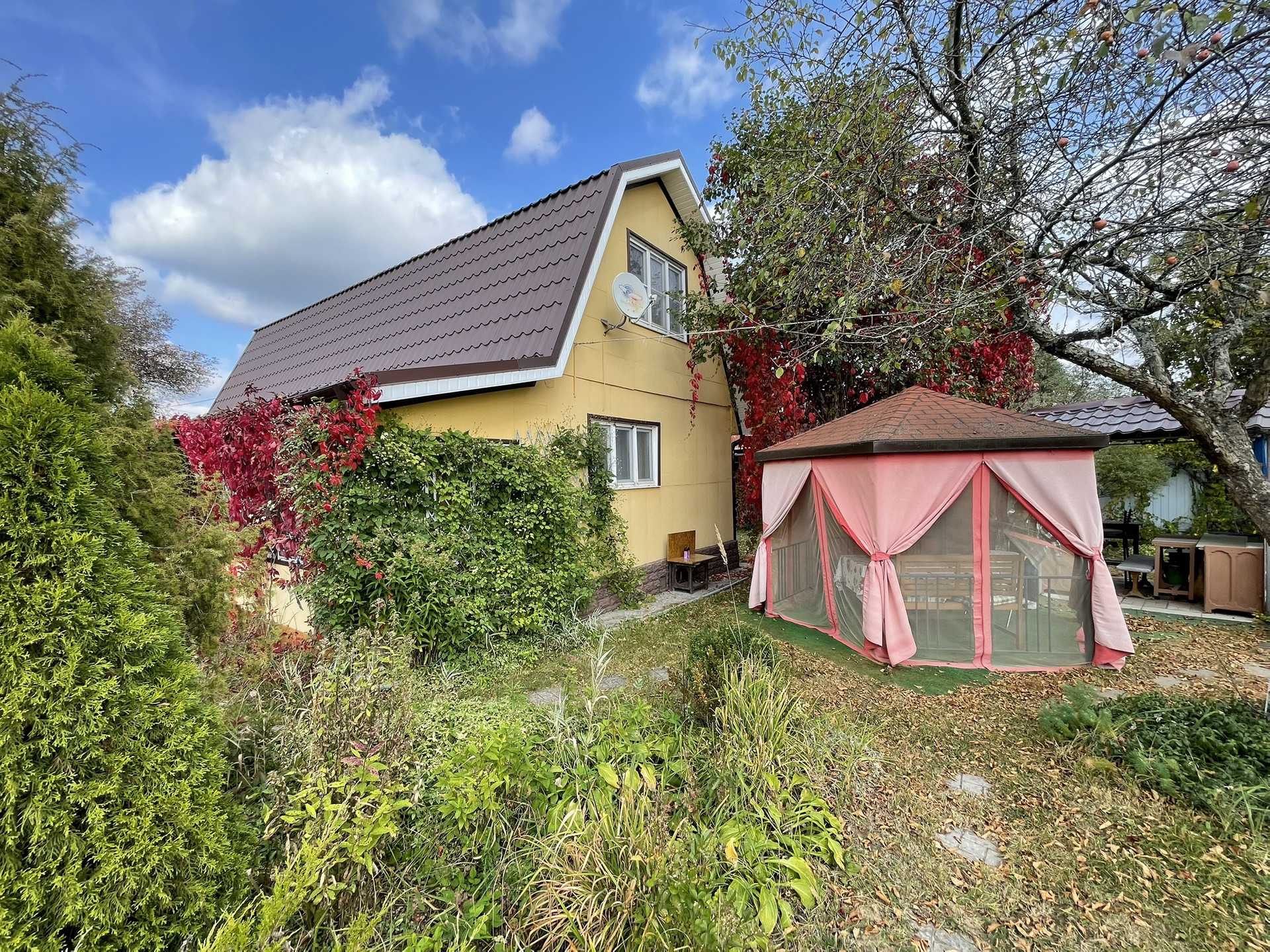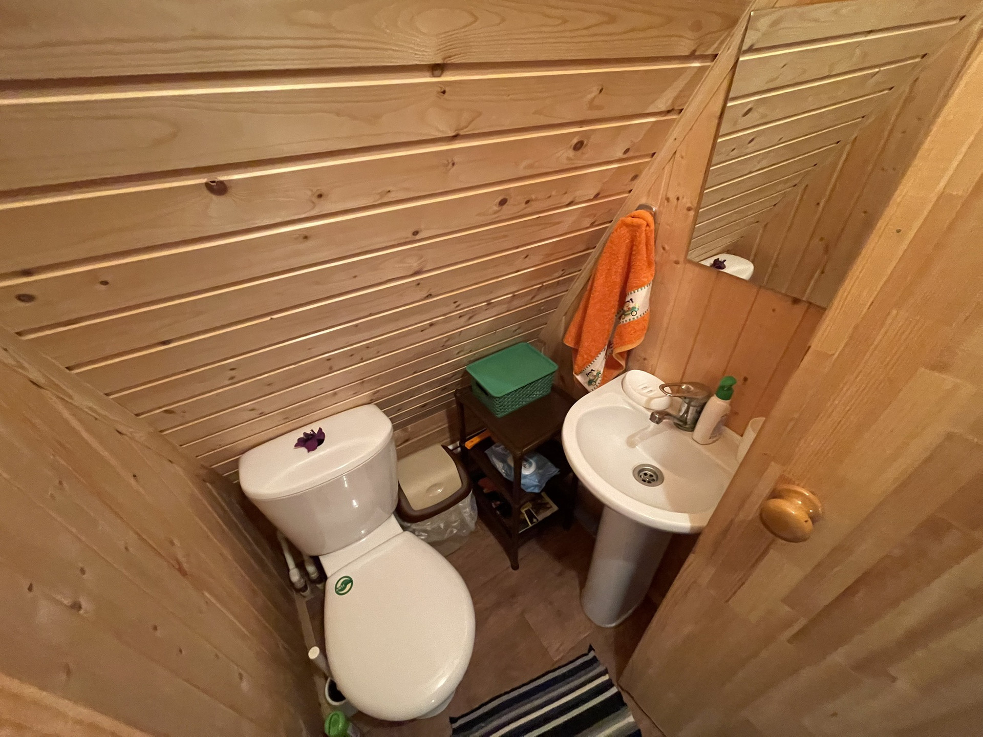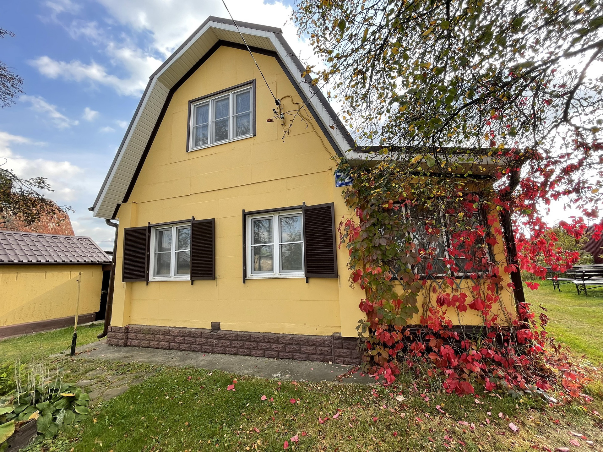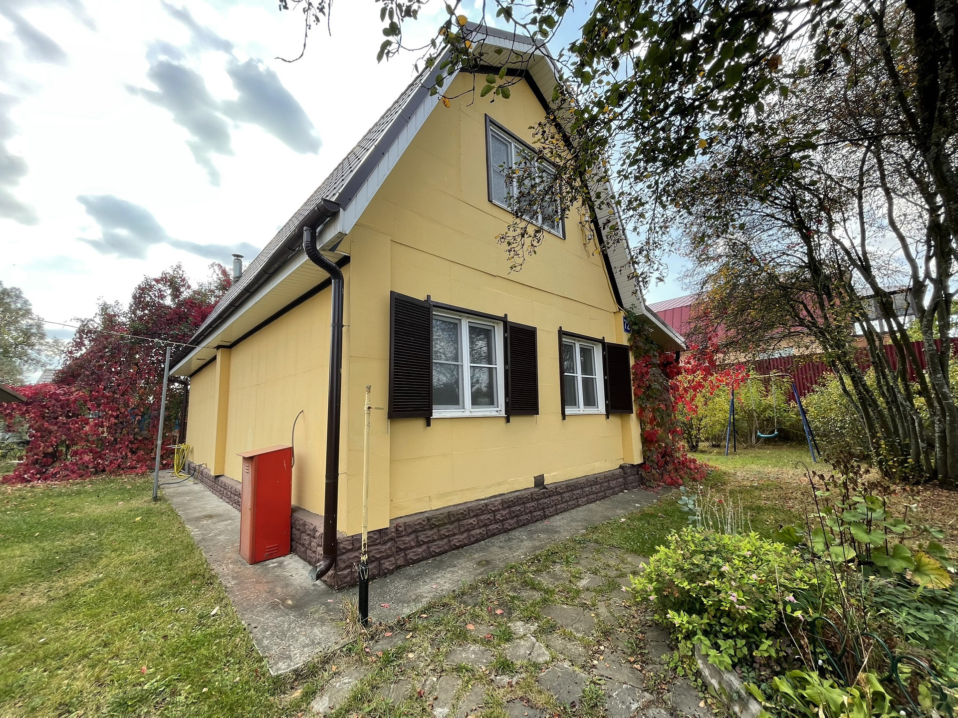 Дом бревенчатый, 2 этажа, в дом проведено водоснабжение от собственной скважины, вода питьевая, горячее водоснабжение от электрического водрнагревателя, канализация - септик, электричество 220 В., отопление от металлической печи и электрических конвекторов, магистральный газ заведен на участок, газовая труба выведена до фундамента дома, в подключении не было необходимости, в доме на 1 этаже: кухня, гостиная, спальная комната, прихожая, совмещенный сан.узел, чулан, просторная терраса; на 2 этаже 2 спальные комнаты с карманами для хранения вещей под крышей, совмещенный сан.узел. Крыша в отличном состоянии полностью обновлена в 2010-х годах, покрытие металлочерепица, окна ПВХ. Мебель в доме частично остается новому собственнику. Под домом есть большой кирпичный погреб, для хранения консервации и овощей. Фундамент ленточный.