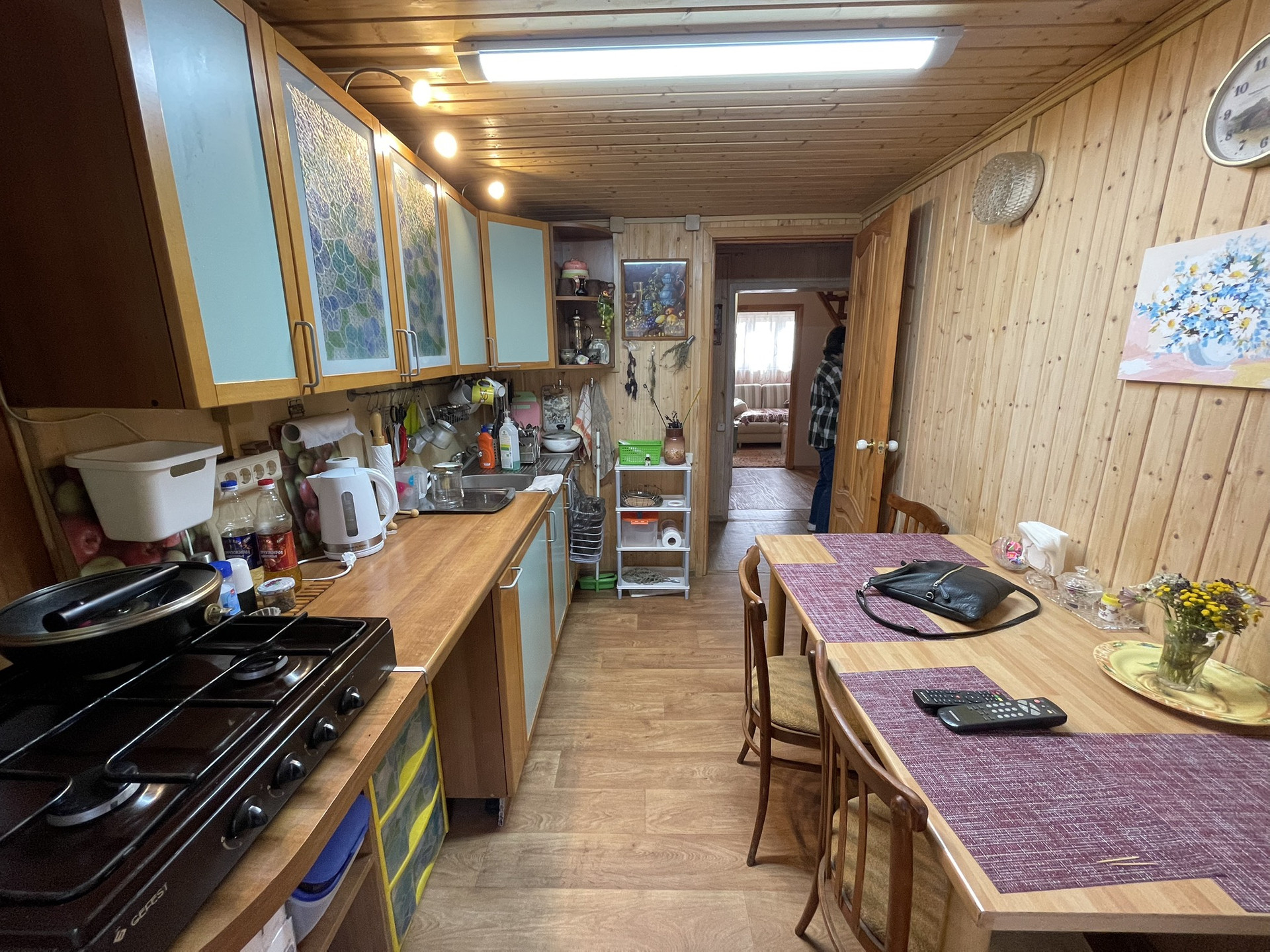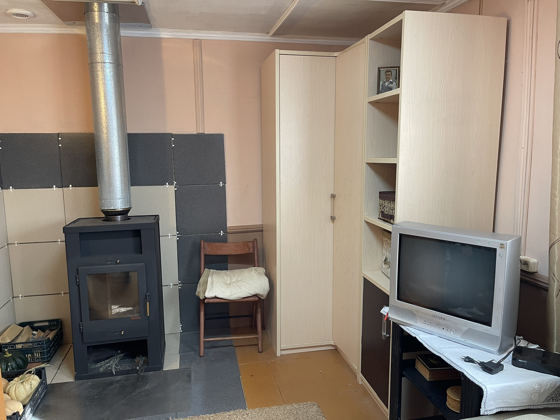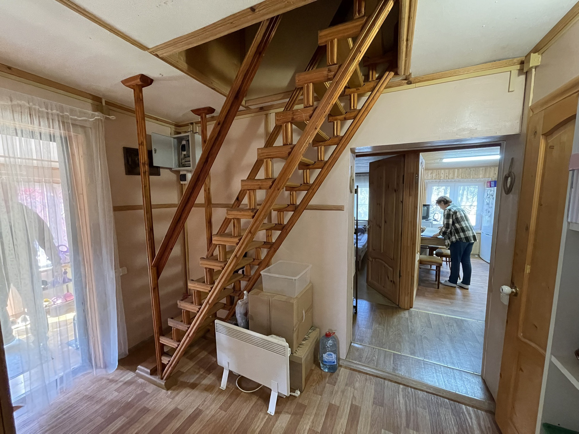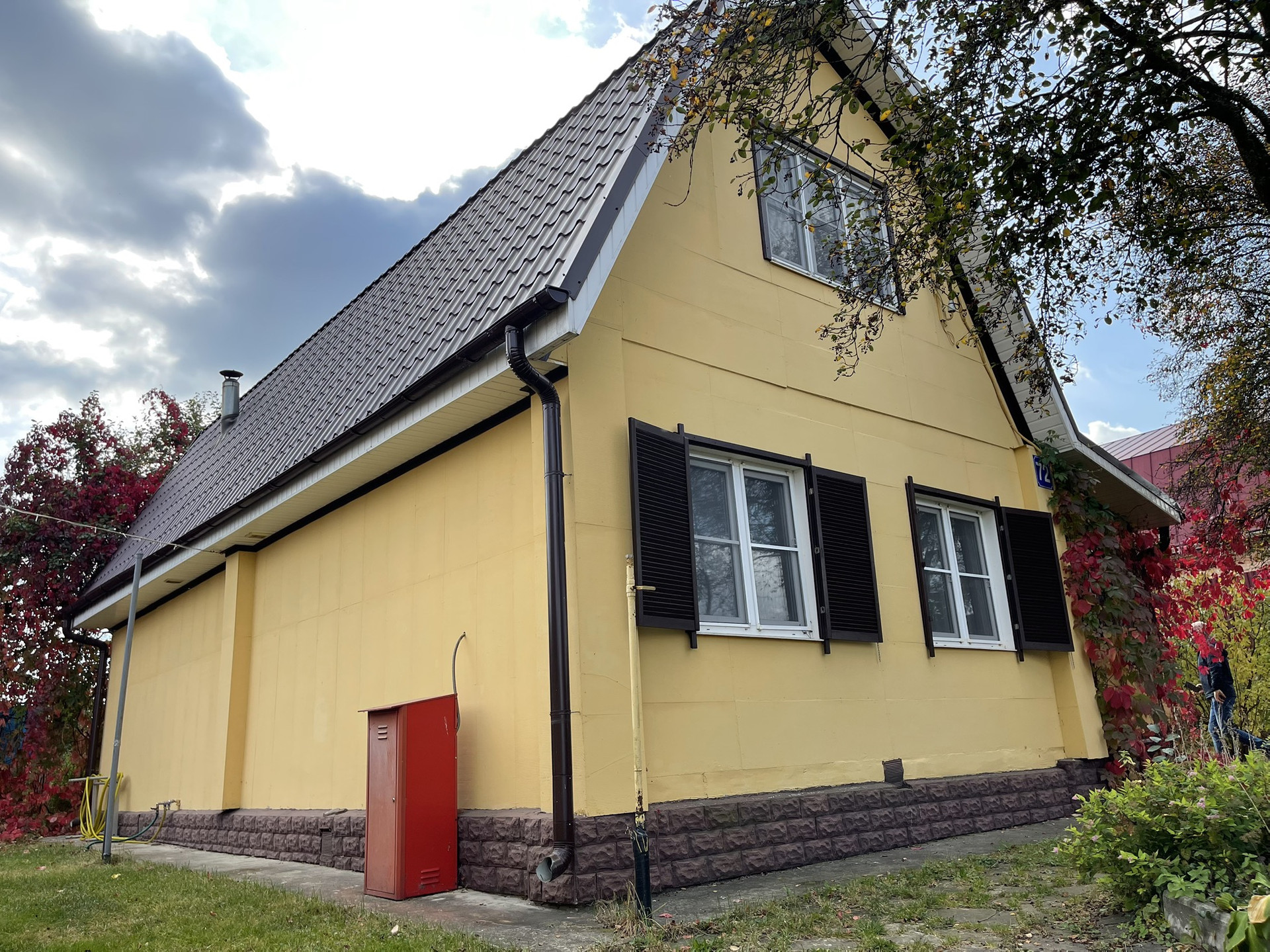 Дом бревенчатый, 2 этажа, в дом проведено водоснабжение от собственной скважины, вода питьевая, горячее водоснабжение от электрического водрнагревателя, канализация - септик, электричество 220 В., отопление от металлической печи и электрических конвекторов, магистральный газ заведен на участок, газовая труба выведена до фундамента дома, в подключении не было необходимости, в доме на 1 этаже: кухня, гостиная, спальная комната, прихожая, совмещенный сан.узел, чулан, просторная терраса; на 2 этаже 2 спальные комнаты с карманами для хранения вещей под крышей, совмещенный сан.узел. Крыша в отличном состоянии полностью обновлена в 2010-х годах, покрытие металлочерепица, окна ПВХ. Мебель в доме частично остается новому собственнику. Под домом есть большой кирпичный погреб, для хранения консервации и овощей. Фундамент ленточный.
