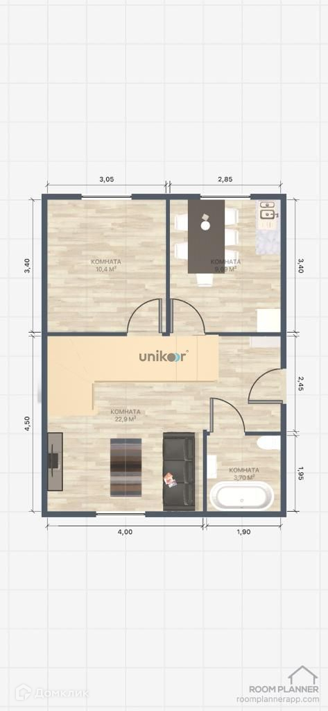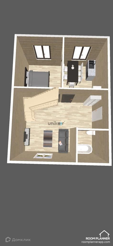 1 этаж – прихожая, зал, кухня, комната, санузел (совмещенный)