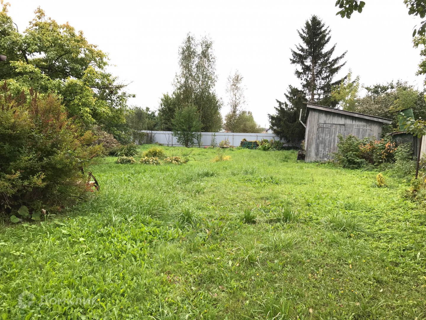 Участок огорожен, 10 соток правильной формы-плодовые деревья и декоративные растения, предусмотрен гараж-30 кв .м., остальное место под склад.