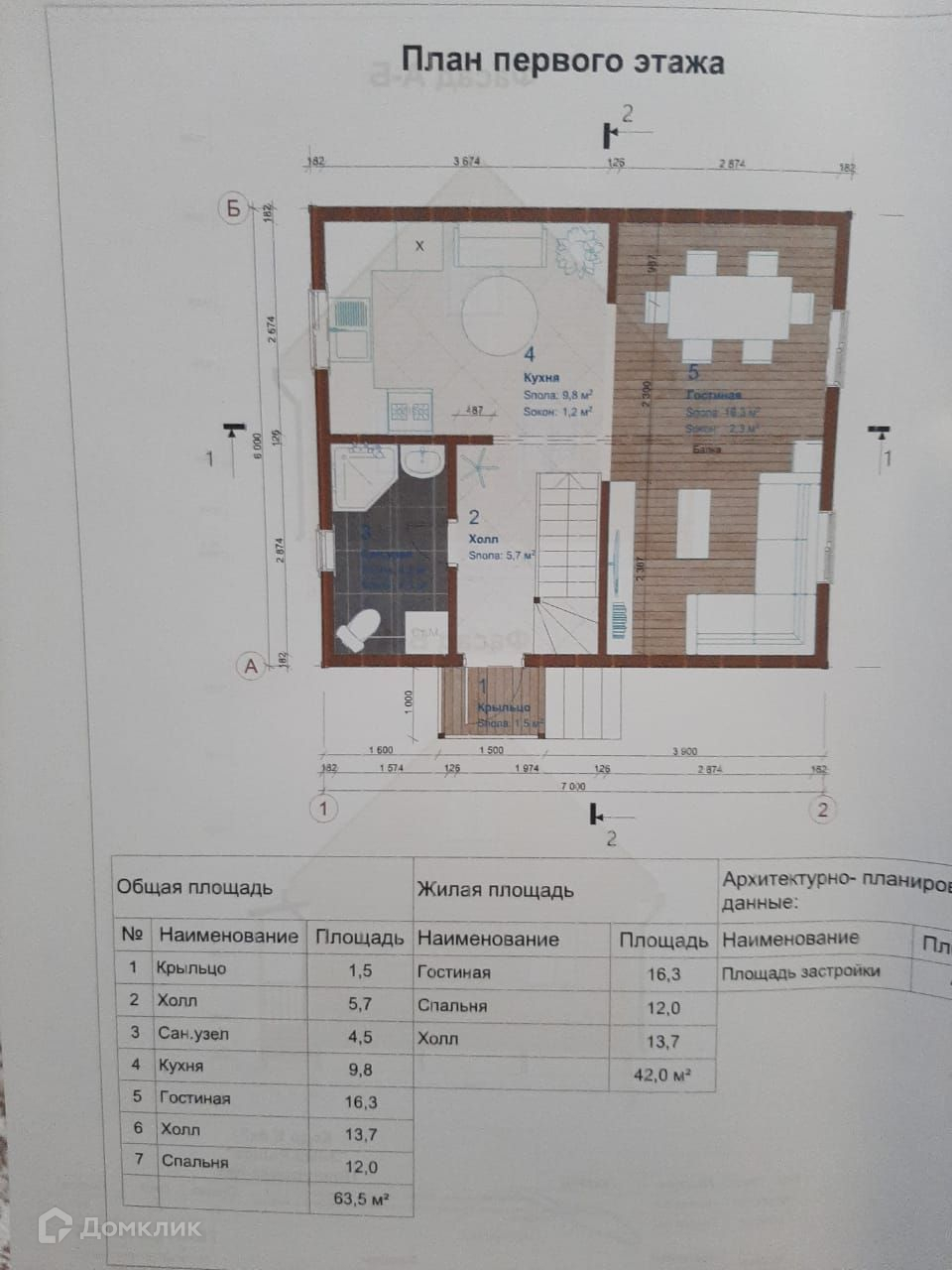 Первый этаж - удобная просторная прихожая, бойлерная, совмещённый санузел, просторная гостиная с кухней.