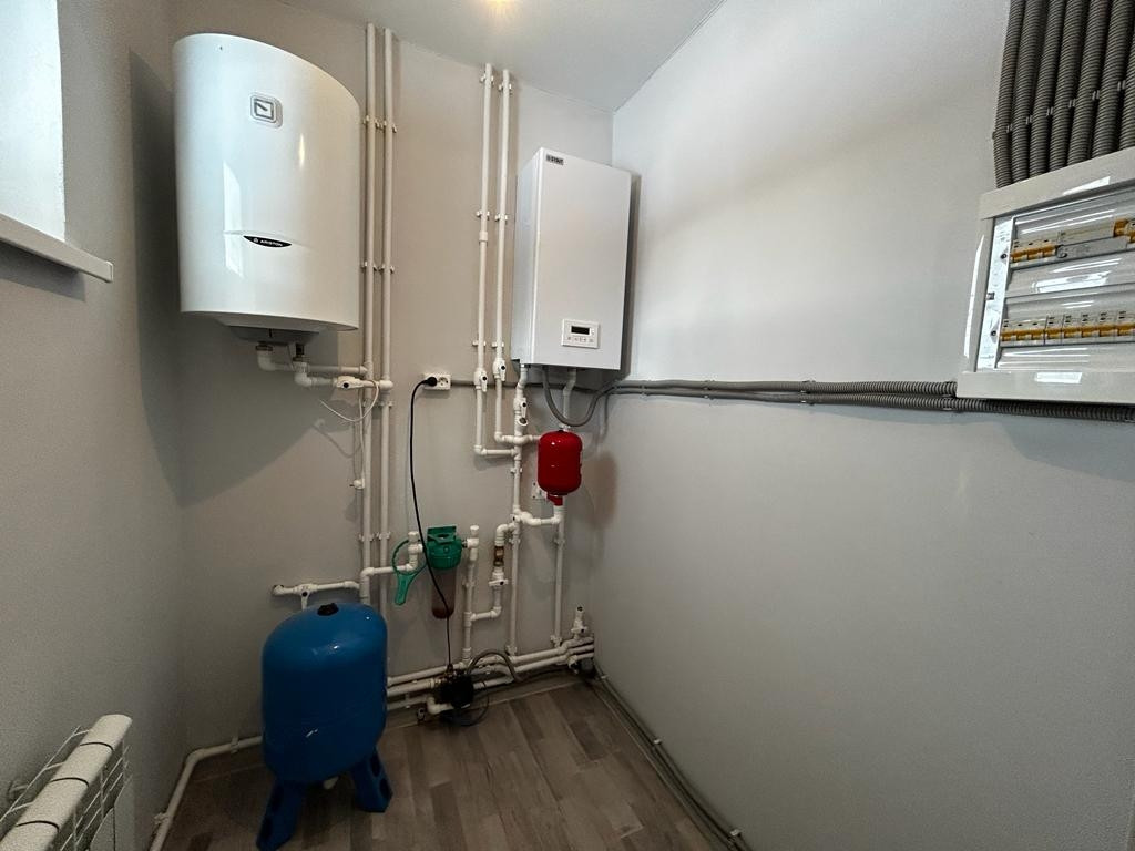 Отопление электрическое (электрический котёл мощностью 12 кВт), водонагреватель Ariston 80 л.