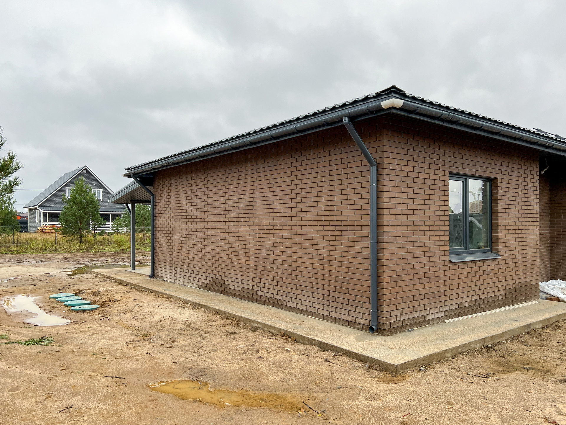 Дом построен из армированного газоблока (плотность D500) и облицовочного кирпича.