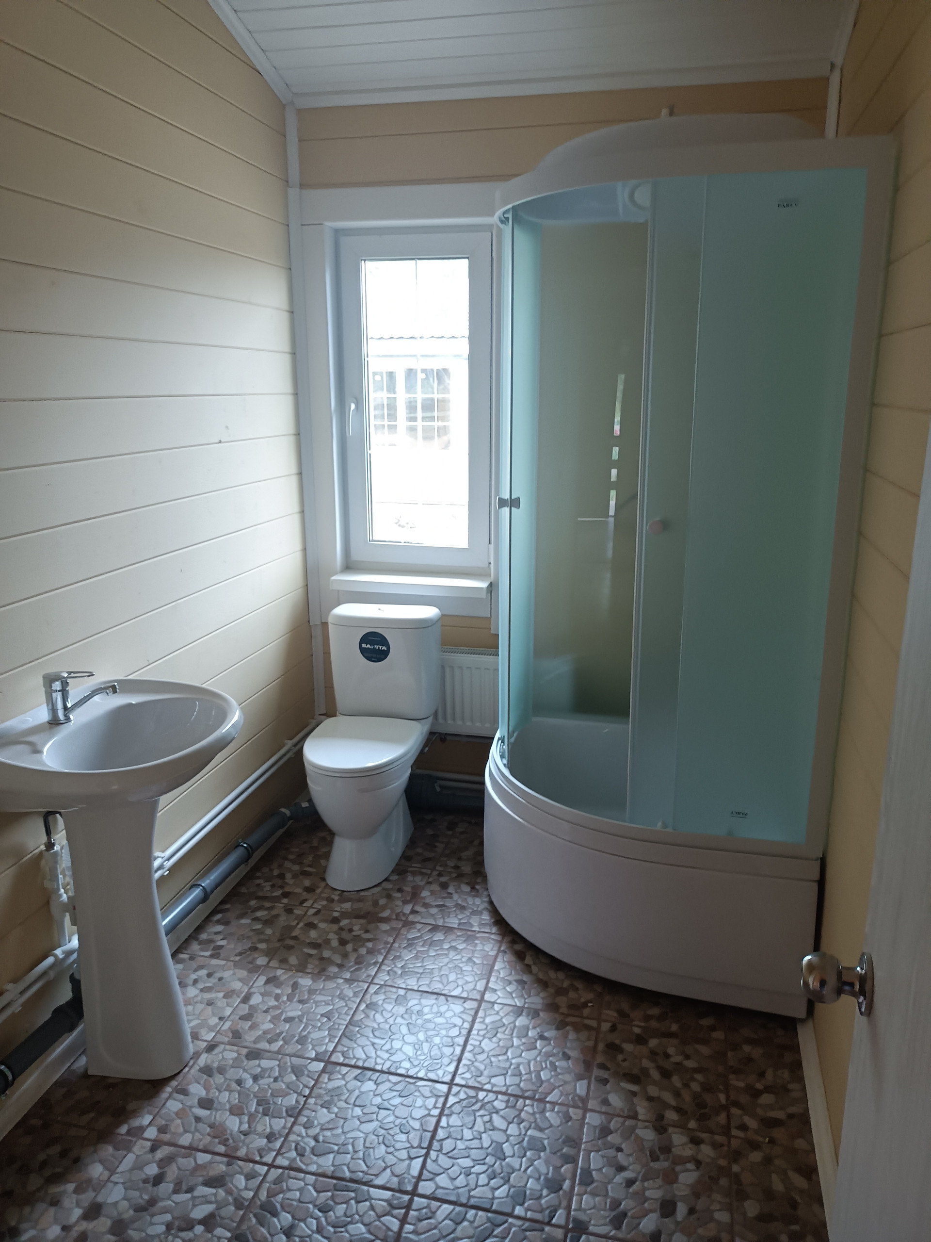 - Вода - скважина на участке, водонагреватель, вода проведена в кухню и санузлы. В двух санузлах - душевая кабина, две раковины, два унитаза, сантехника.