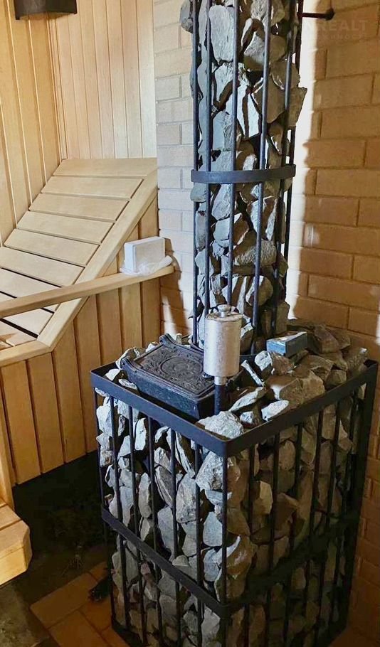 Печь- чугунная топка, обложена внутри парилки камнем, оборудована закрытой каменкой и специальным устройством, позволяющим вырабатывать мелко дисперсионный пар. Портал отделан дорогостоящим камнем. Дымоход качественный с хромированным кожухом.