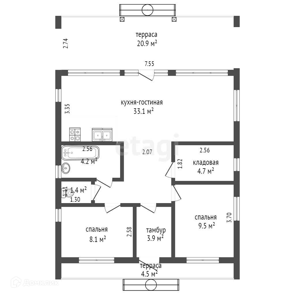 2 террасы - 20,9 кв.м., 4,5 кв.м.