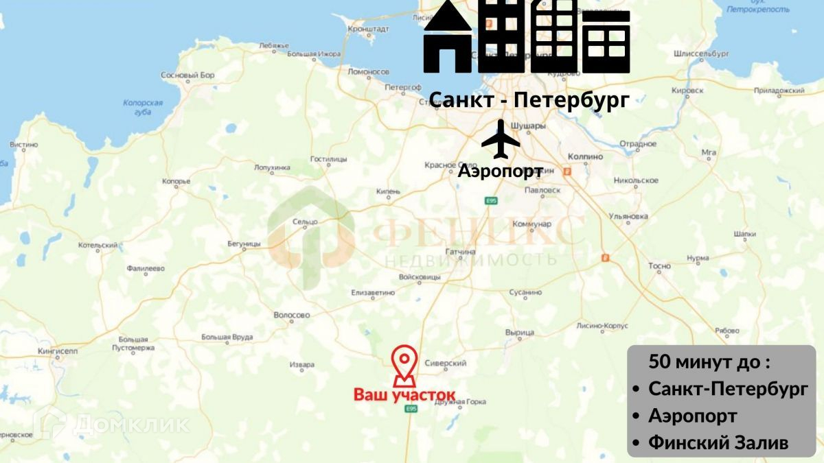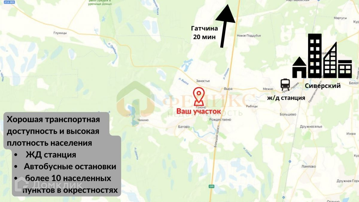 Город Гатчина является столицей Ленинградской области. Вокруг города из С. Петербурга построена современная окружная магистраль, что на много сокращает время подъезда к землям. От земельных участков до С. Петербурга 68 км., до местного аэродрома 10 км. ,до Аэропорта "Пулково" 45 км.