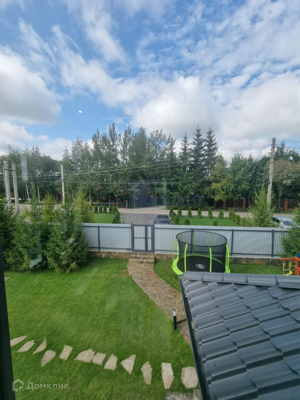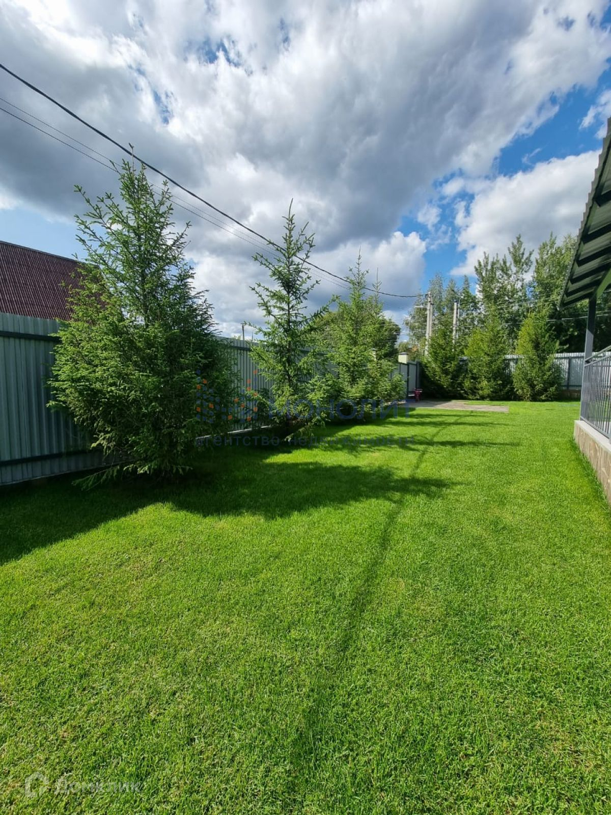 Територрия облагорожена, выражены туи, ели и газон, детская площадка.