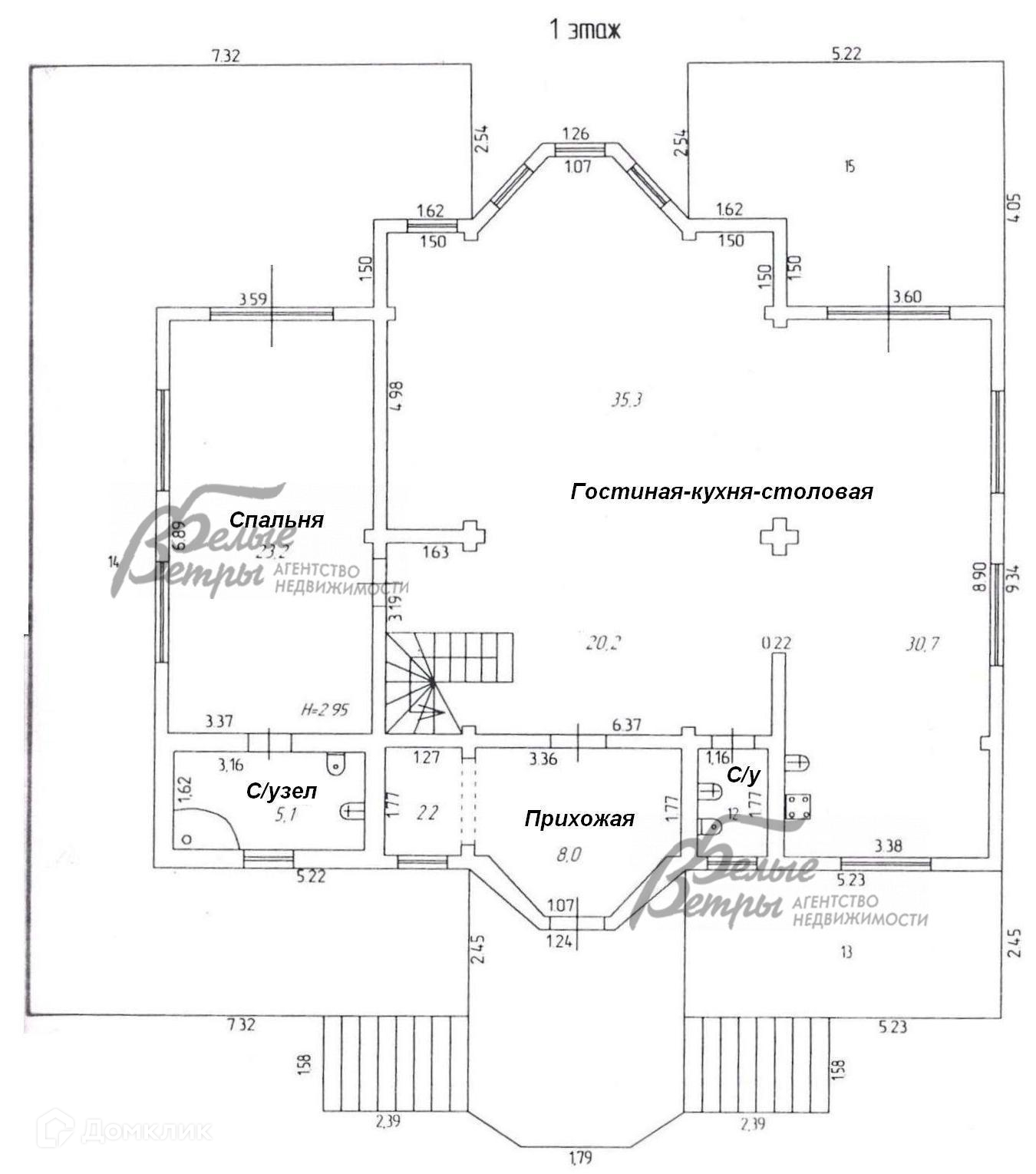 1-ый этаж: прихожая 10,2 кв.м, двухсветная гостиная с кухней и столовой 86,2 кв.м и выходом на террасу, спальня 23,2 кв.м с выходом на террасу, с/узел 5.1 кв.м с ванной, с/узел 2 кв.м..