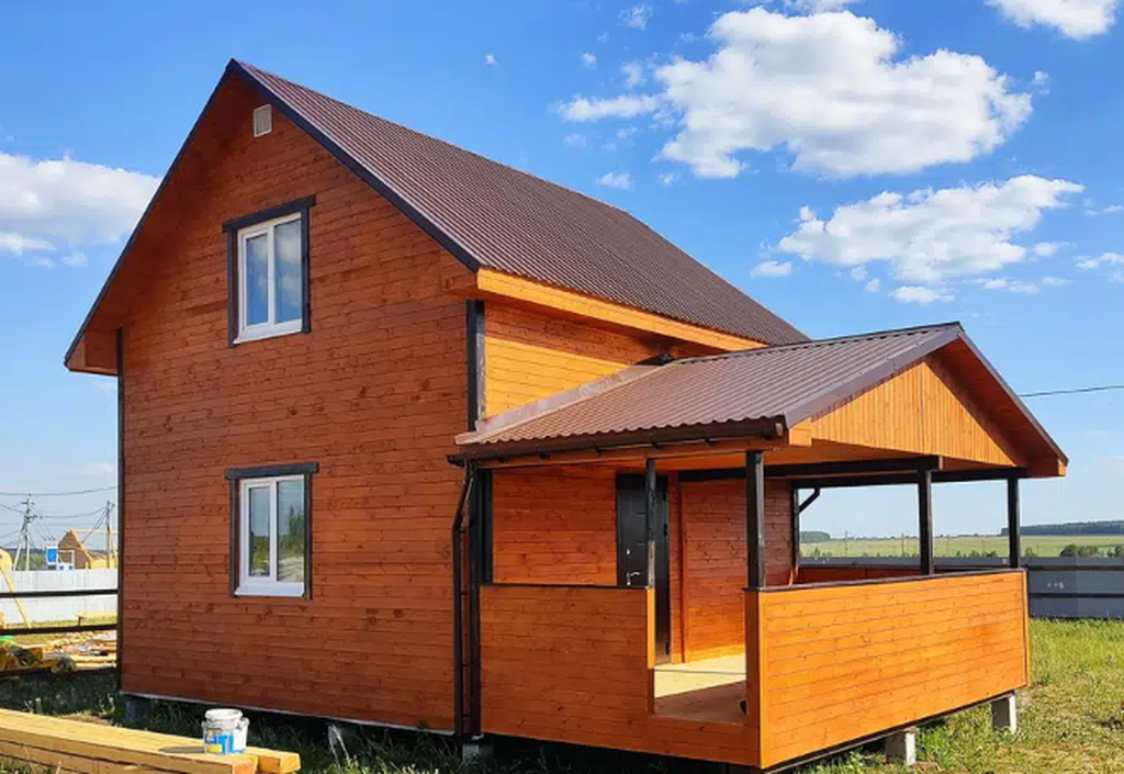 2. Деревянный дом построен по каркасной технологии из бруса.