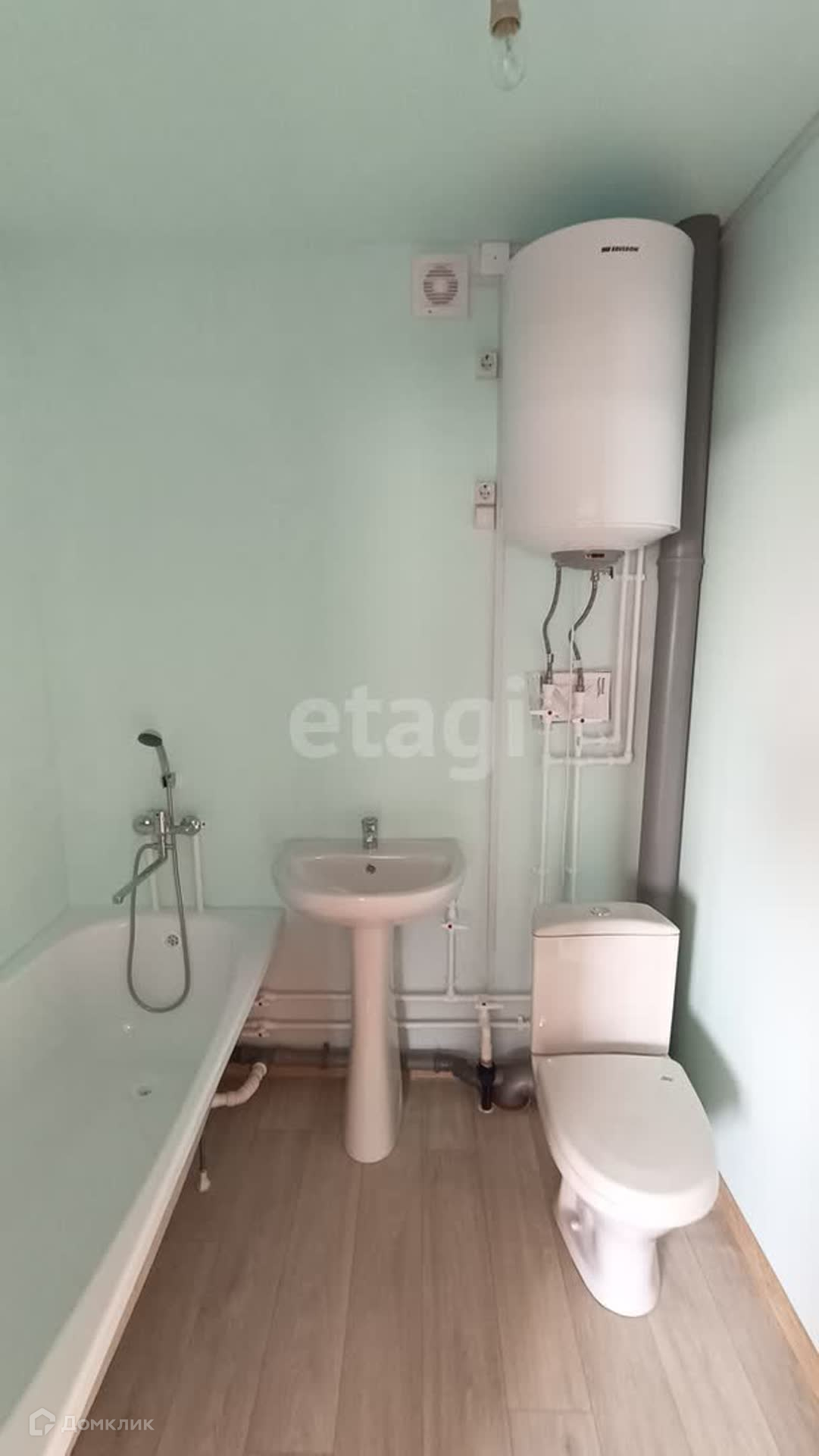 В сан. узле стоит ванна, раковина, унитаз и бойлер, сделана подготовка для подключения стиральной машины.