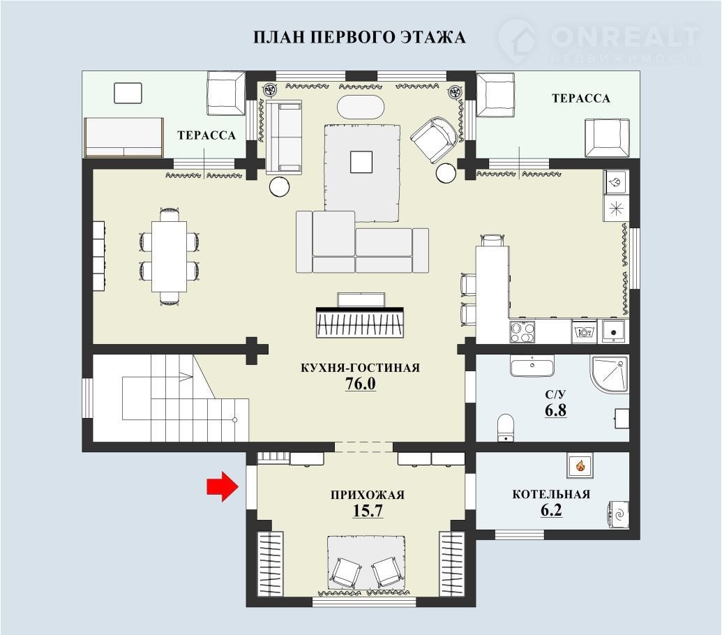 На первом этаже дома расположены вместительный холл, котельная, с/у, и огромная кухня-гостиная-столовая со вторым светом и выделенными зонами для комфортного отдыха, приятной семейной трапезы и удобной готовки.