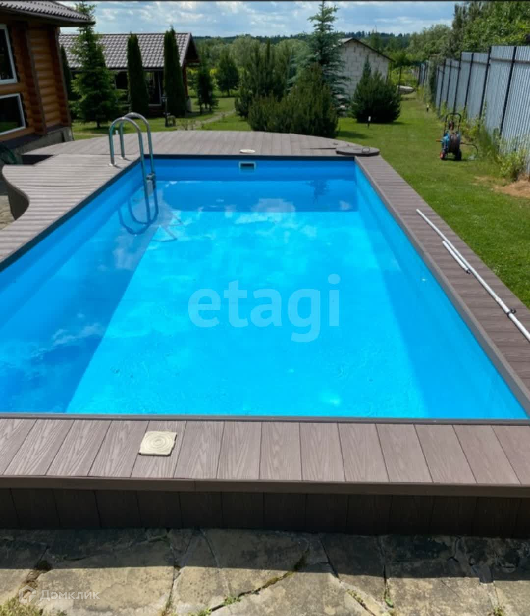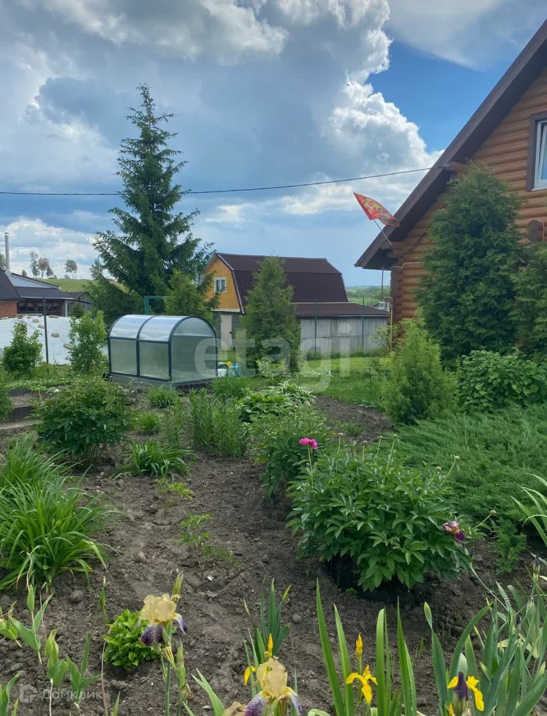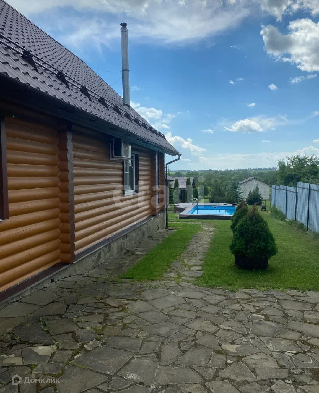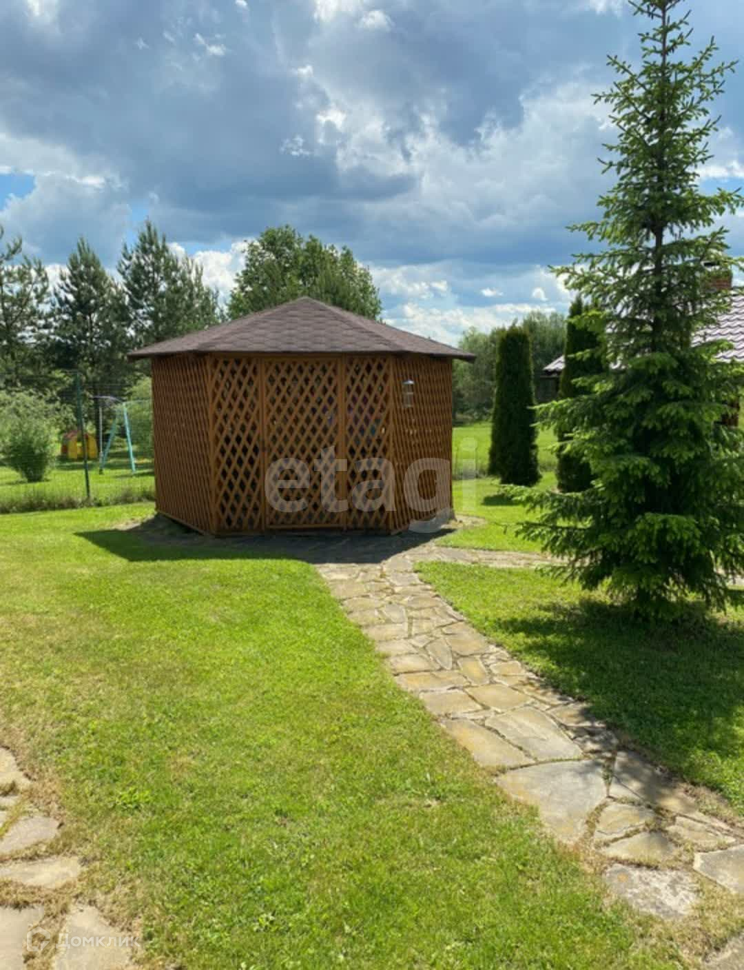 Половина участка застроена всем необходимым для комфортной жизни: летняя кухня, бассейн,баня, гараж, беседка и сам дом. Высажены различные деревья.