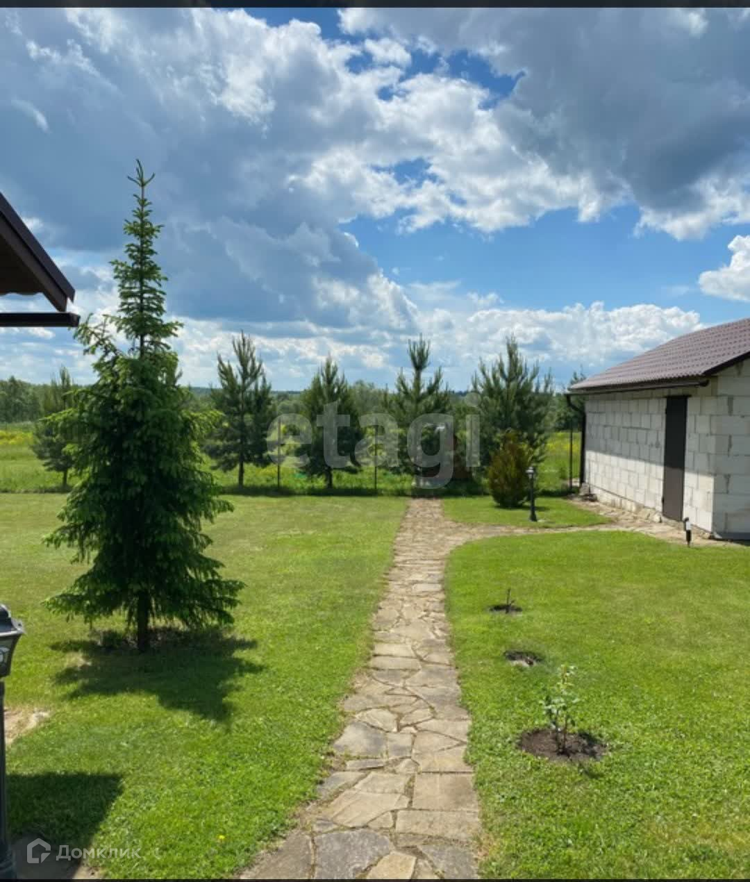Половина участка застроена всем необходимым для комфортной жизни: летняя кухня, бассейн,баня, гараж, беседка и сам дом. Высажены различные деревья.