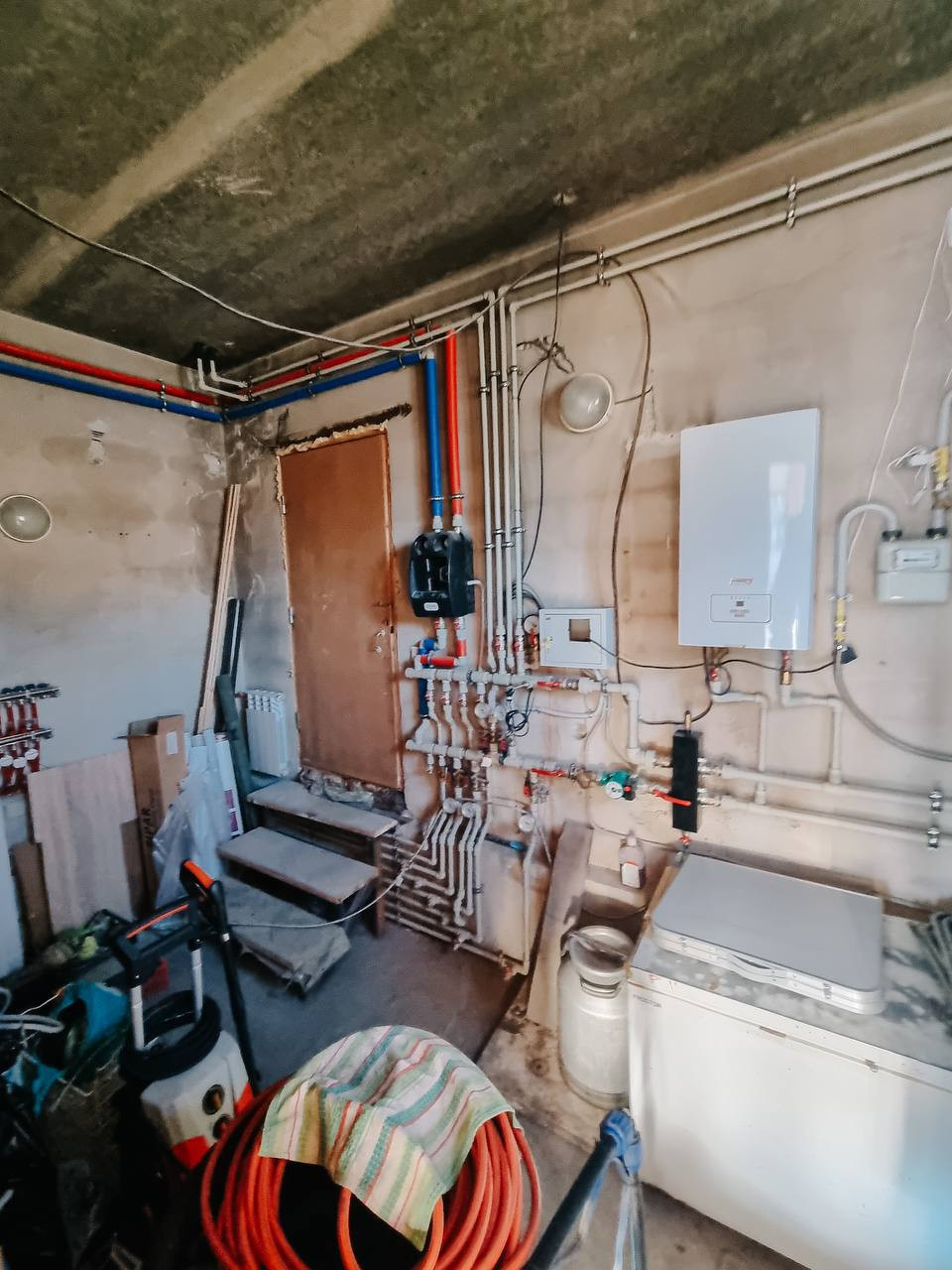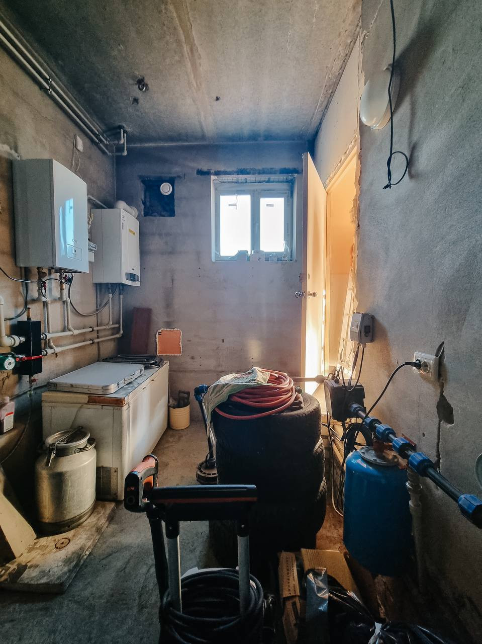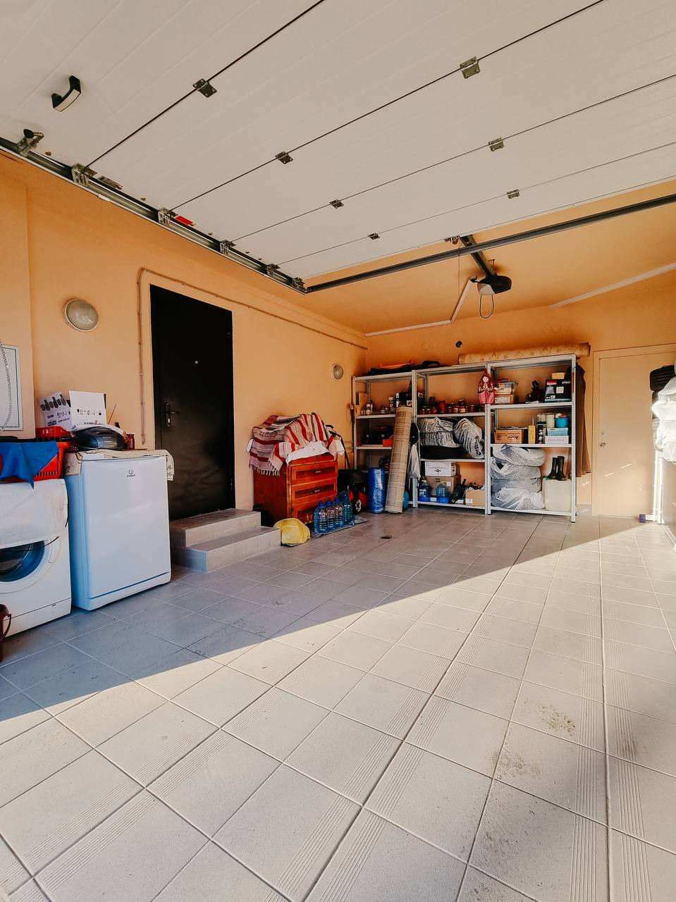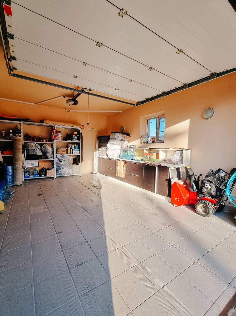 Теплый просторный гараж. Стены оштукатурены и покрашены, пол выложен плиткой. Установлены автоматические ворота (2 пульта) -DoorHan, вьездные ворота - FAAC., входная группа в дом остеклена.