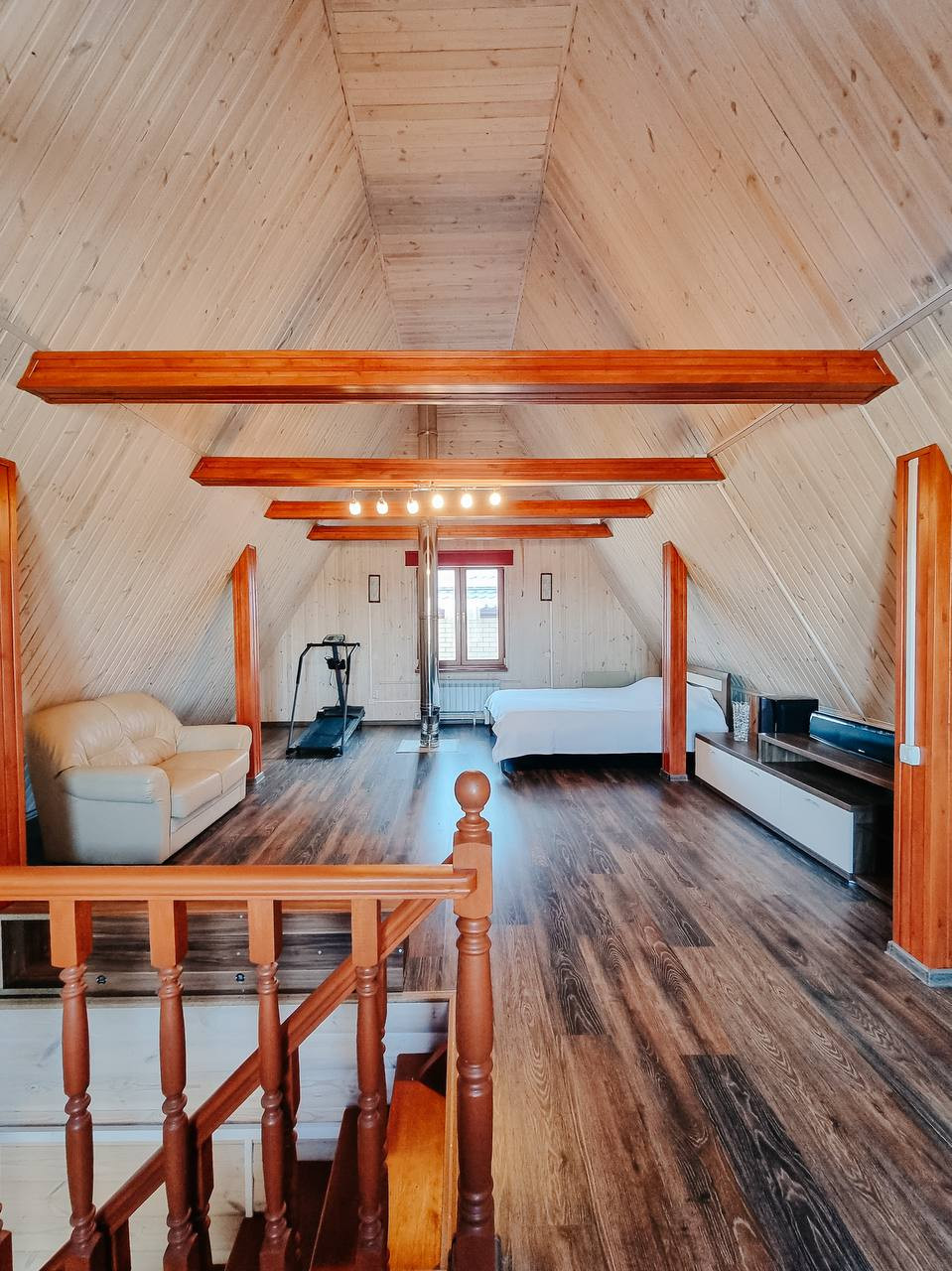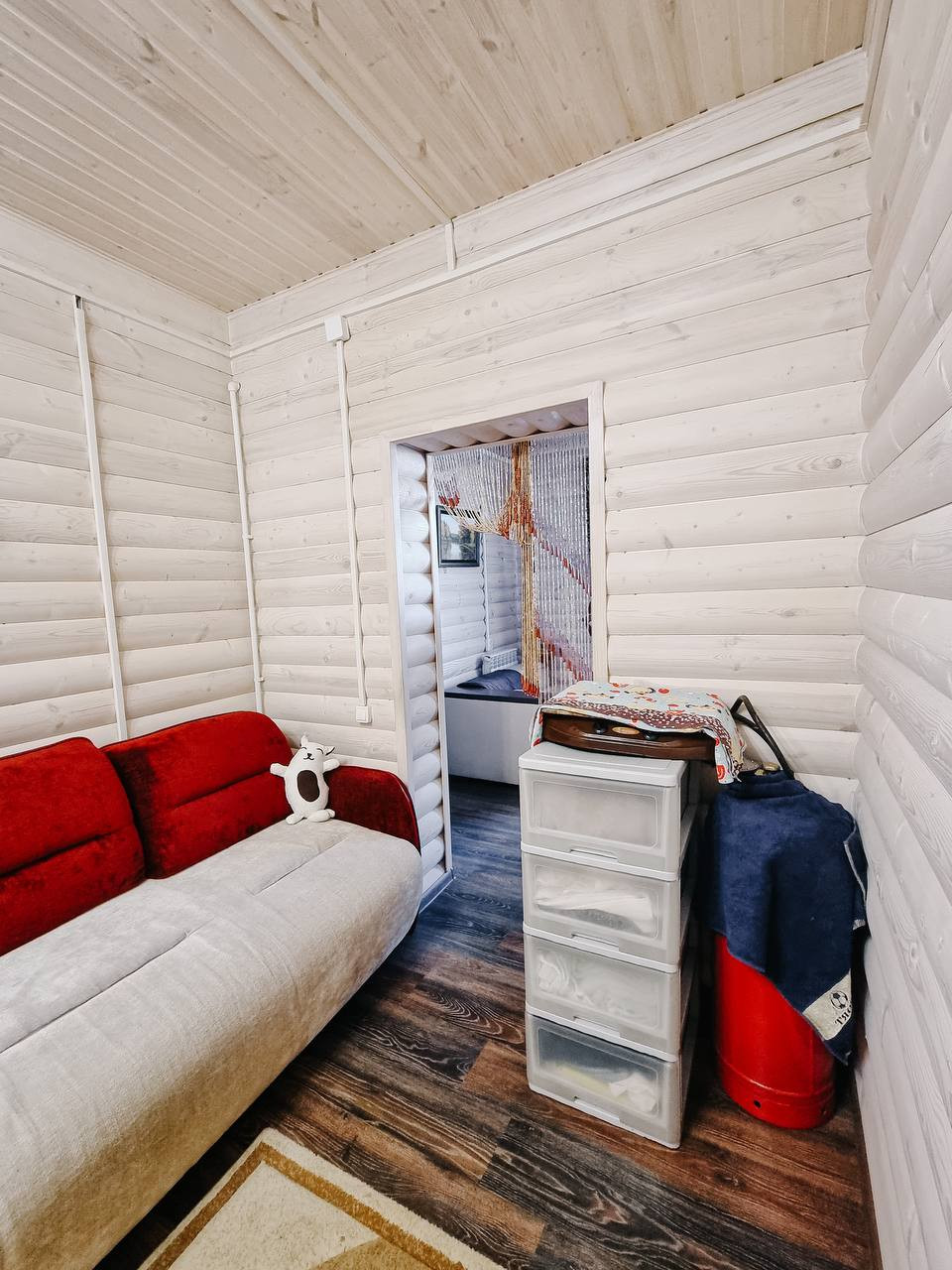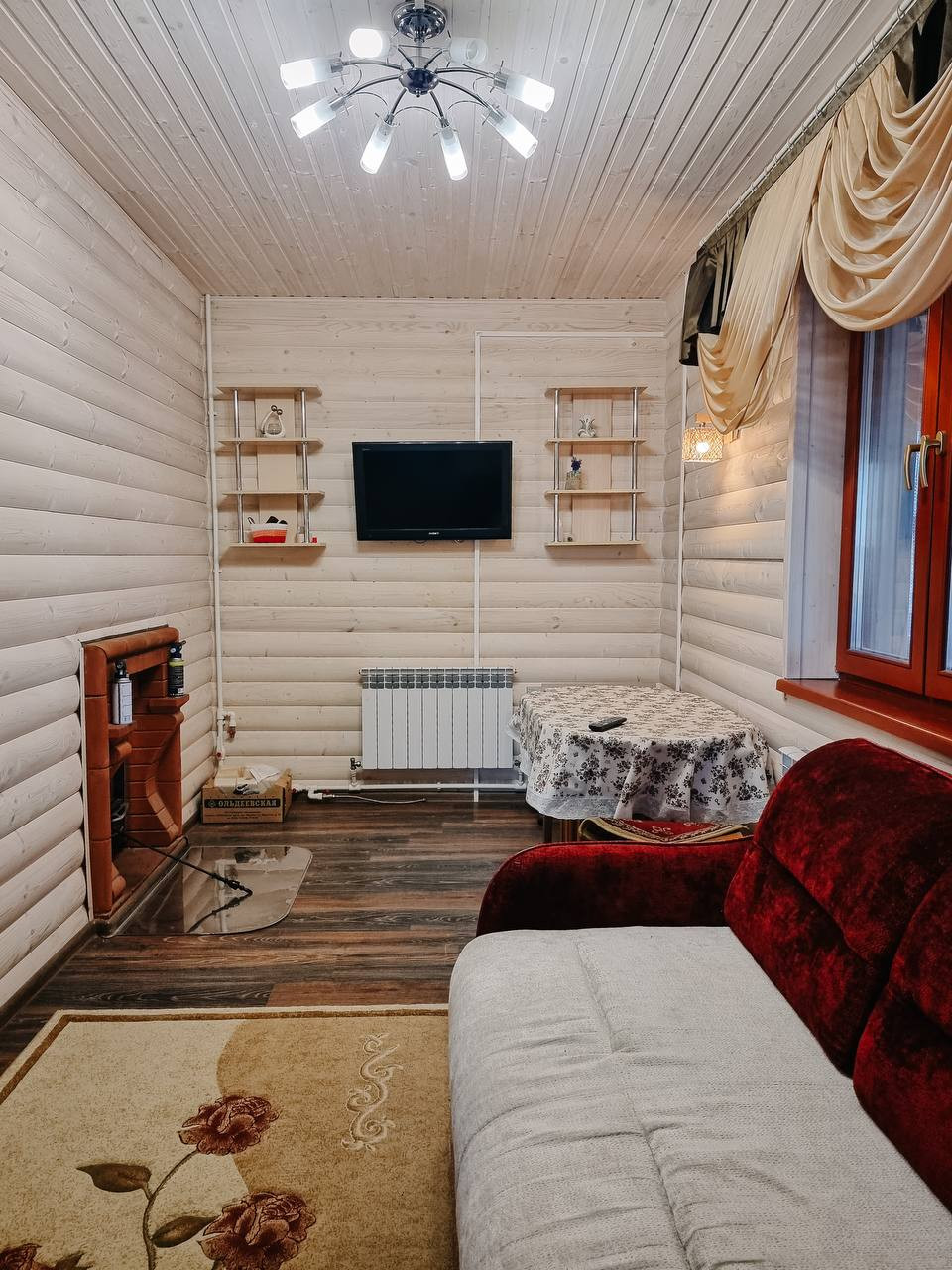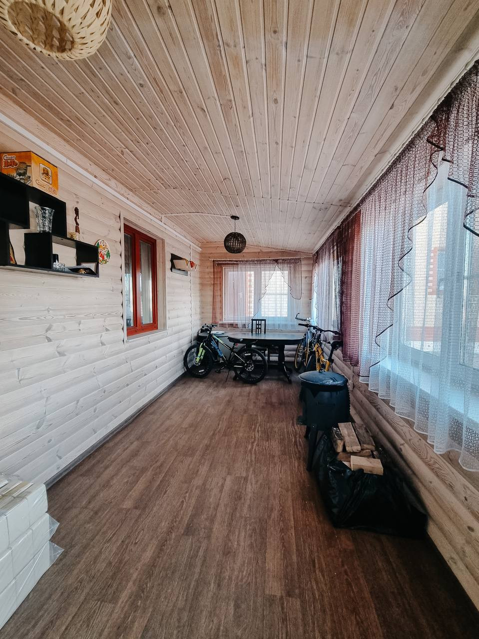 Баня – 6 на 9 метров в 2 этажа из бруса. Газовое отопление. Окна в бане деревянные (двойной стеклопакет). Внутри баня общата блокхаусом и покрыт белой краской (видна фактура дерева), в бане есть кухонный гарнитур, спальня на 2ом этаже. Так же есть холодная веранда.