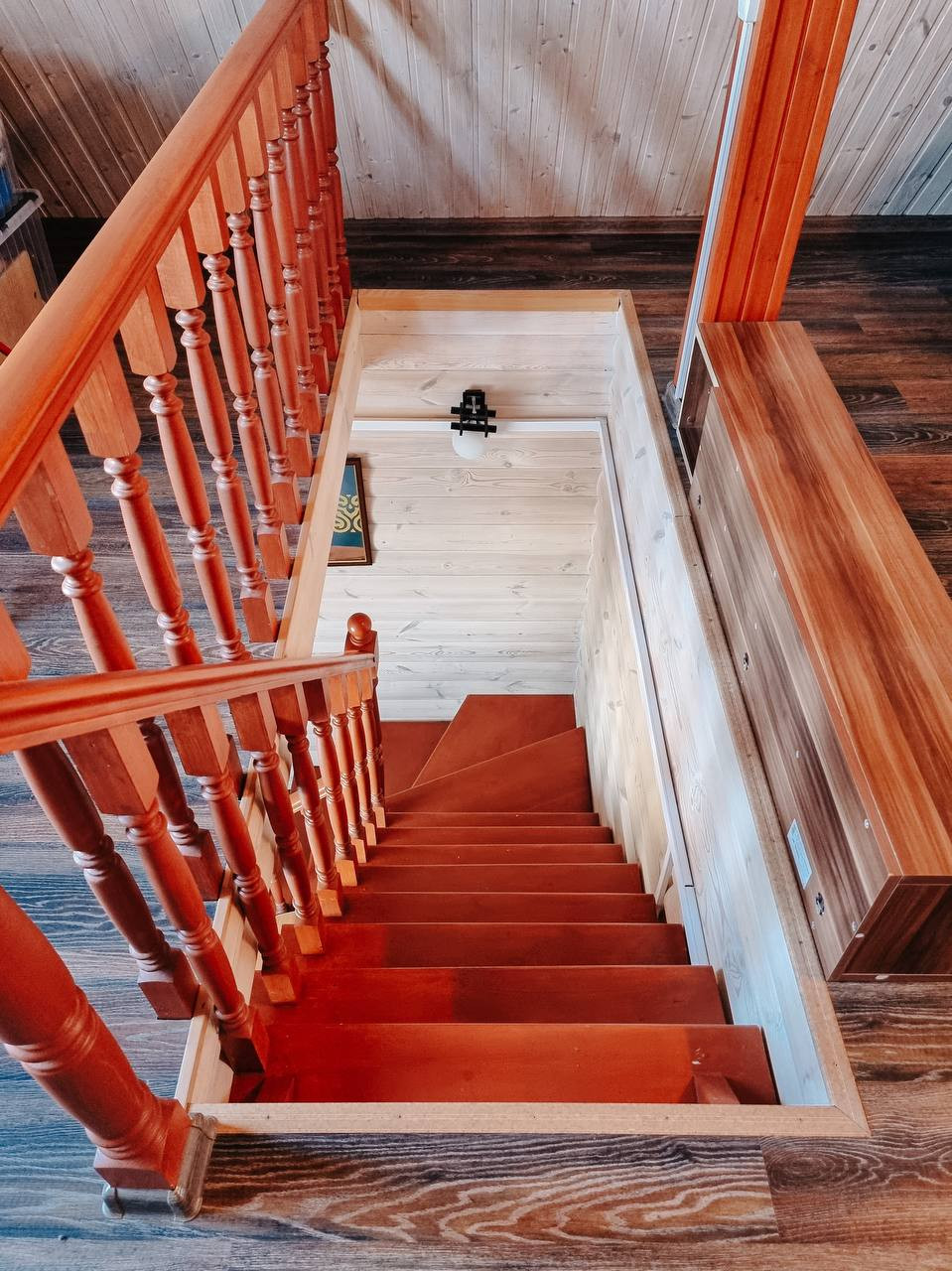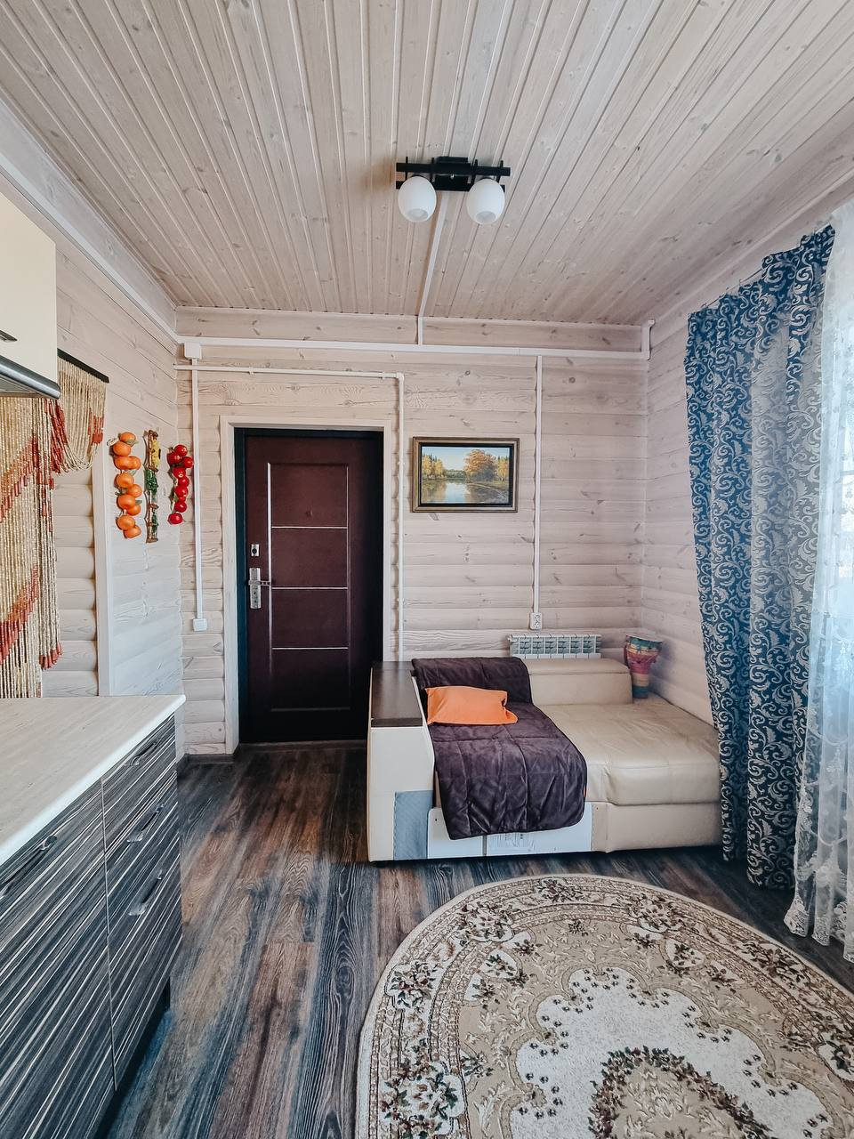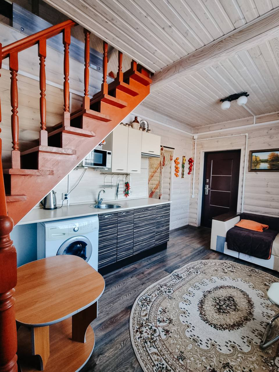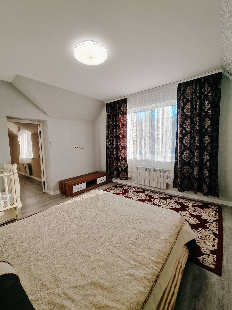 Баня – 6 на 9 метров в 2 этажа из бруса. Газовое отопление. Окна в бане деревянные (двойной стеклопакет). Внутри баня общата блокхаусом и покрыт белой краской (видна фактура дерева), в бане есть кухонный гарнитур, спальня на 2ом этаже. Так же есть холодная веранда.