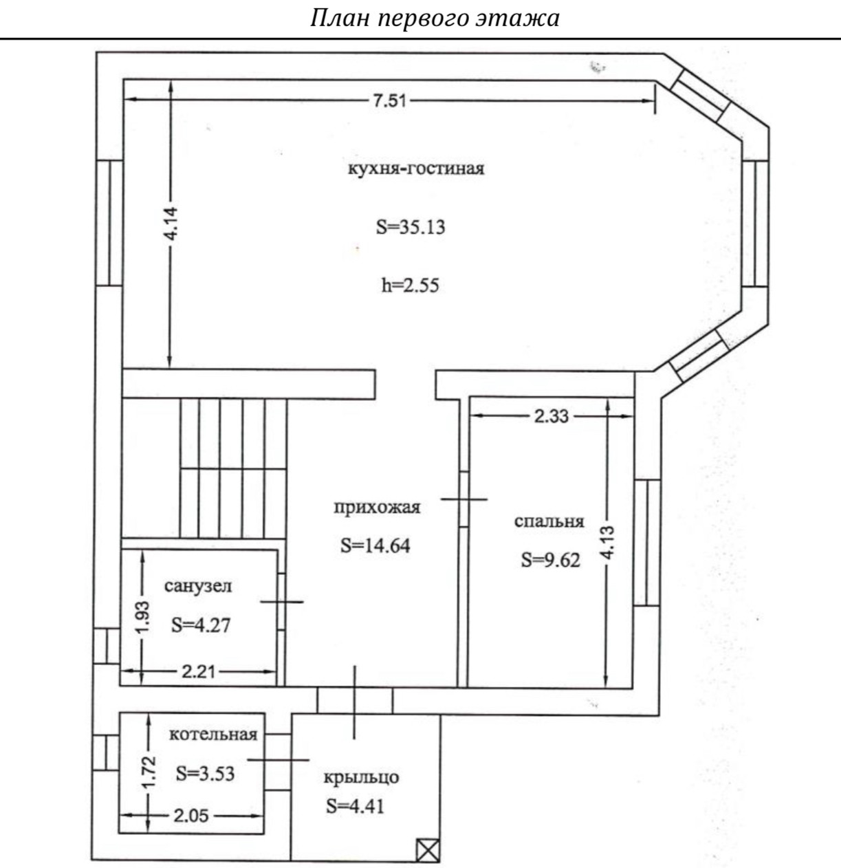 Первый этаж: кухня-гостинная 35 м2, холл 14,5 м2, гостевая комната (кабинет) 10 м2, с/у 4,5 м2, бойлерная 3,5 м2.