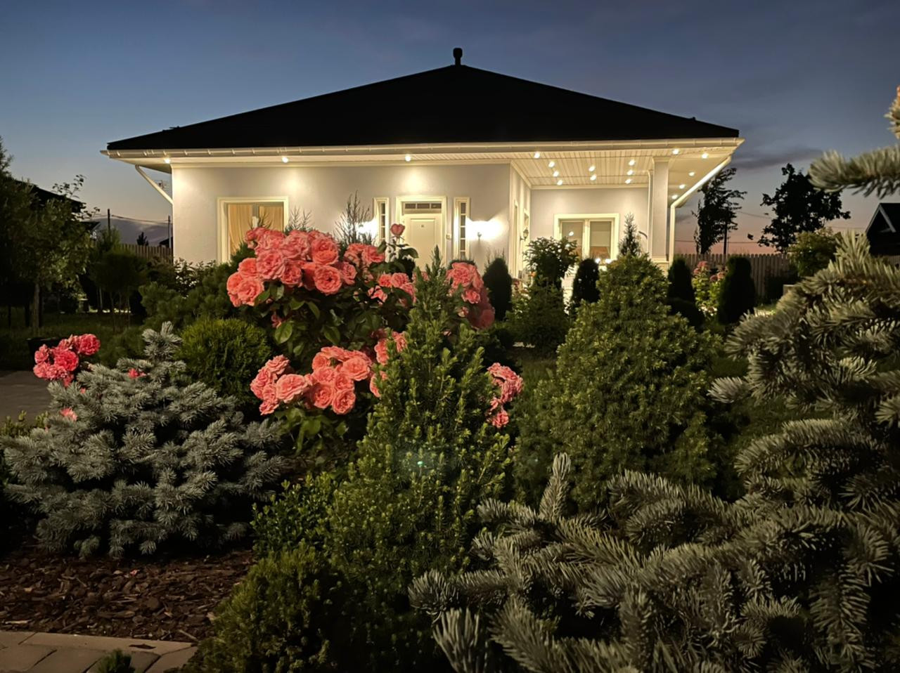 - забор из двойного штакетника, кирпичные столбы с подстветкой