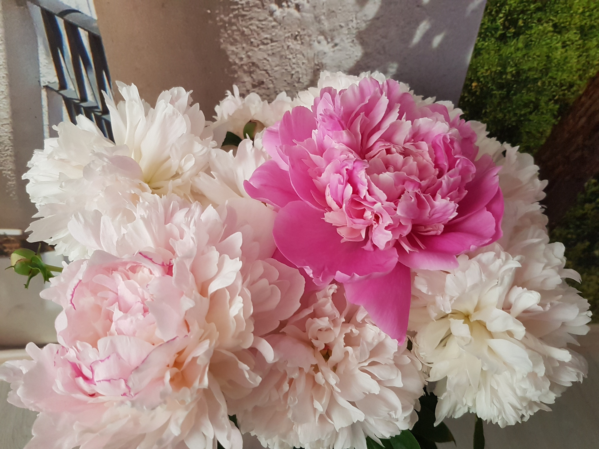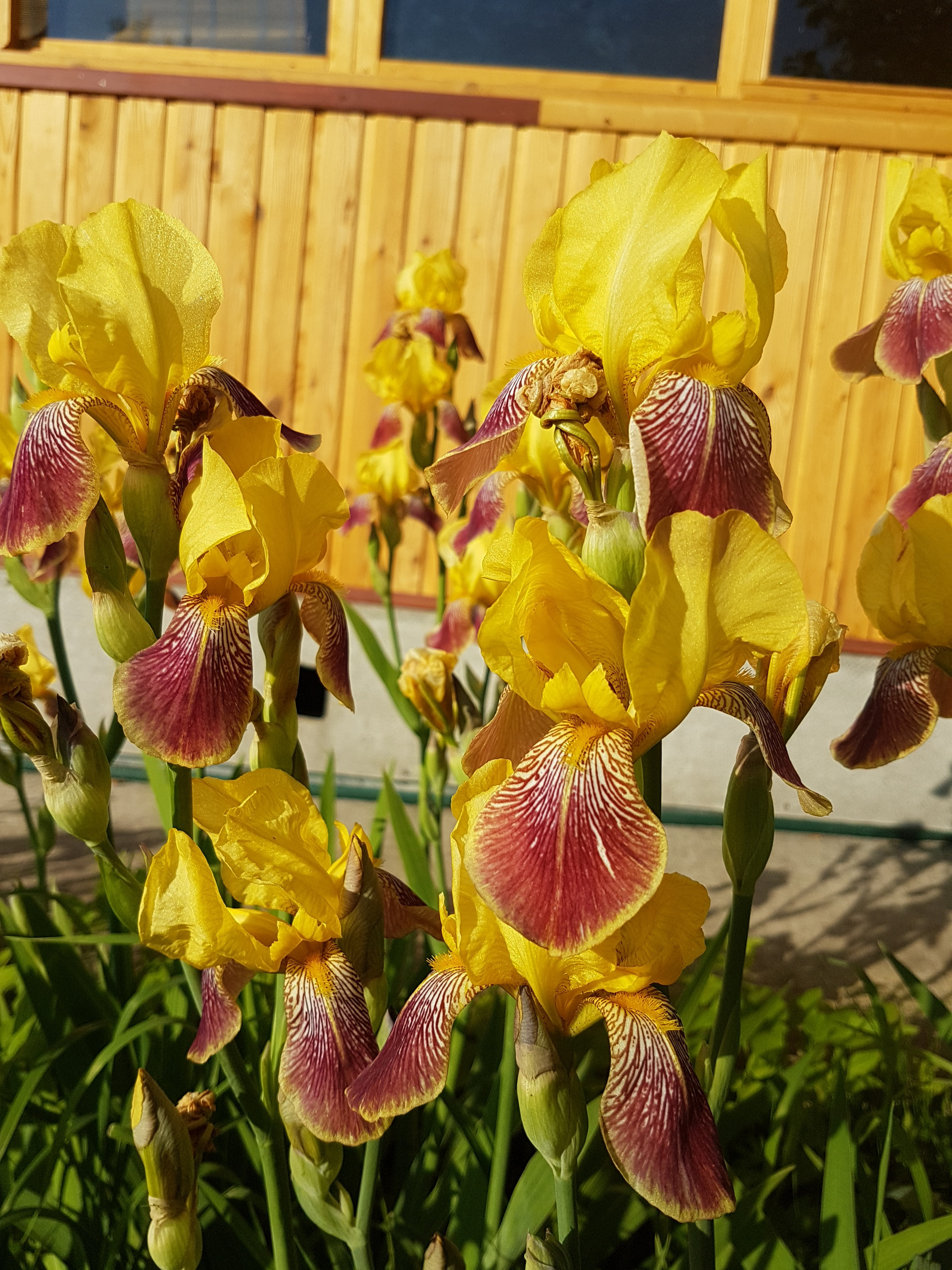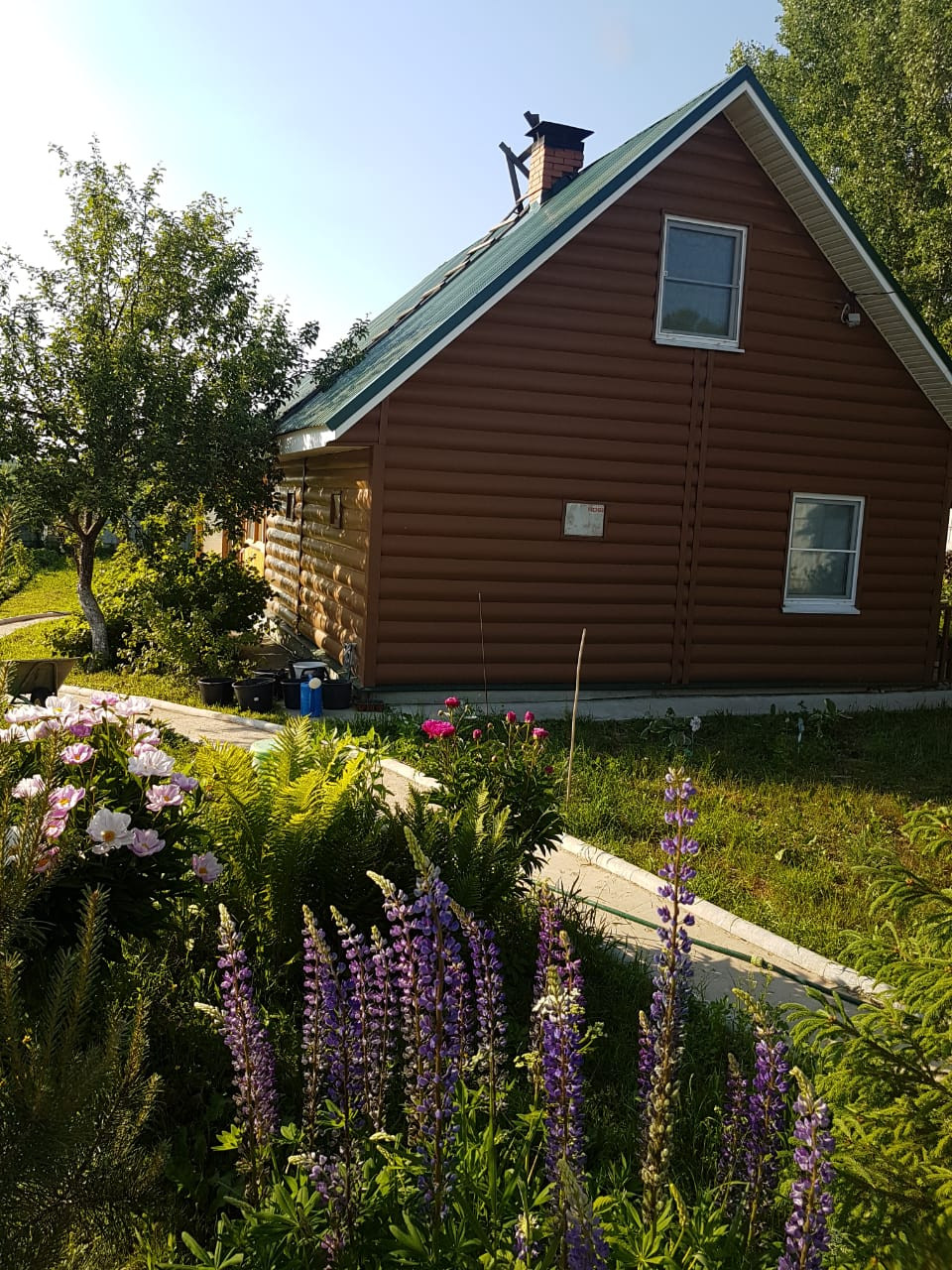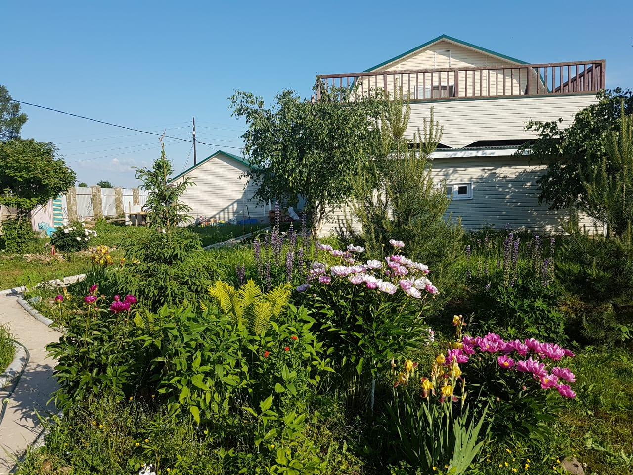 розы, пионы, ирисы, гвоздики, флоксы, люпины. Летом очень красиво,