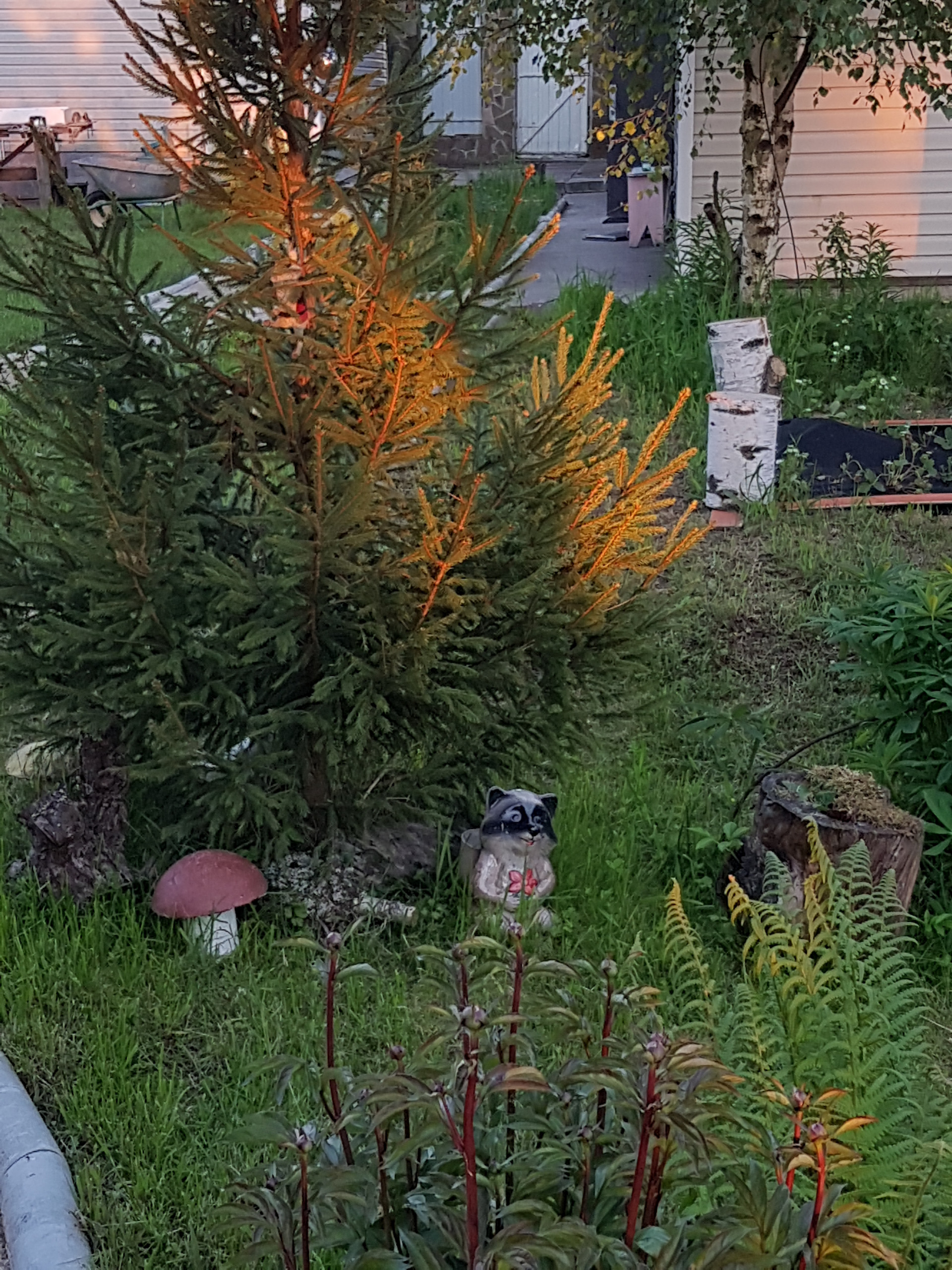крыжовник, малина, ежевика, клубника. Растут хвойные деревья,