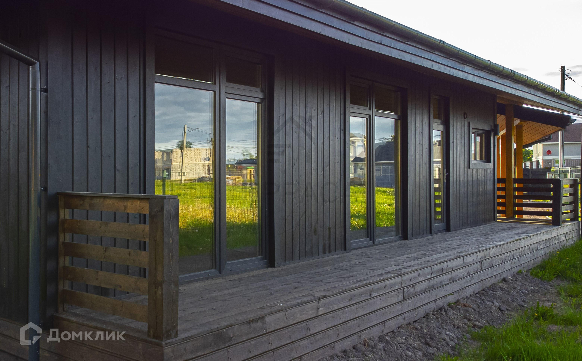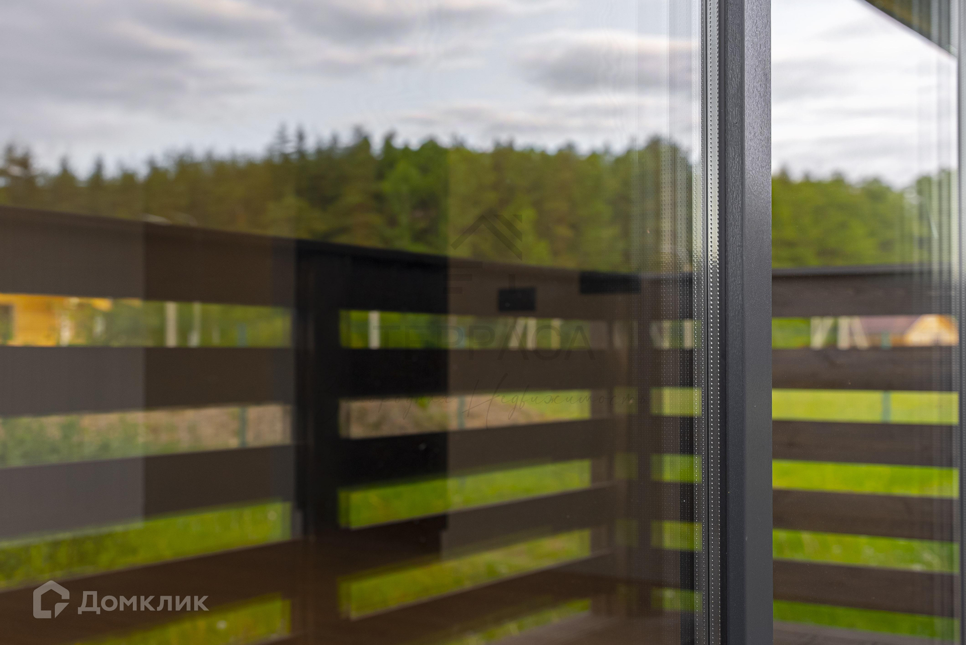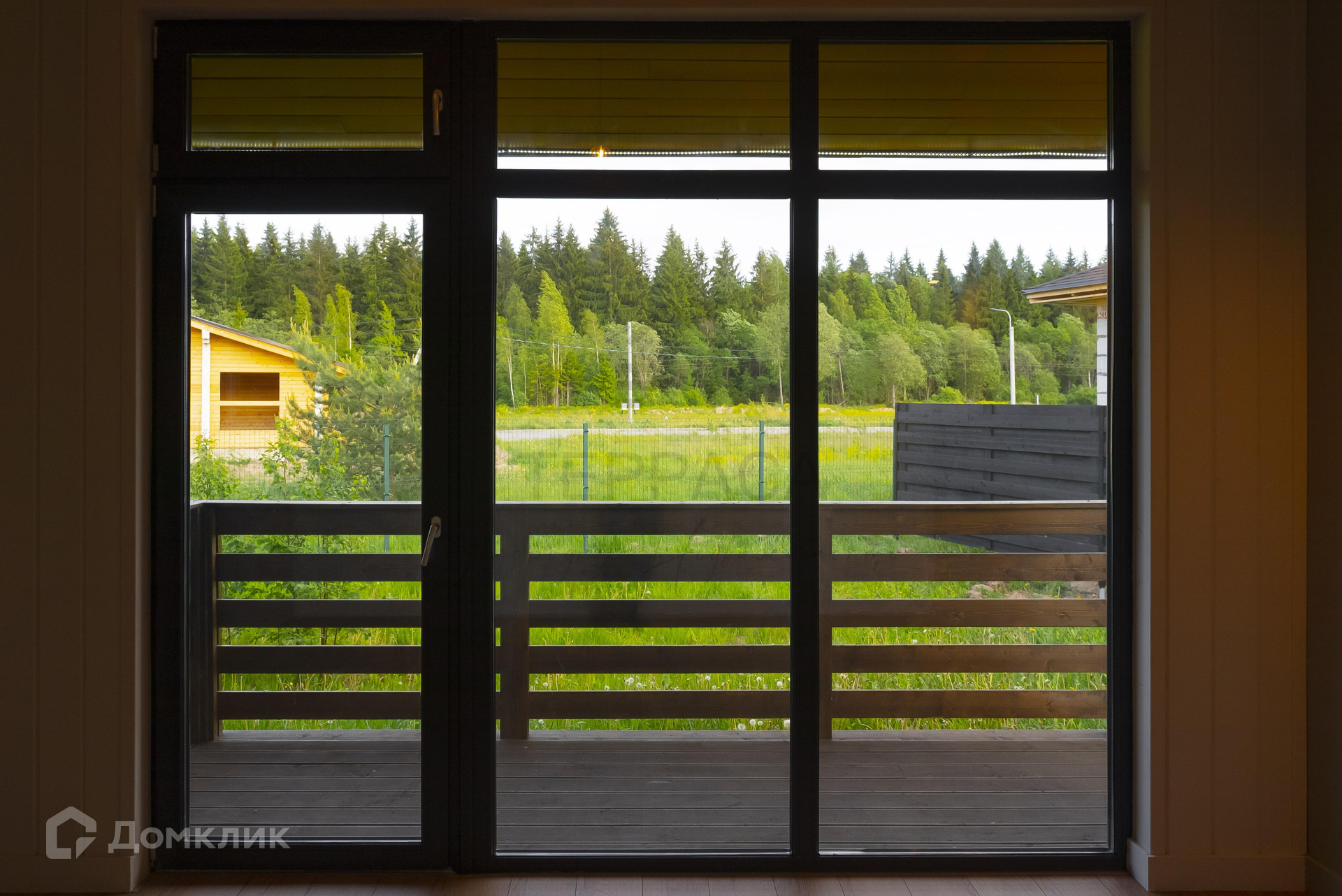 Окна и двери – 2-х камерные панорамные стеклопакеты с видами на лес. Установлен морозостойкий профиль «VEKA» с ламинацией. На входе стильная дверь с большой площадью остекления