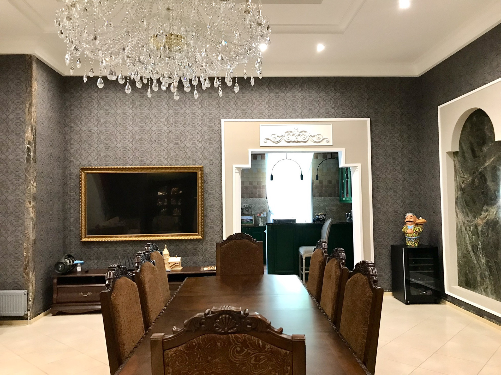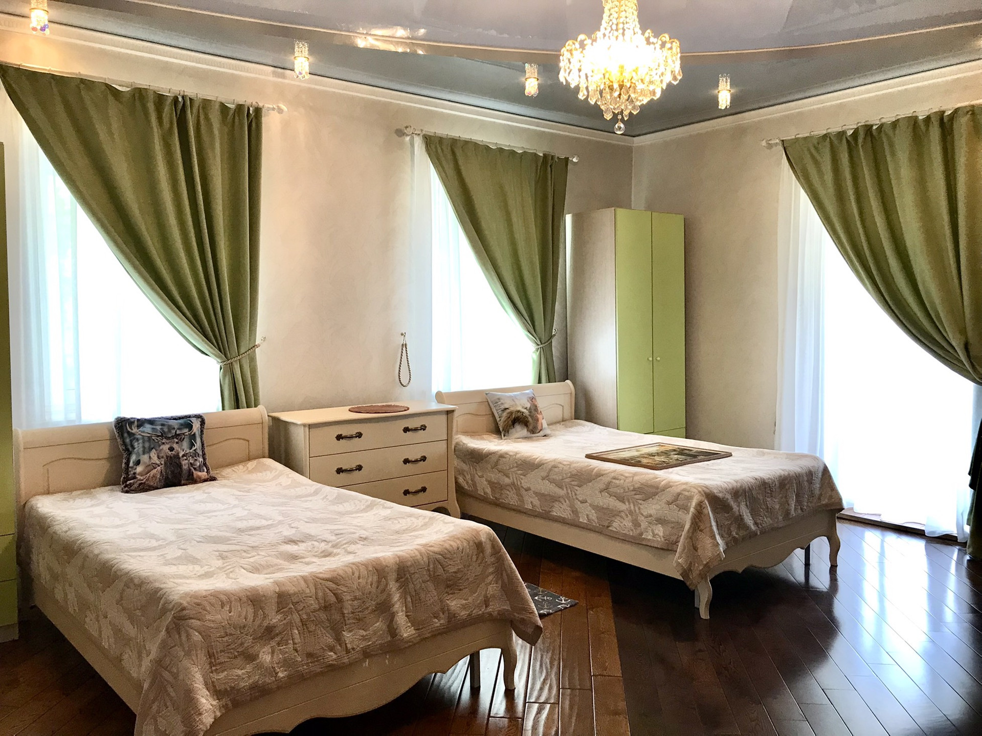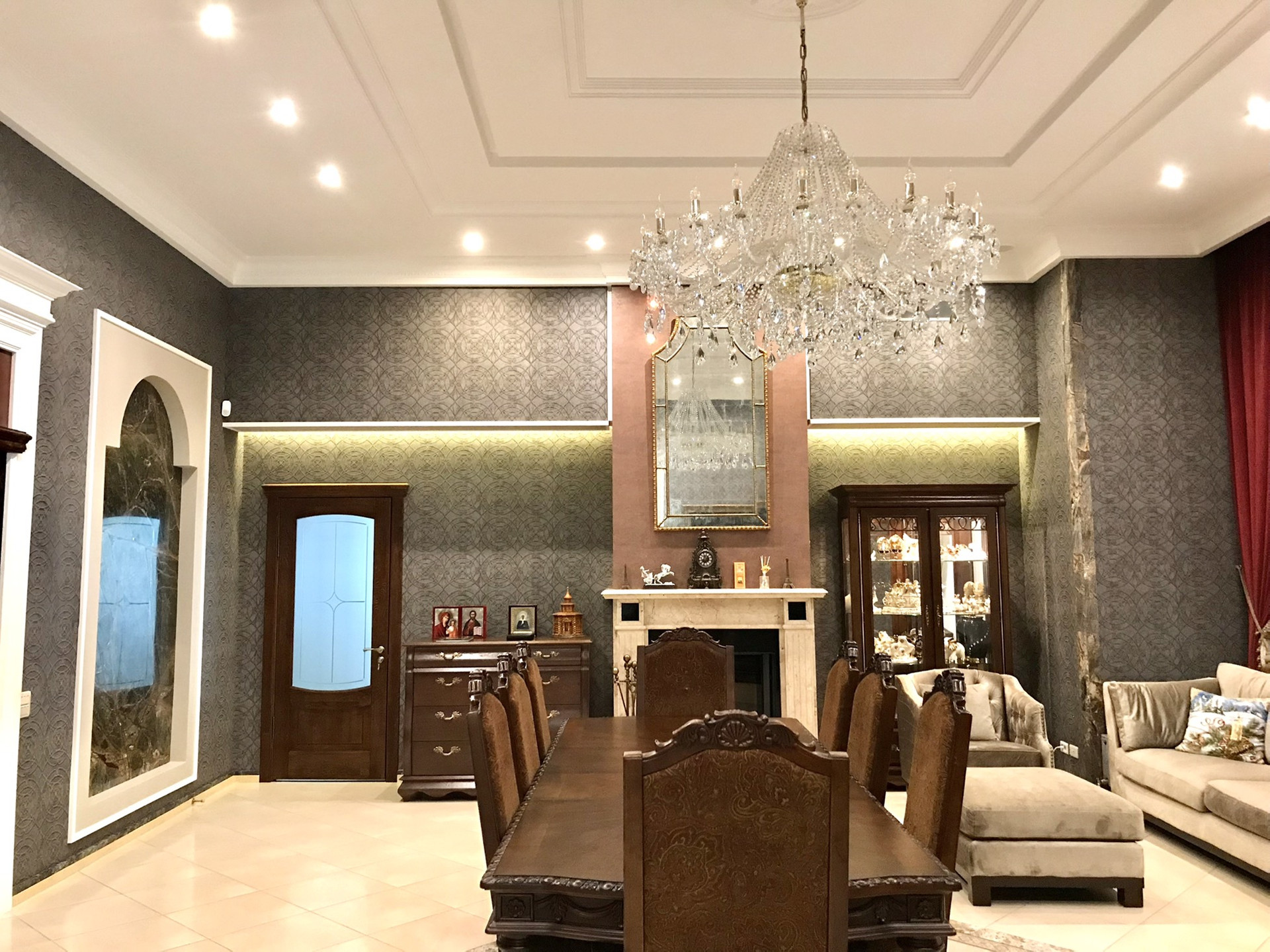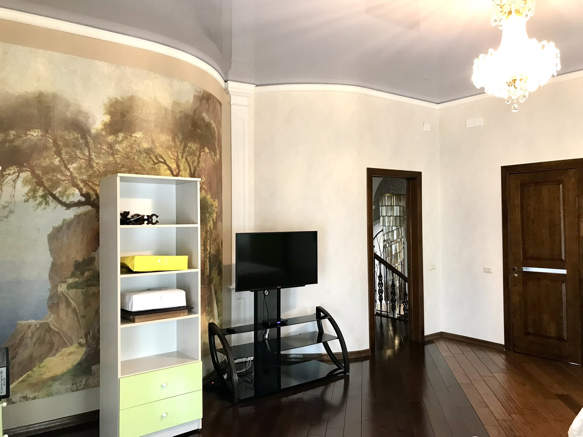 В доме выполнен дорогой качественный ремонт, вся мебель изготовлена на заказ, дизайнерские люстры, стеклянные витражи, на стенах выполнена фреска, финская сантехника. Полы на первом, втором и третьем этажах комбинированные: итальянская плитка и паркетная доска, установлен подогрев полов.