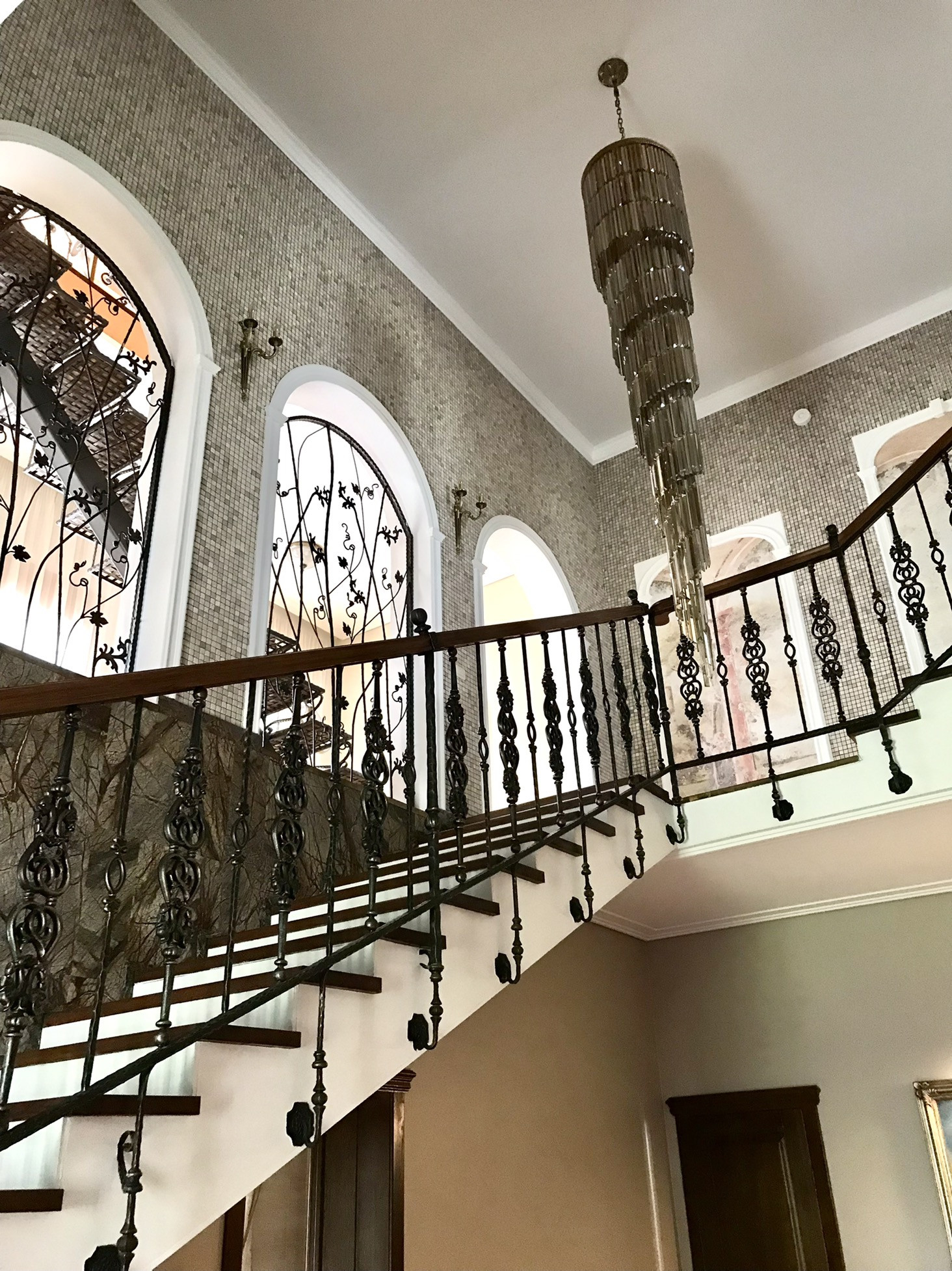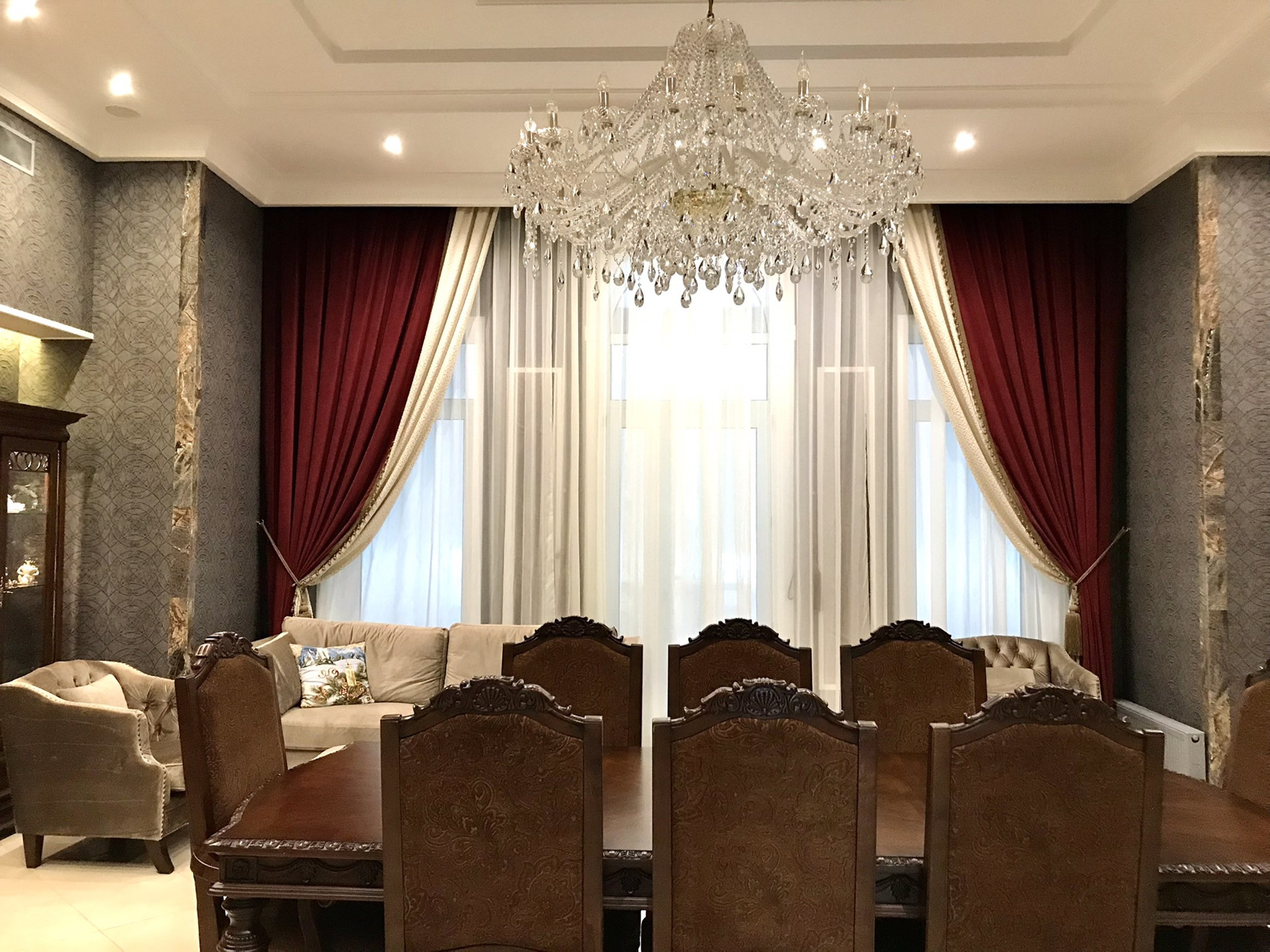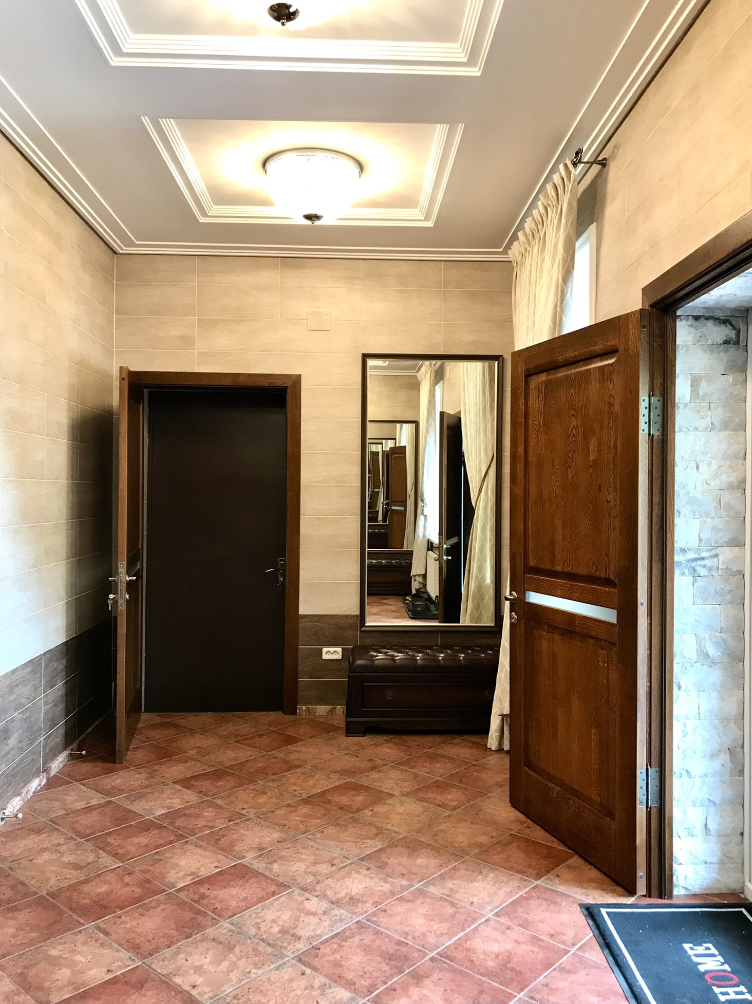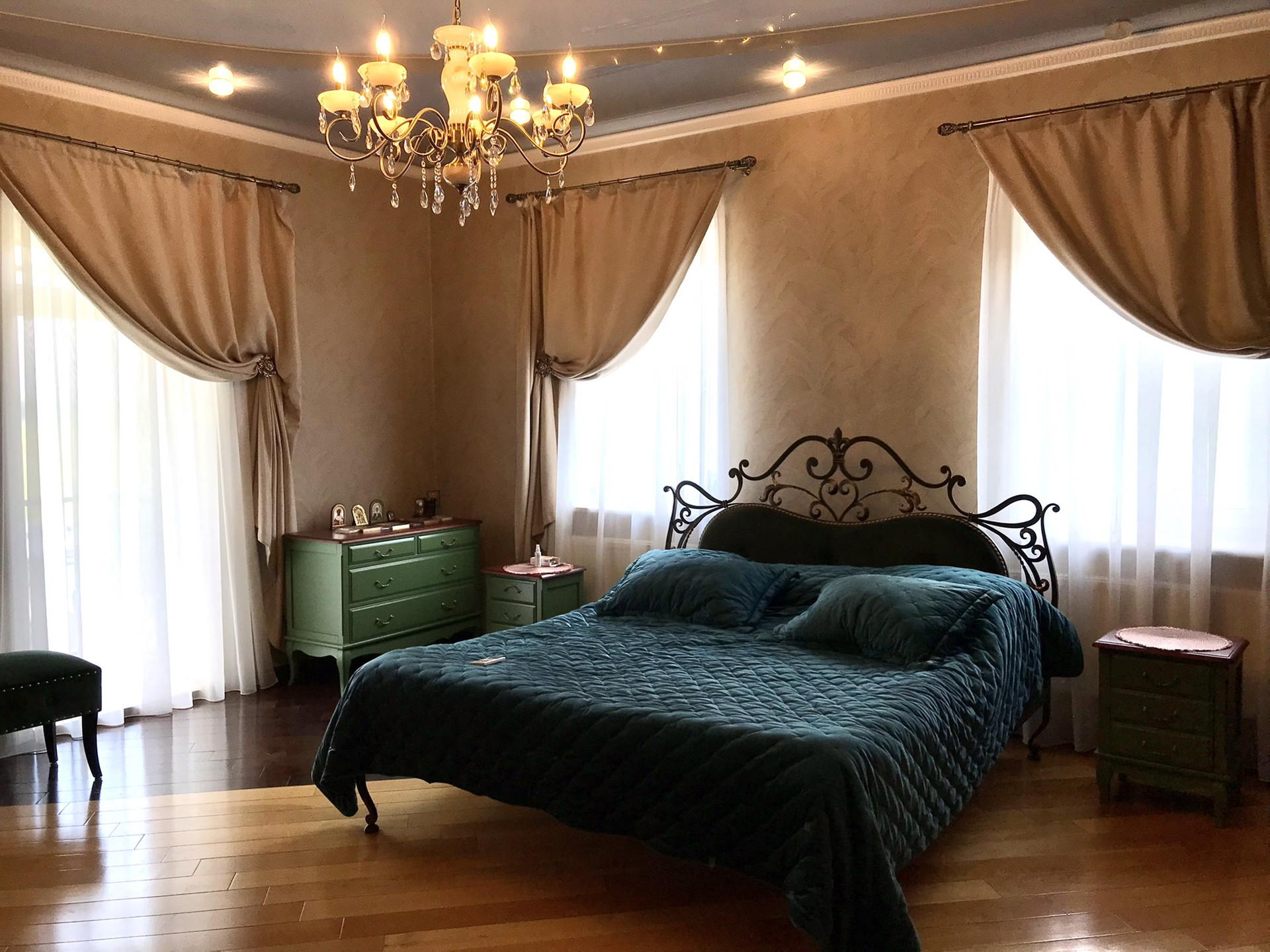 В доме выполнен дорогой качественный ремонт, вся мебель изготовлена на заказ, дизайнерские люстры, стеклянные витражи, на стенах выполнена фреска, финская сантехника. Полы на первом, втором и третьем этажах комбинированные: итальянская плитка и паркетная доска, установлен подогрев полов.