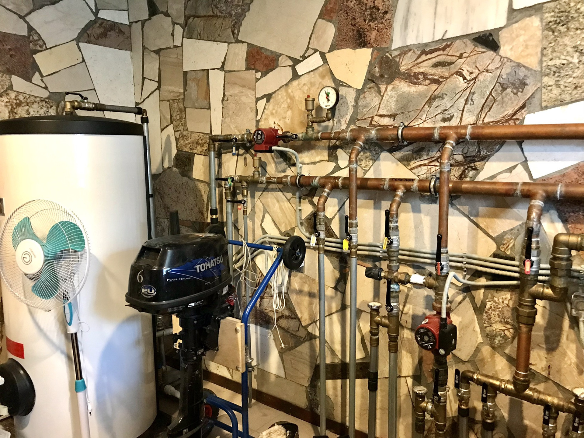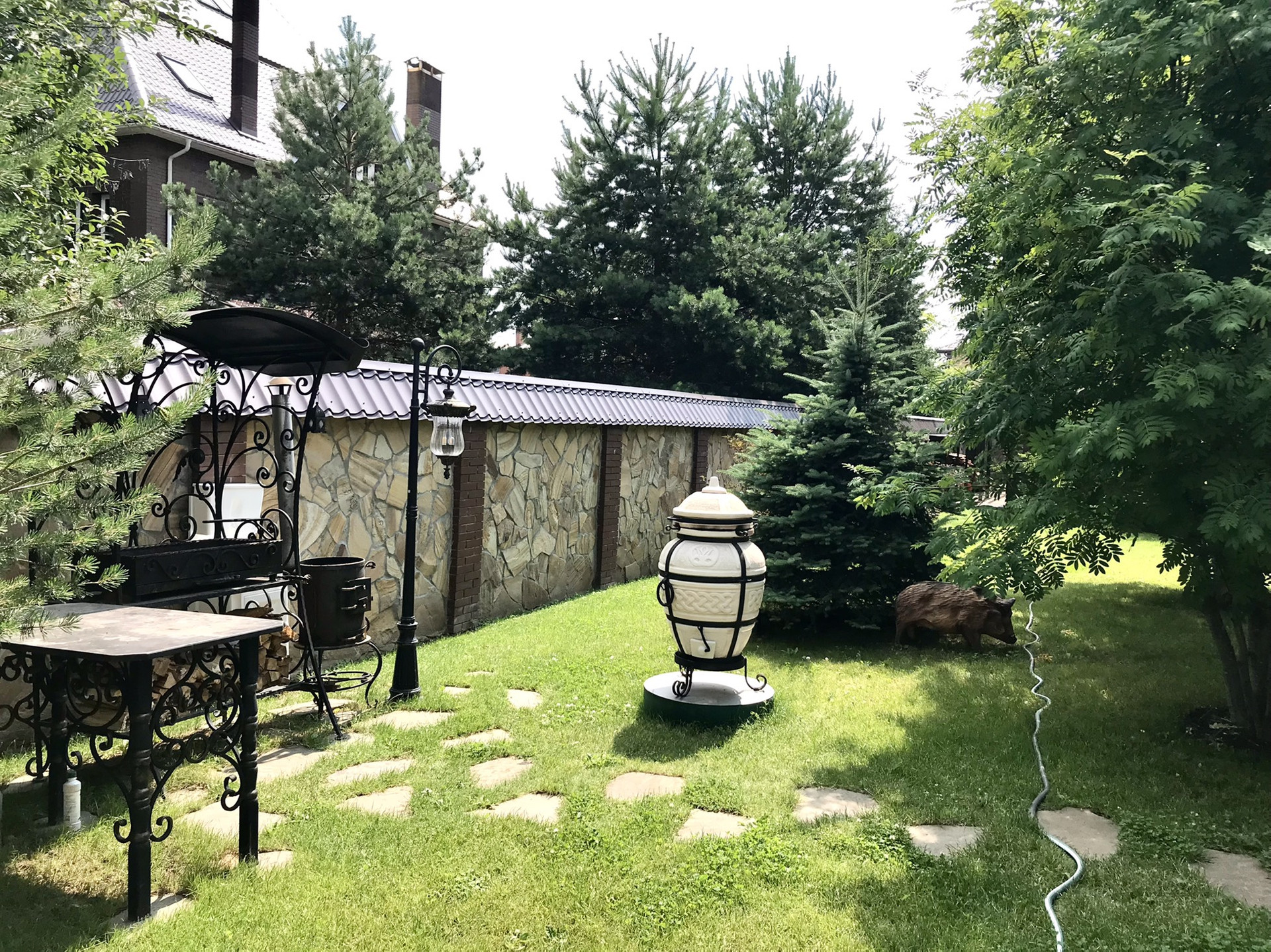 Центральные коммуникации разведены по дому (газ, электричество (30 кВт), вода с артезианскай скважиной, два септика на дом и гараж, Интернет, кабельное телевидение). Установлена система очистки воды, стабилизатор напряжения и доп.станция в случае отключения света. Территория участка и дома охраняются и установлена сигнализация. На участке 3 дополнительных постройки: двухэтажный гараж ( под гаражом находится погреб с зоной хранения) на две машины 150 метров с автоматизированным открыванием ворот, Беседка 10 метров, крытый бассейн с сауной 110 метров, оборудована зона барбекю.