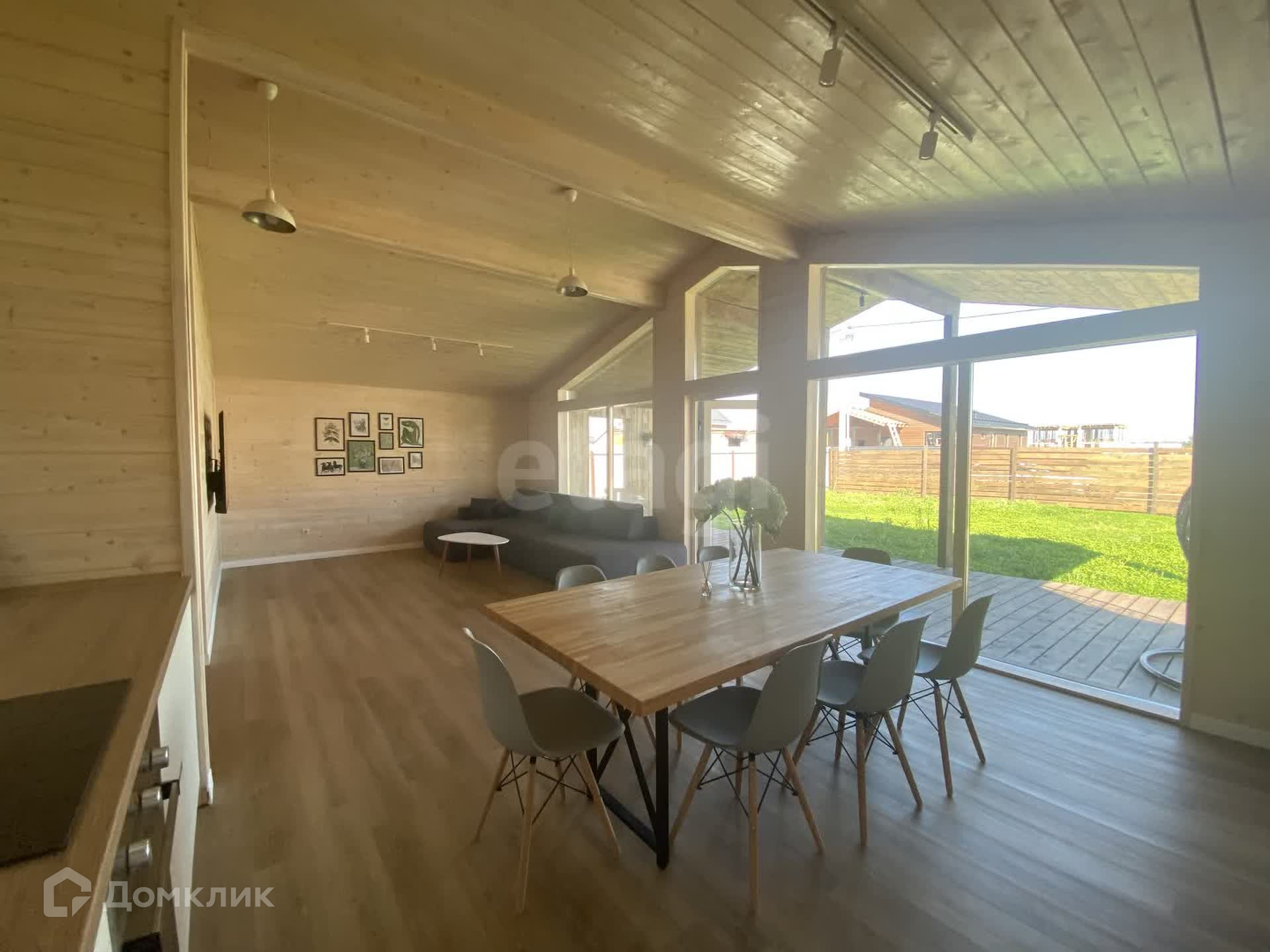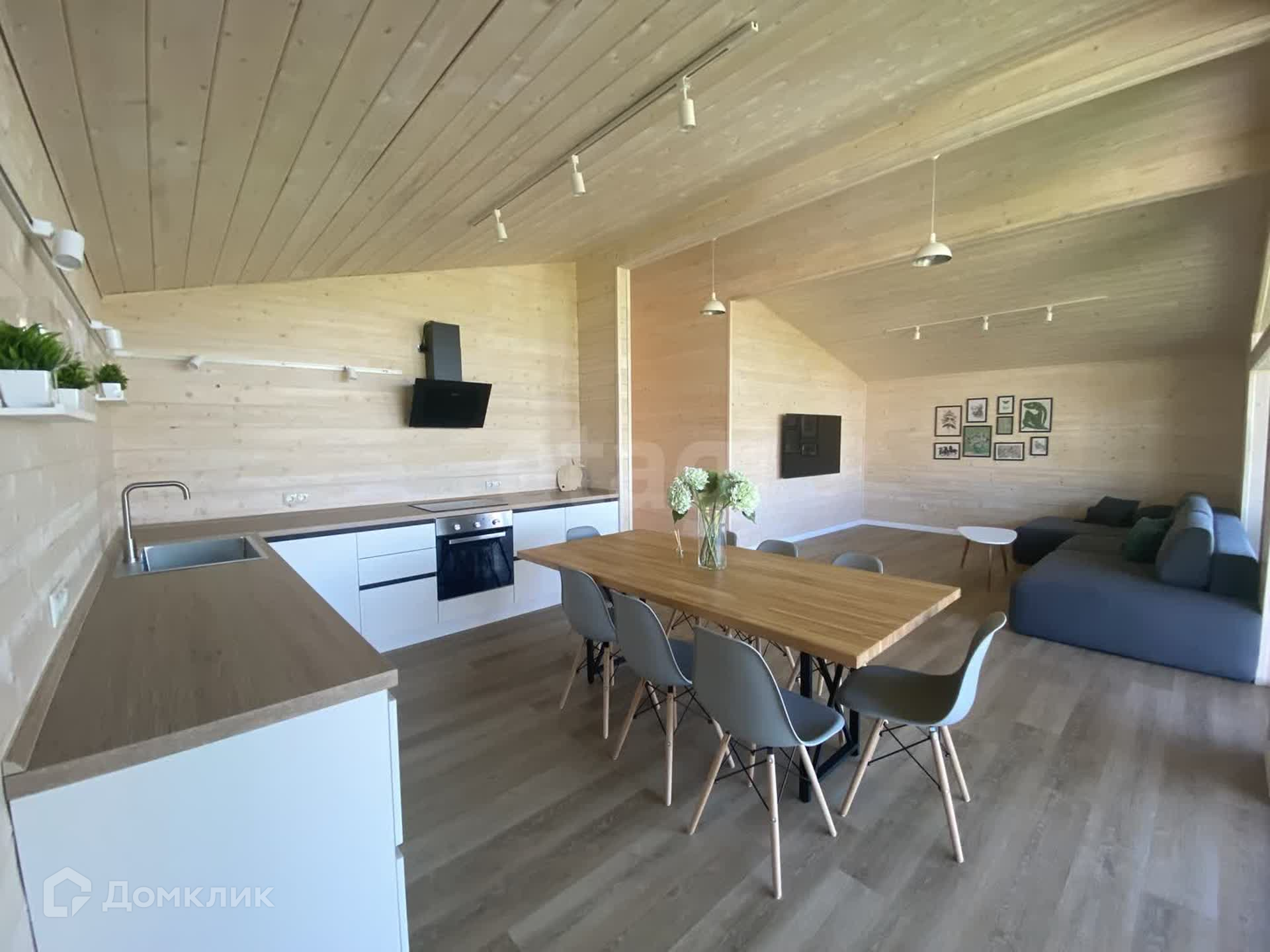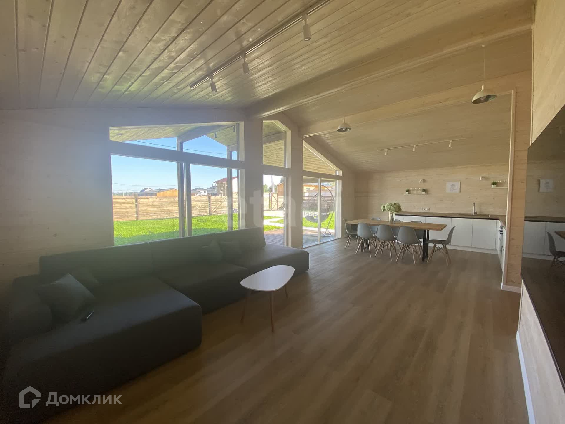 На участке есть отдельное помещение площадью 7 кв.м для бойлера, электрокотла и стиральной машины. Кухня-гостиная с панорамными окнами и выходом на участок площадью 40 кв.м.