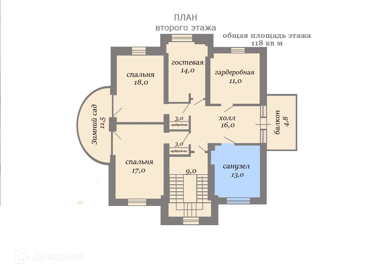 ВТОРОЙ ЭТАЖ - 118 м2: просторный холл с выходом на балкон, 2 комнаты, каждая из которых имеет свой выход в зимний сад, третья комната поменьше, большая ванная комната с джакузи и душевой. Еще одна гардеробная комната 13 м2, оснащенная стиральной и сушильной машинами. Все комнаты оборудованы кондиционерами.