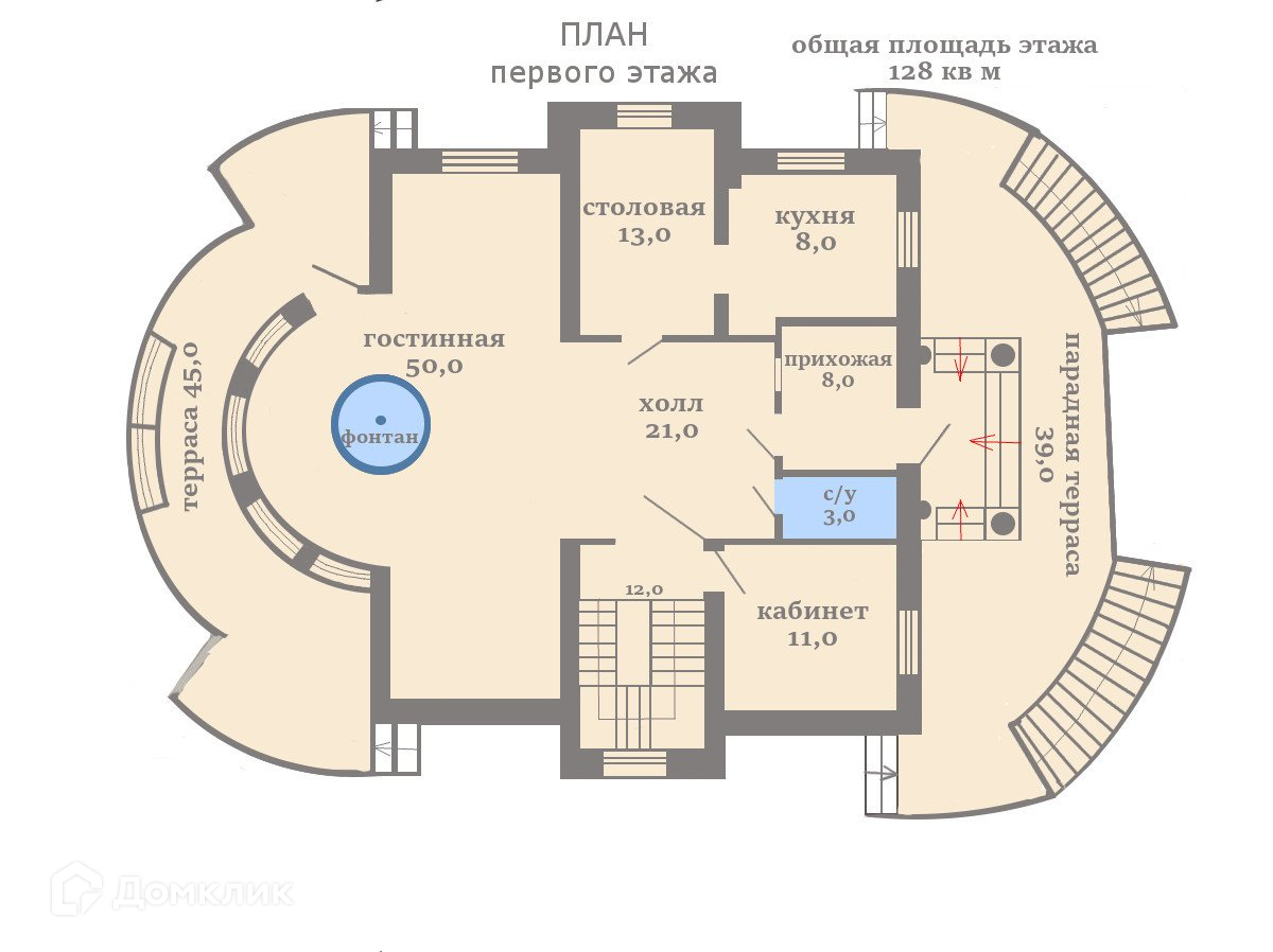 ПЕРВЫЙ ЭТАЖ - 128 кв м, прихожая, гардеробная, просторная и уютная гостиная с фонтаном с панорамными окнами в сад, каминная комната с музыкальным центром и ТV, кабинет, кухня-столовая и санузел.