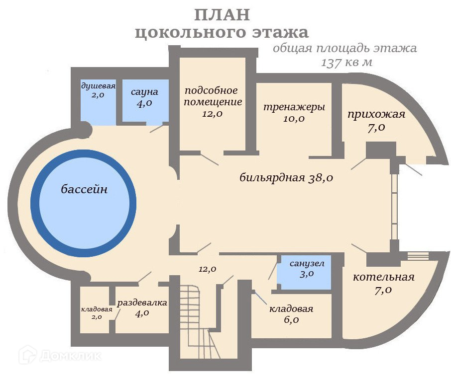ЦОКОЛЬНЫЙ ЭТАЖ: площадь 137 м2: прихожая, бассейн с сауной, гардеробная, бильярдная, зал для спорта, санузел.