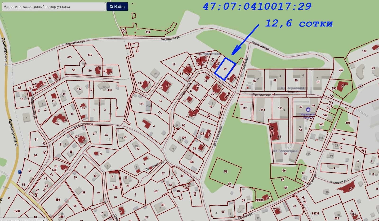 Кадастровый номер участка: 47:07:0410017:29. Координаты для навигатора: 60.121773, 30.274623. Адрес участка: д. Юкки, ул. Строителей, 15.