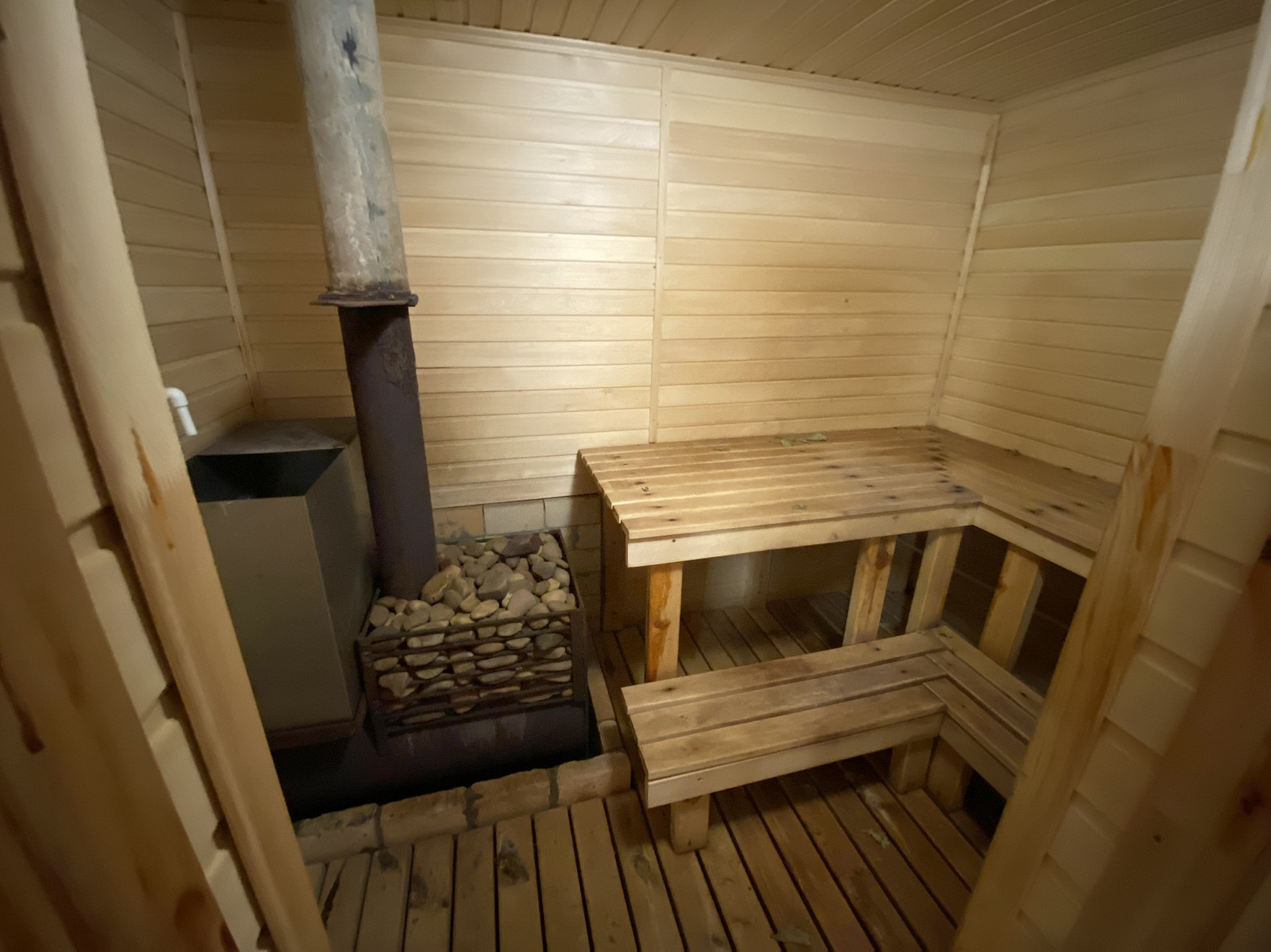 На участке стоит баня с комнатой отдыха, металлический гараж. Имеются насаждения фруктовых деревьев.
