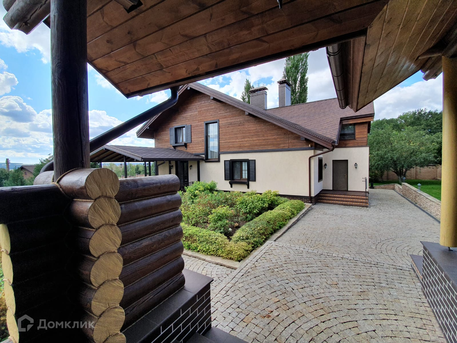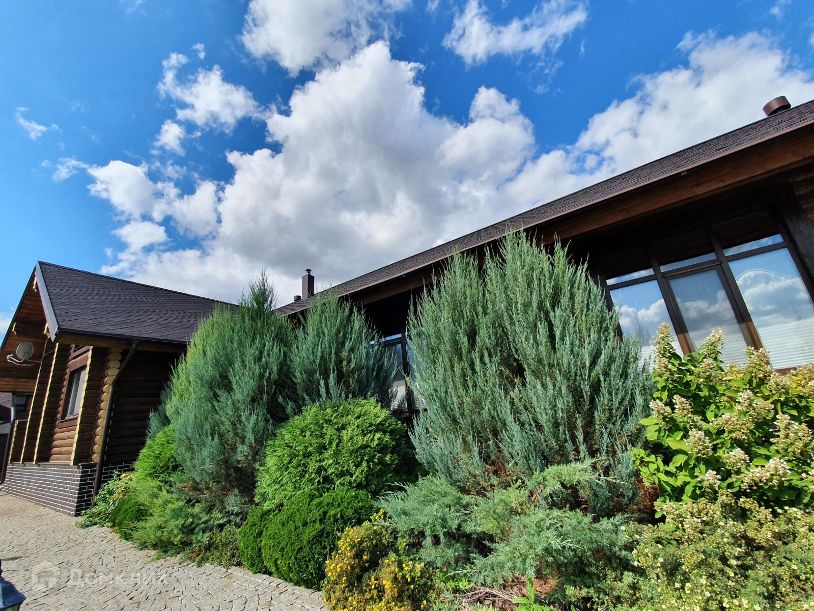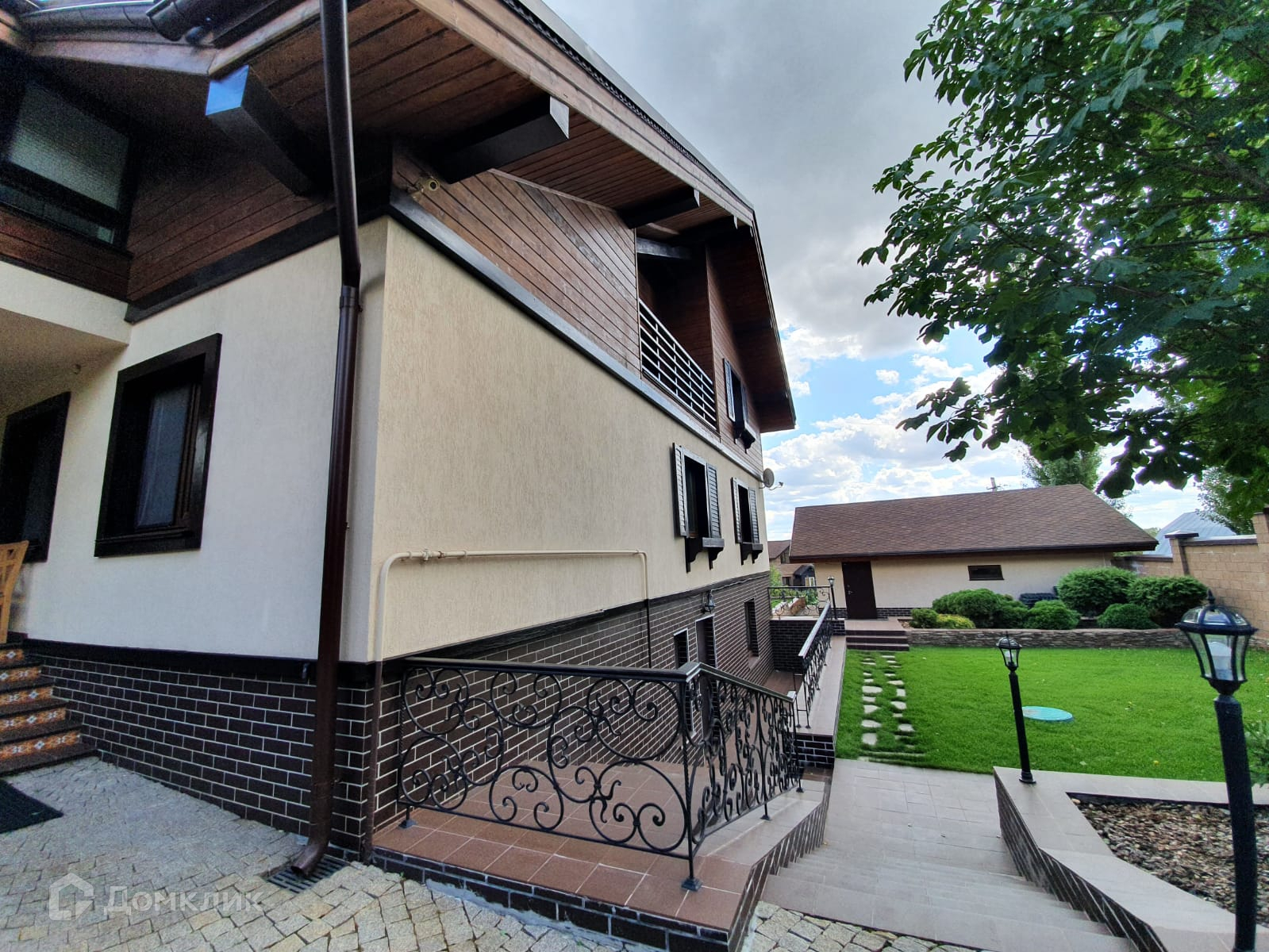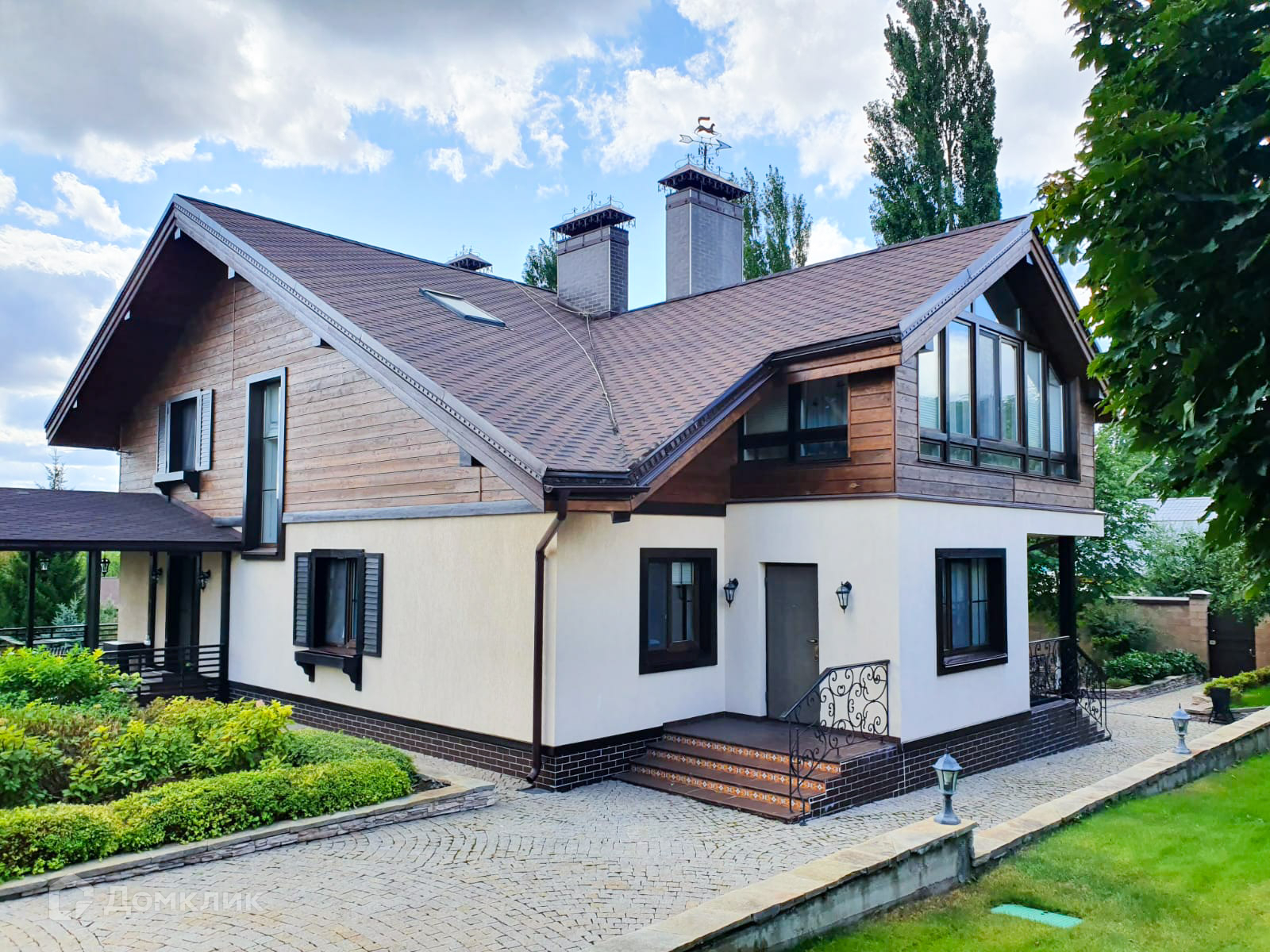 Красивый дизайн дома, вокруг дома и дорожки выложены брусчаткой, забор по периметру.