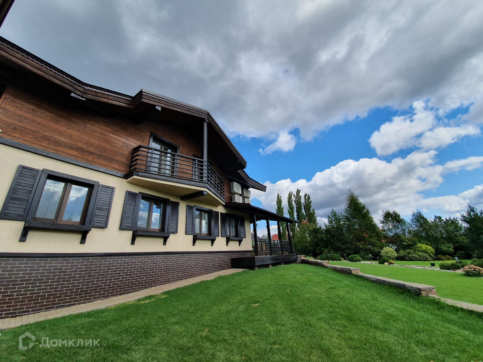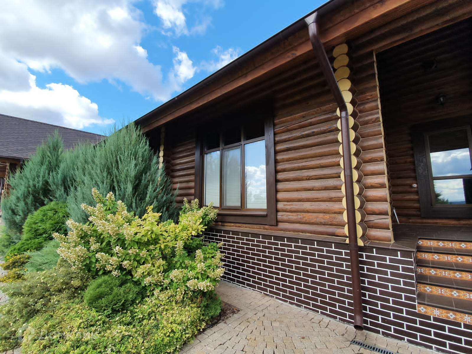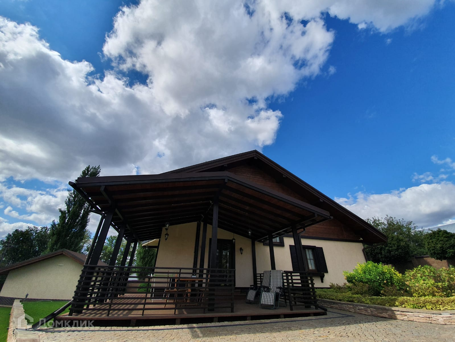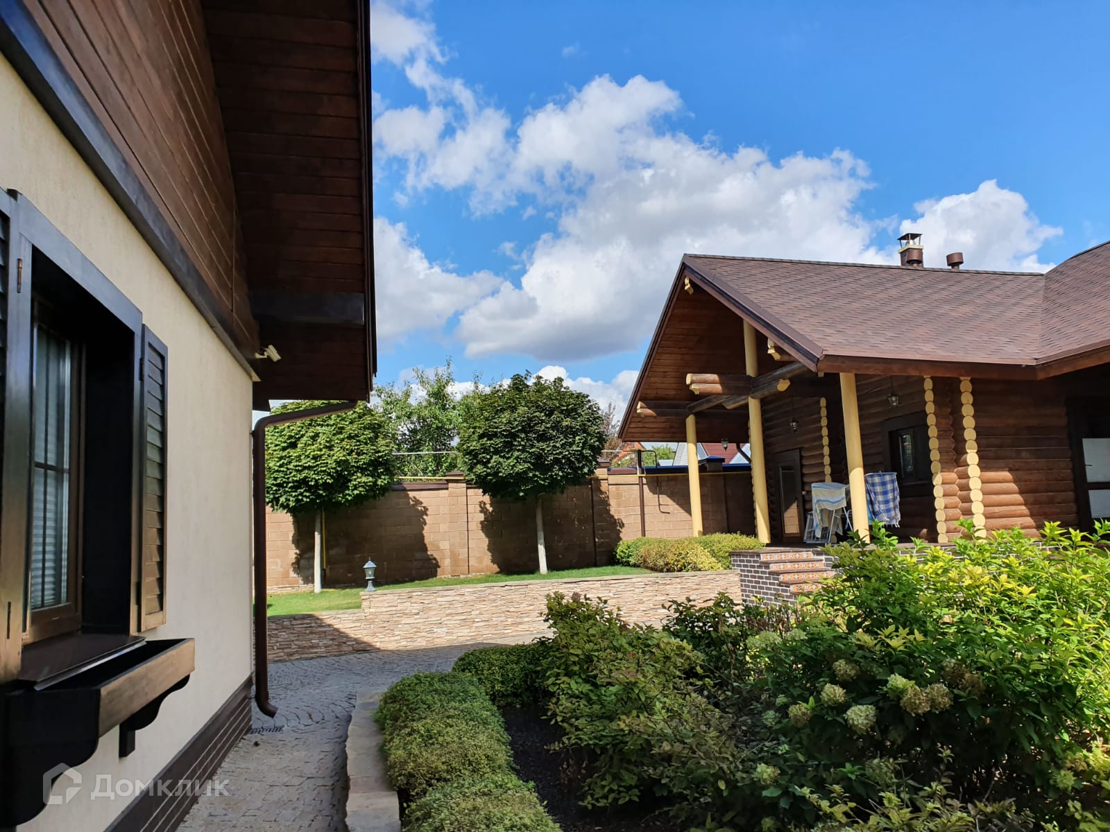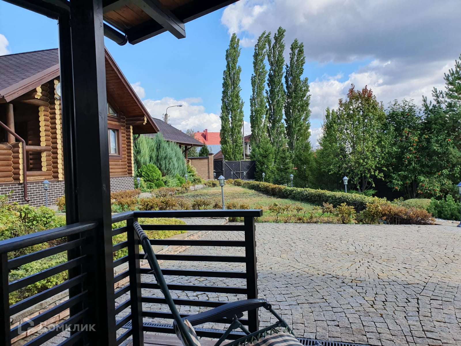 Красивый дизайн дома, вокруг дома и дорожки выложены брусчаткой, забор по периметру.