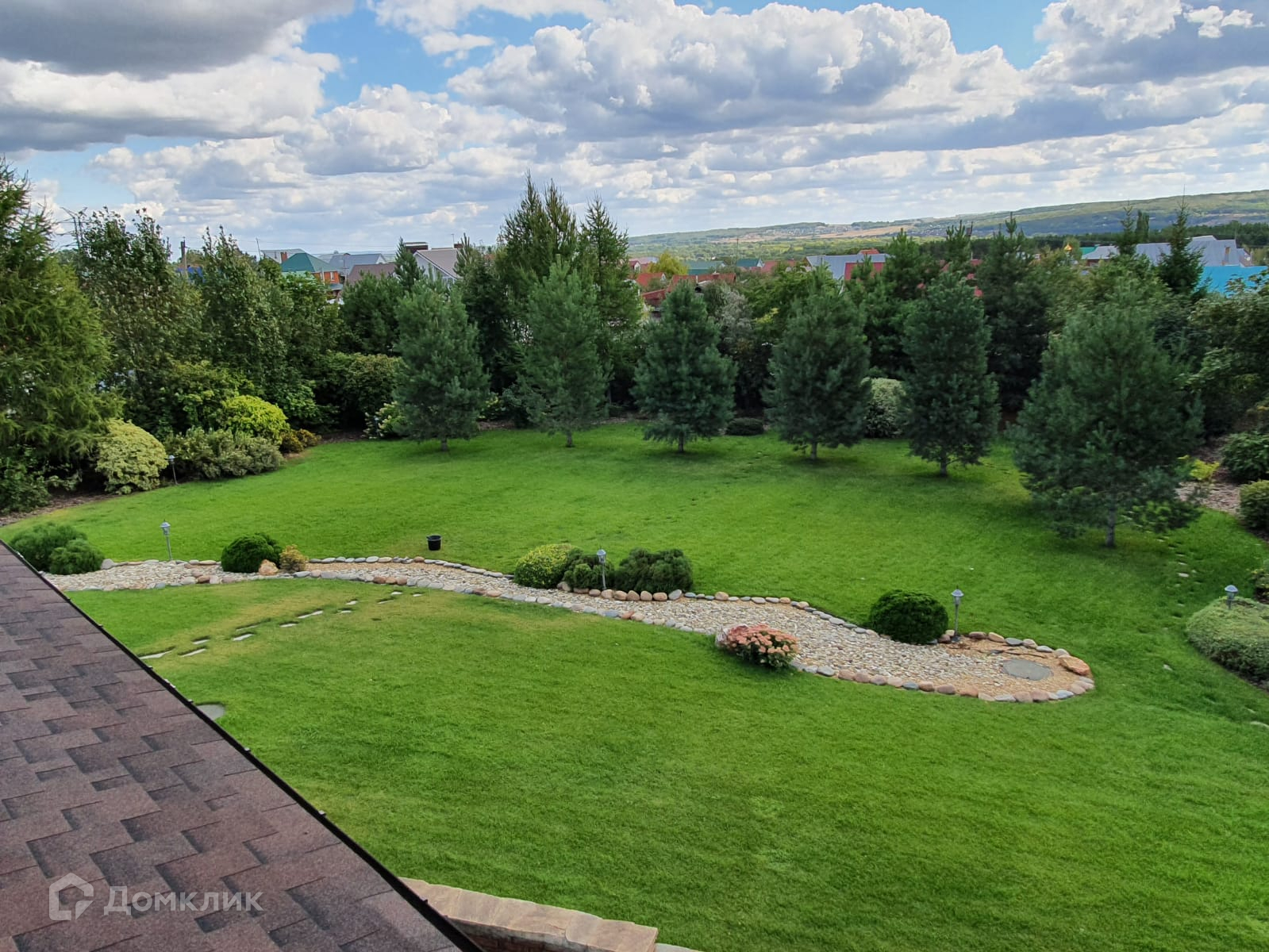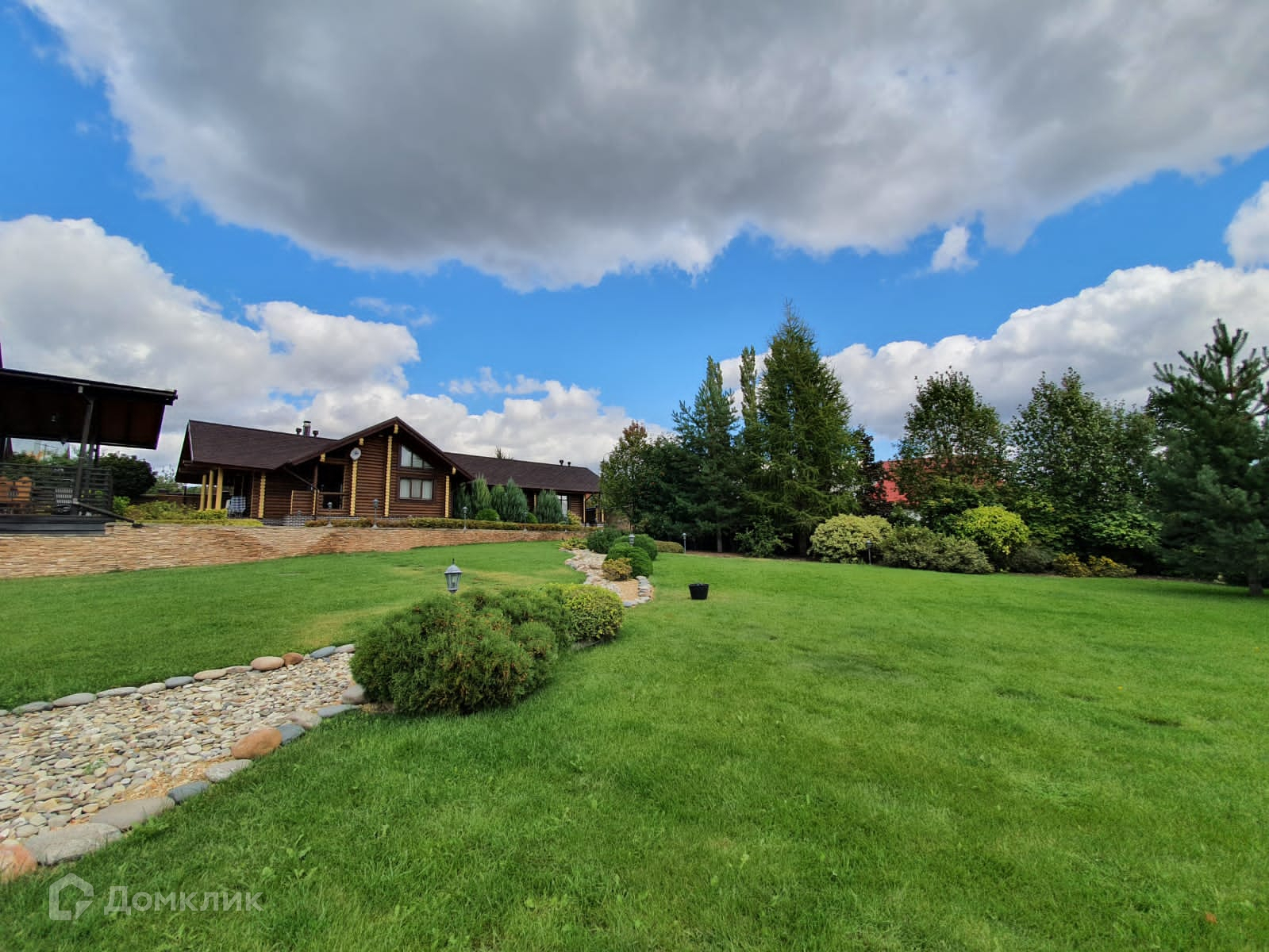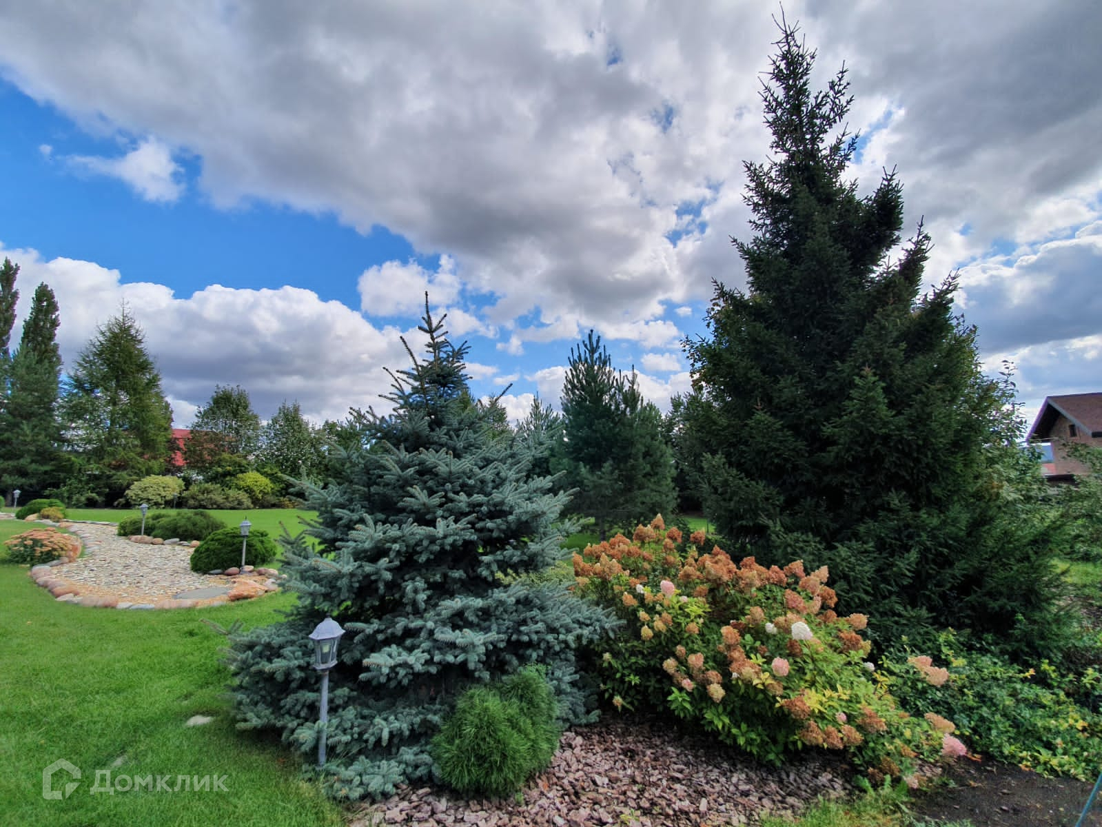 На участке ландшафтный дизайн, альпийские горки, декоративные деревья и кустарники, голубые ели, сосны, плодово-ягодные насаждения, газон с автополивом.