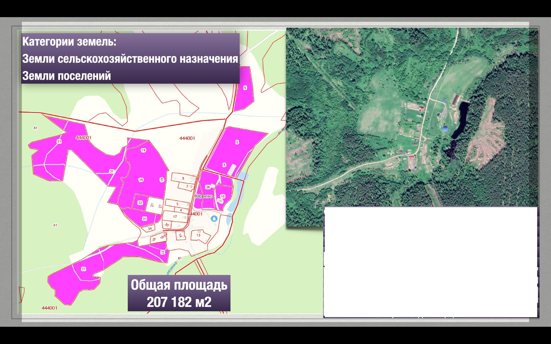 В ее состав входят 2 жилых дома площадью 460 м2 и 250м2, сарай площадью 500м2 и участки общей площадью 201 187 м2. Участки имеют разные кадастровые номера, поэтому нет возможности указать их все в одном объявлении, но покупалось все имущество, и продается, вместе.
