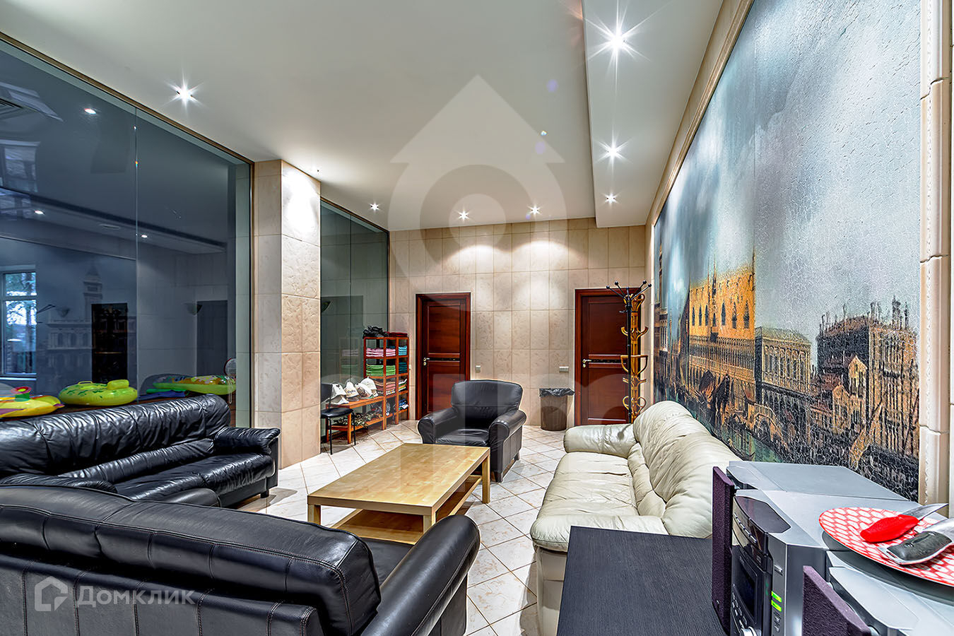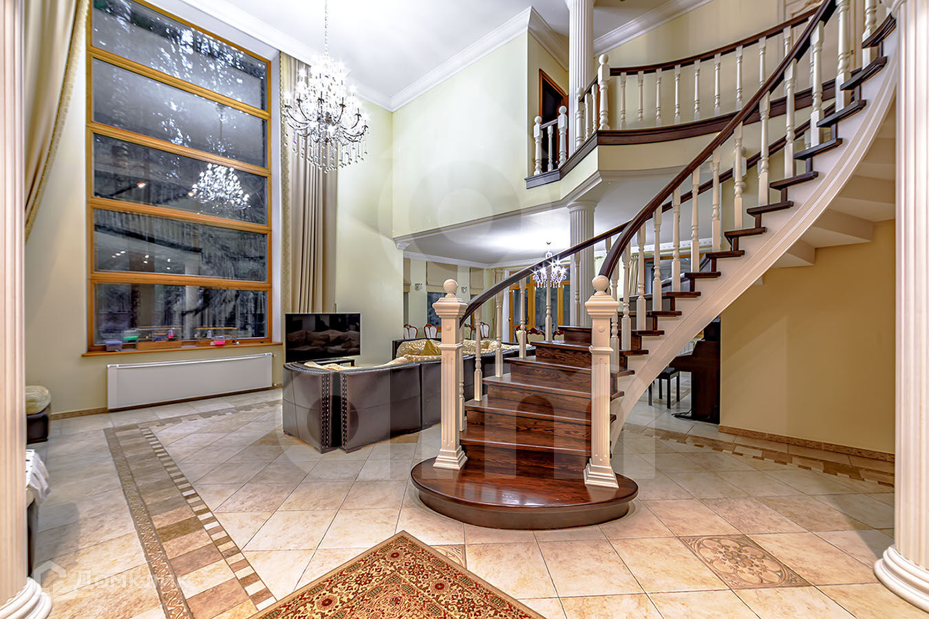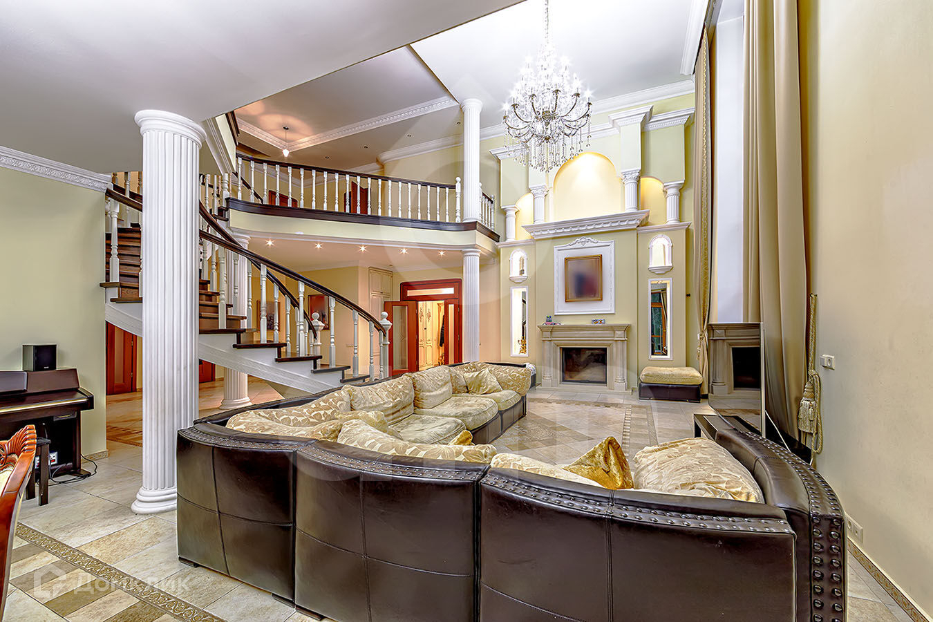 Основной дом: большой бассейн, баня на дровах, 6 спален с санузлами (всего санузлов 8), 2 камина, большая бильярдная, тренажёрный зал, 2 террасы и 3 гаража. Подвала нет.