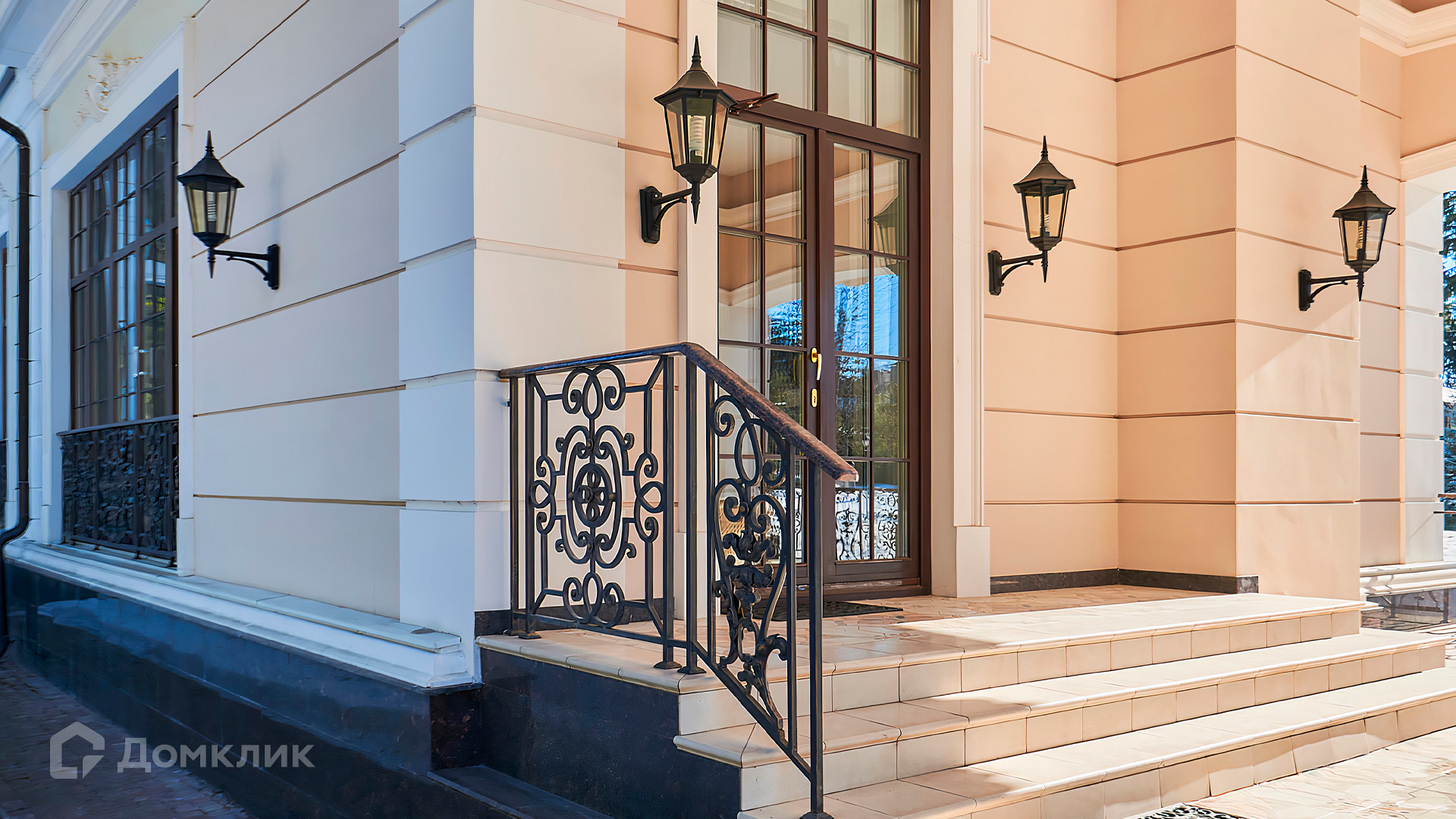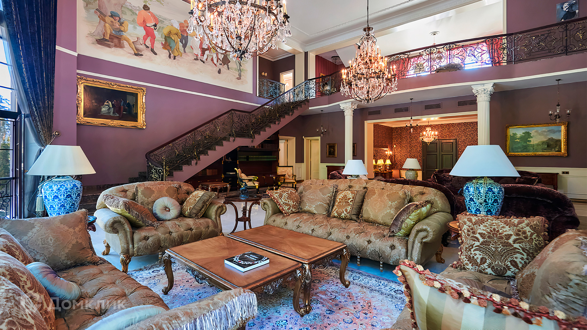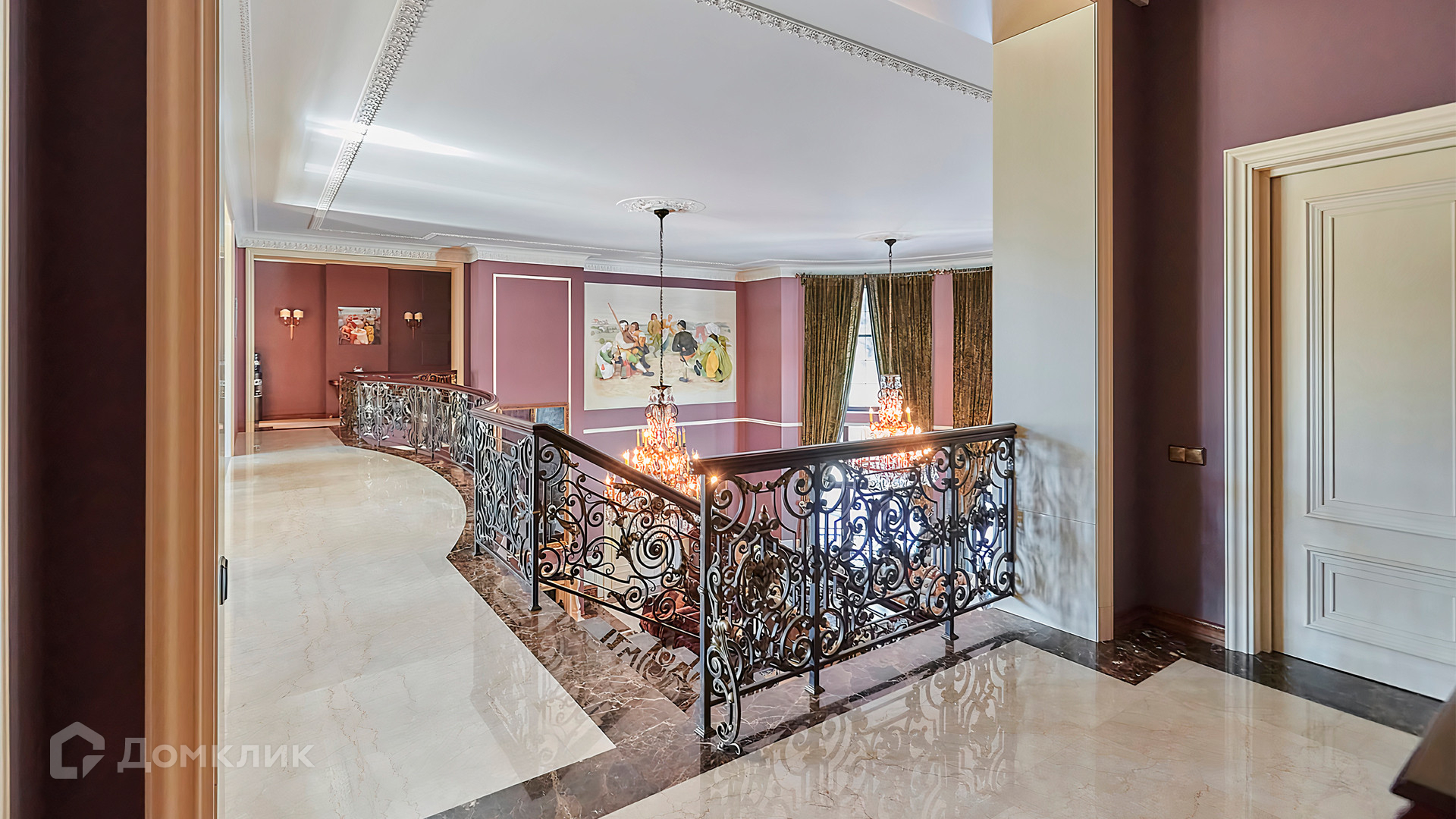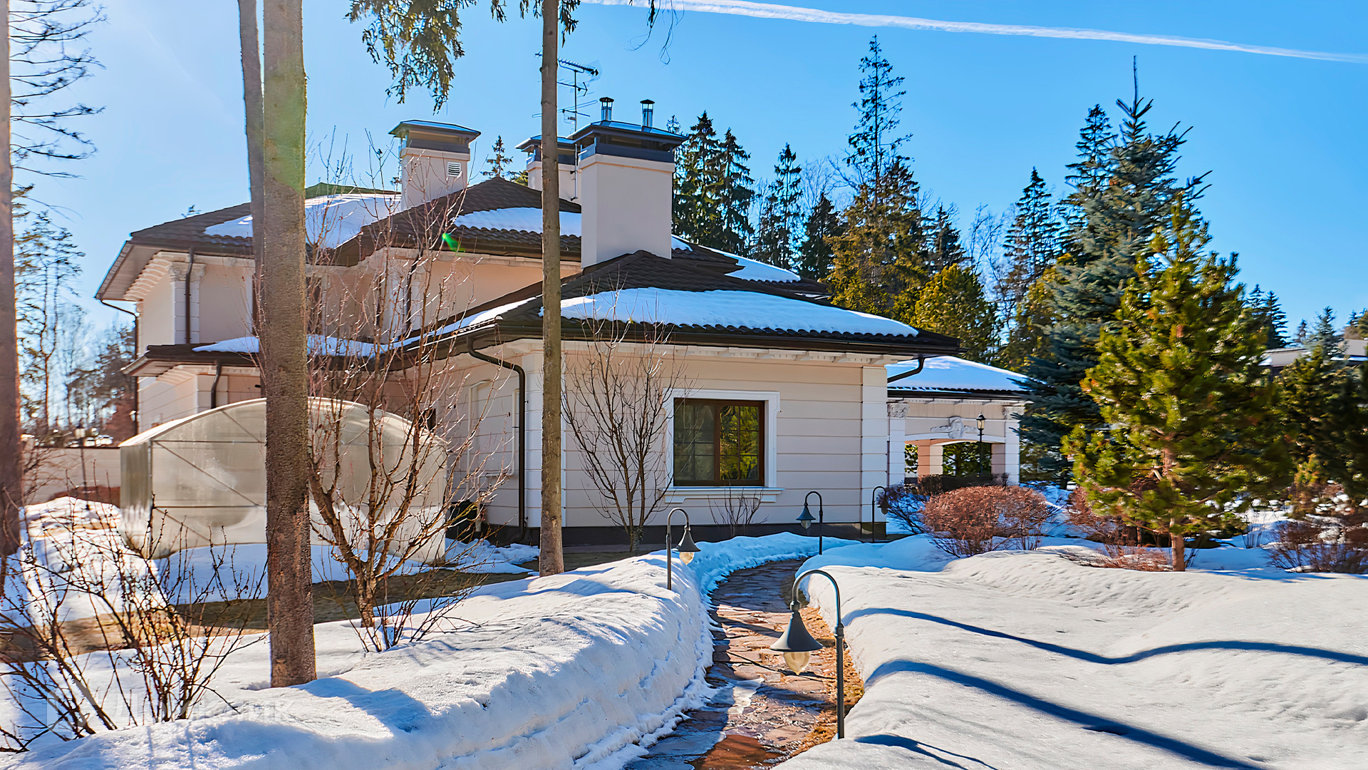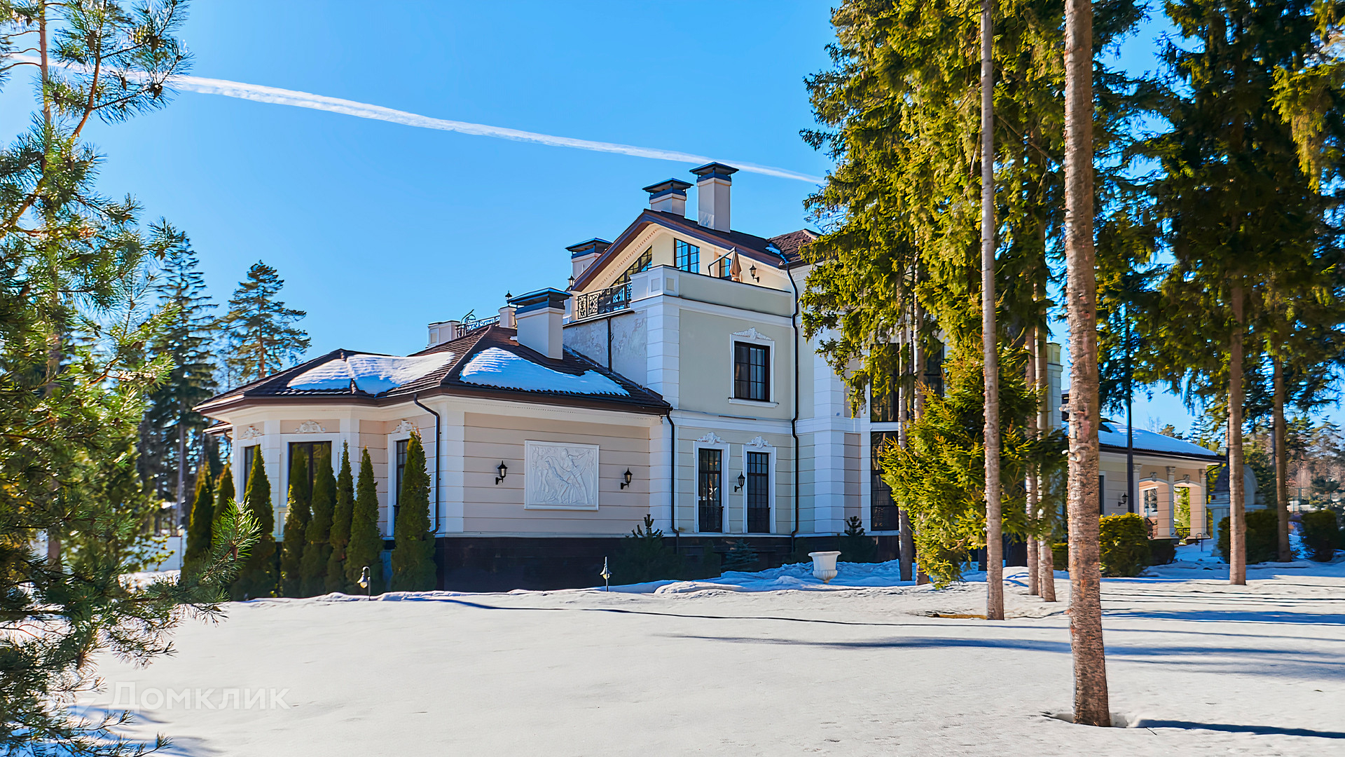 ID 10 803. Горки-7, Юрлово. Просторный особняк площадью 1450 м² расположен на участке 2 гектара с ландшафтным дизайном. Светлый фасад облицован штукатуркой, декорирован рустовкой, наличниками, колоннами, резными капителями и панно. Интерьер выдержан в классическом стиле, в отделке использованы фактура камня и дерева, кованые элементы, орнаменты. Дом оборудован мебелью, бытовой техникой и сантехникой мировых брендов. Внутри разместили 5 спален, гостиную с камином, кухню и столовую, профессиональную кухню с лифтом для подачи блюд, салон красоты, кабинет. В цоколе обустроены бассейн, сауна, хамам, бильярдная и домашний кинотеатр. На участке построены дом для барбекю, дровяная баня, дом для персонала, гостевой дом с автомойкой и гаражом на 4 машины, теннисный корт.