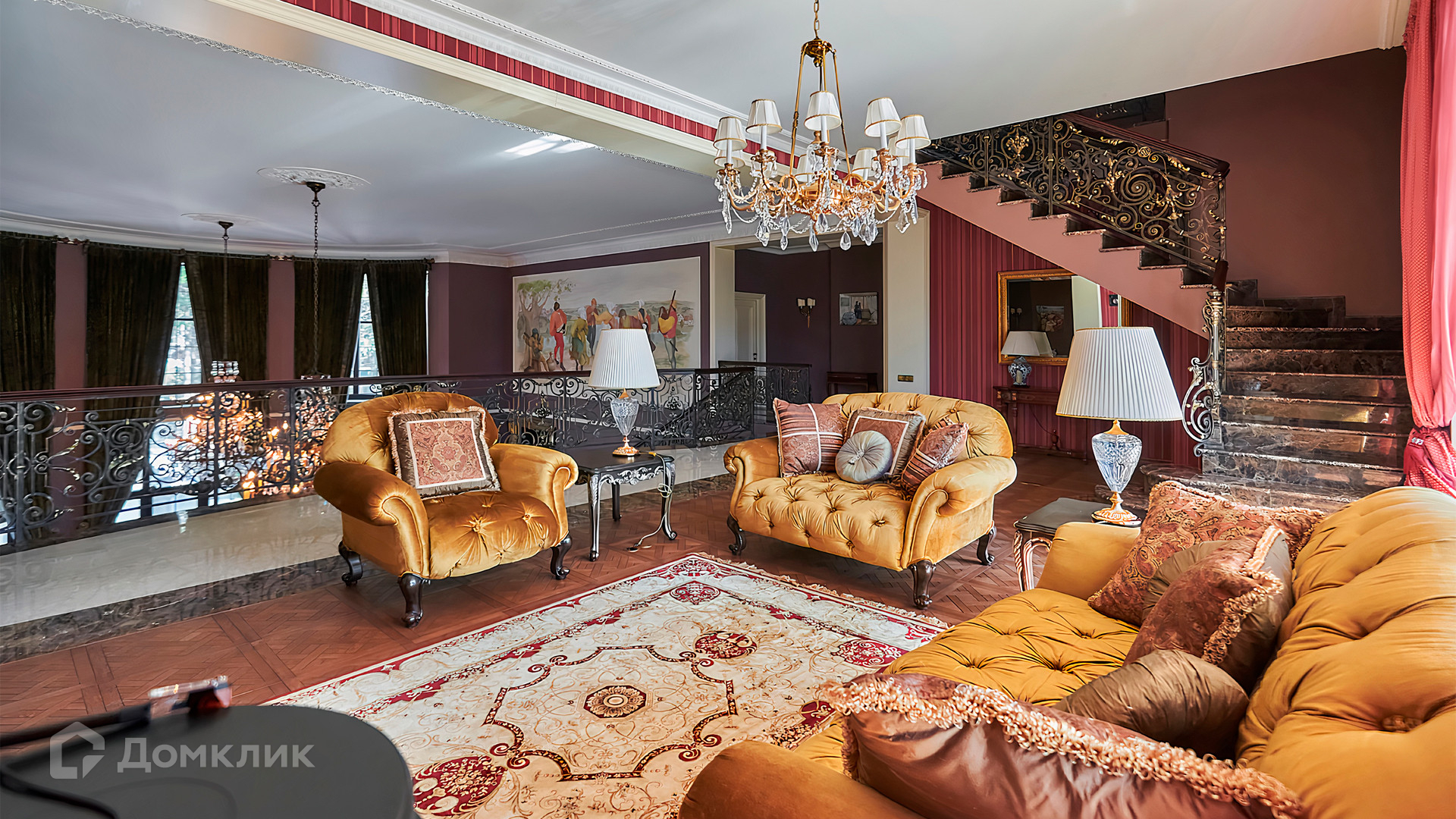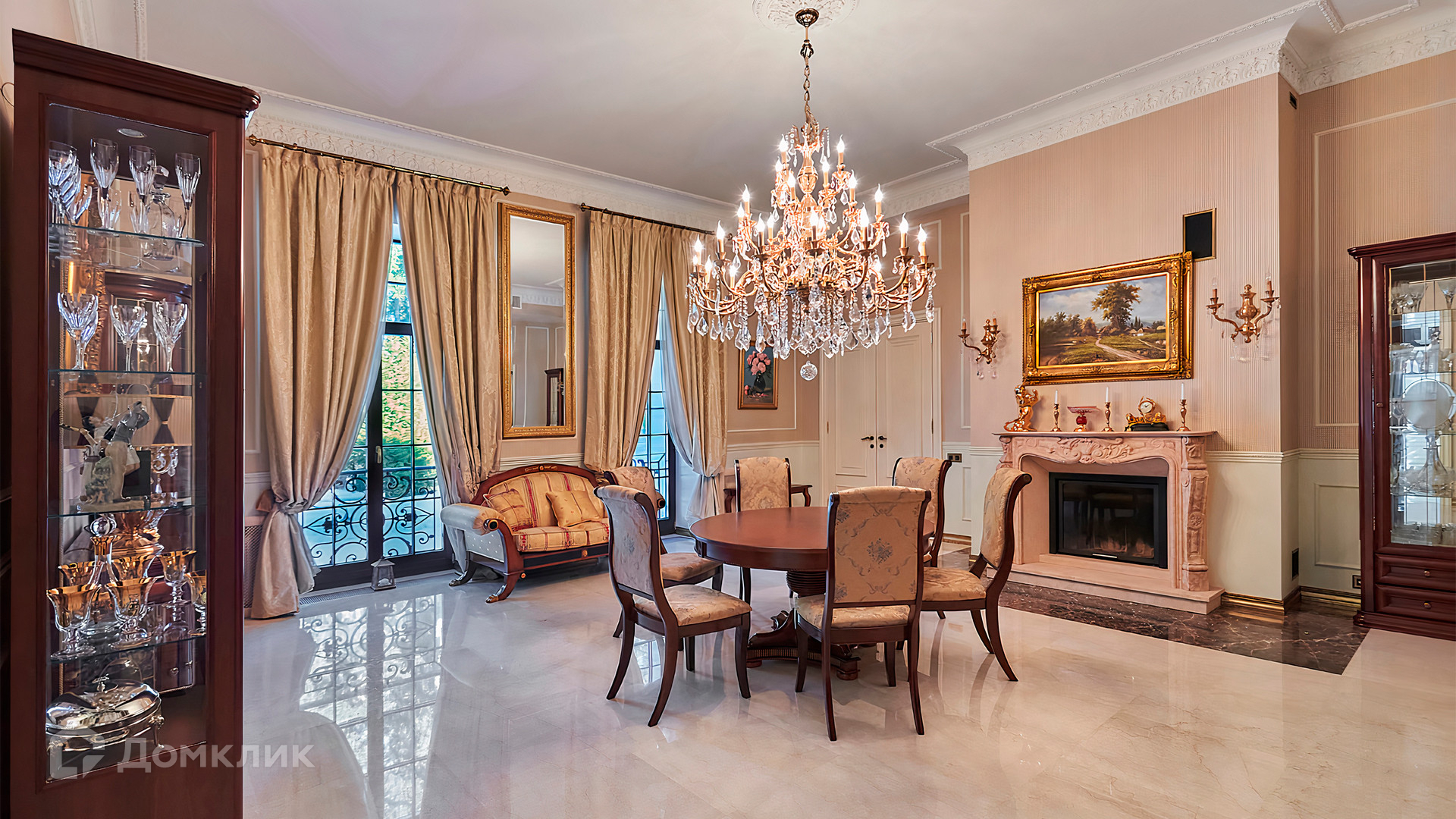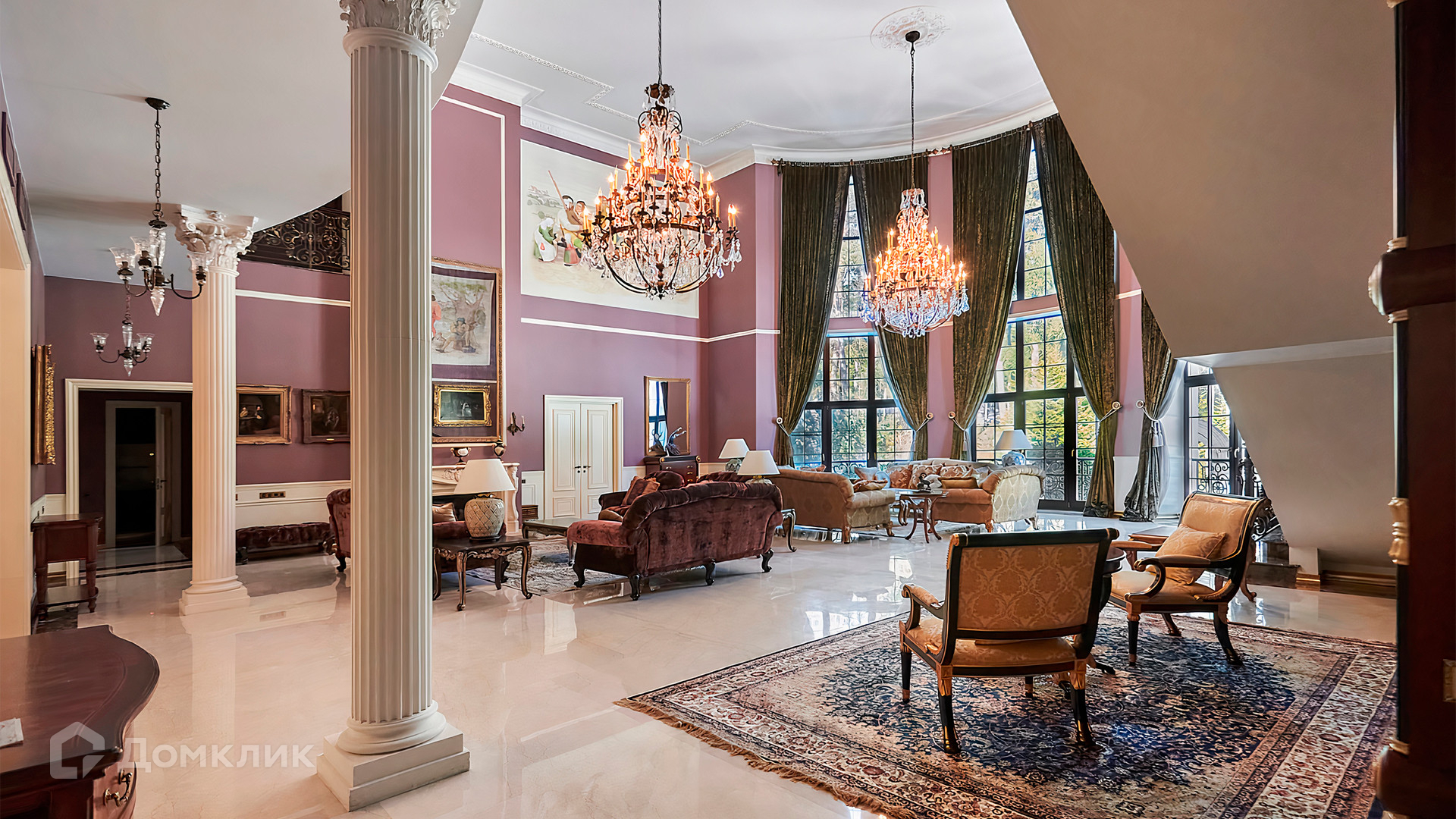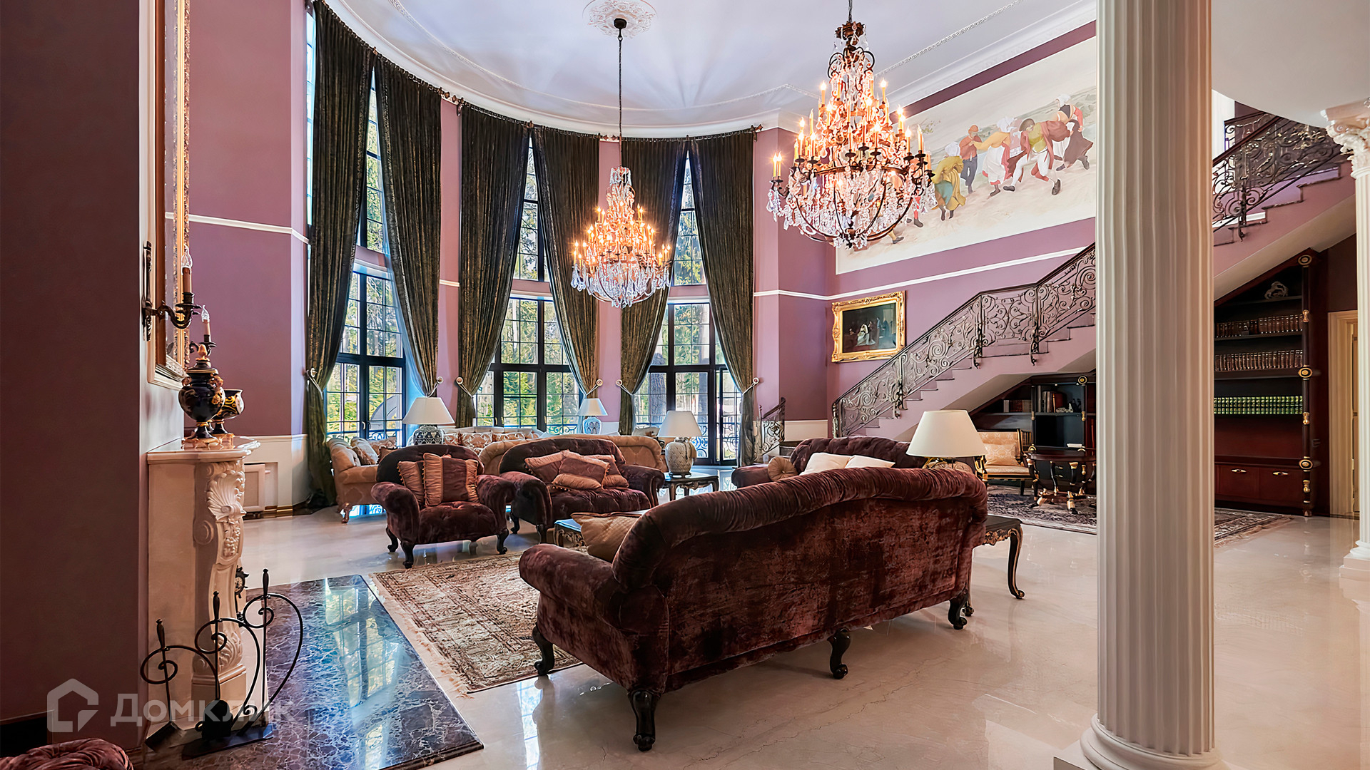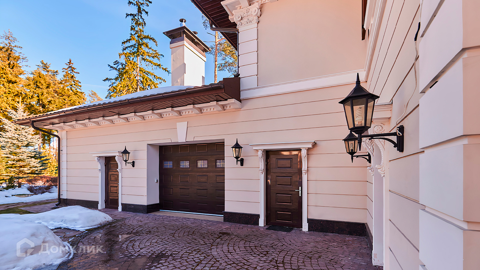 ID 10 803. Горки-7, Юрлово. Просторный особняк площадью 1450 м² расположен на участке 2 гектара с ландшафтным дизайном. Светлый фасад облицован штукатуркой, декорирован рустовкой, наличниками, колоннами, резными капителями и панно. Интерьер выдержан в классическом стиле, в отделке использованы фактура камня и дерева, кованые элементы, орнаменты. Дом оборудован мебелью, бытовой техникой и сантехникой мировых брендов. Внутри разместили 5 спален, гостиную с камином, кухню и столовую, профессиональную кухню с лифтом для подачи блюд, салон красоты, кабинет. В цоколе обустроены бассейн, сауна, хамам, бильярдная и домашний кинотеатр. На участке построены дом для барбекю, дровяная баня, дом для персонала, гостевой дом с автомойкой и гаражом на 4 машины, теннисный корт.