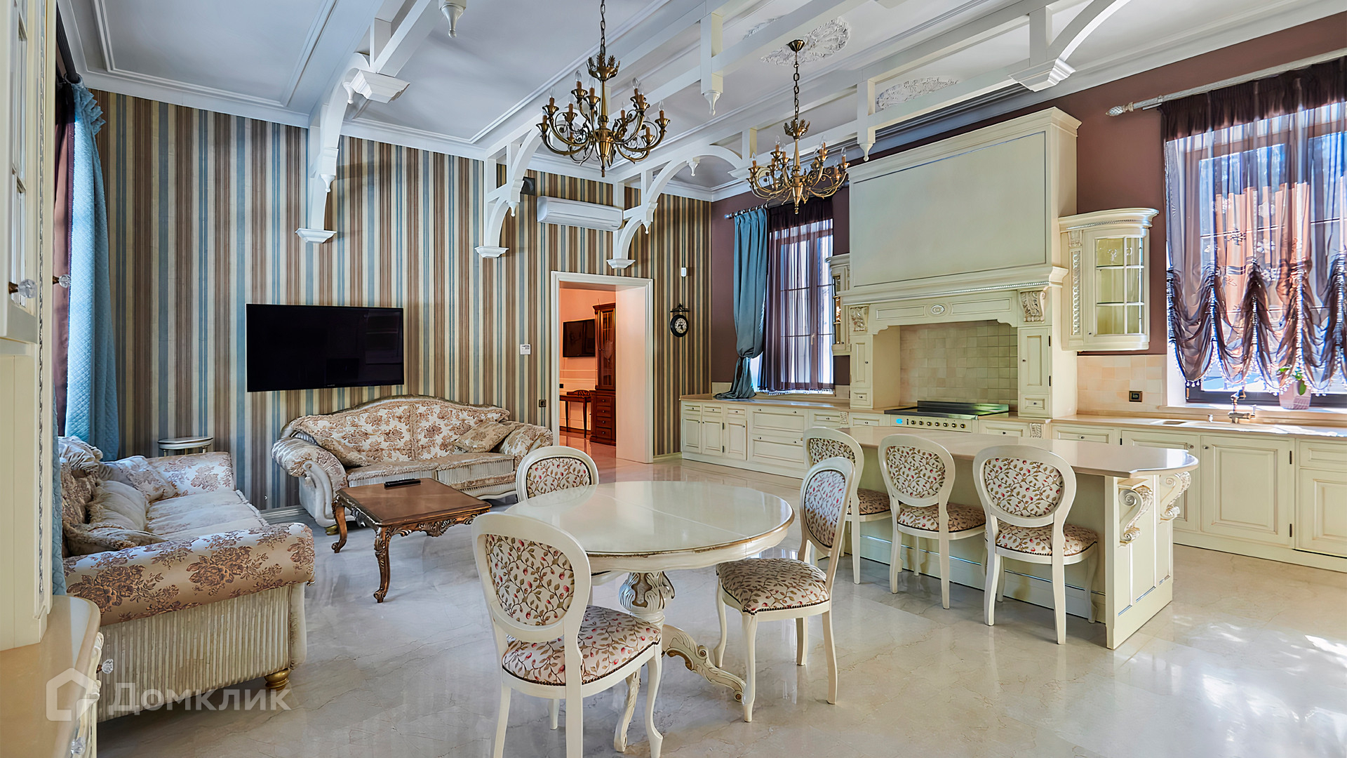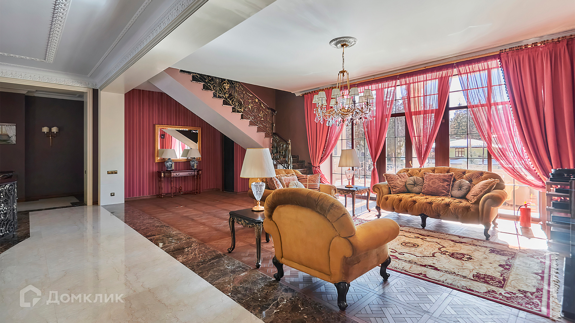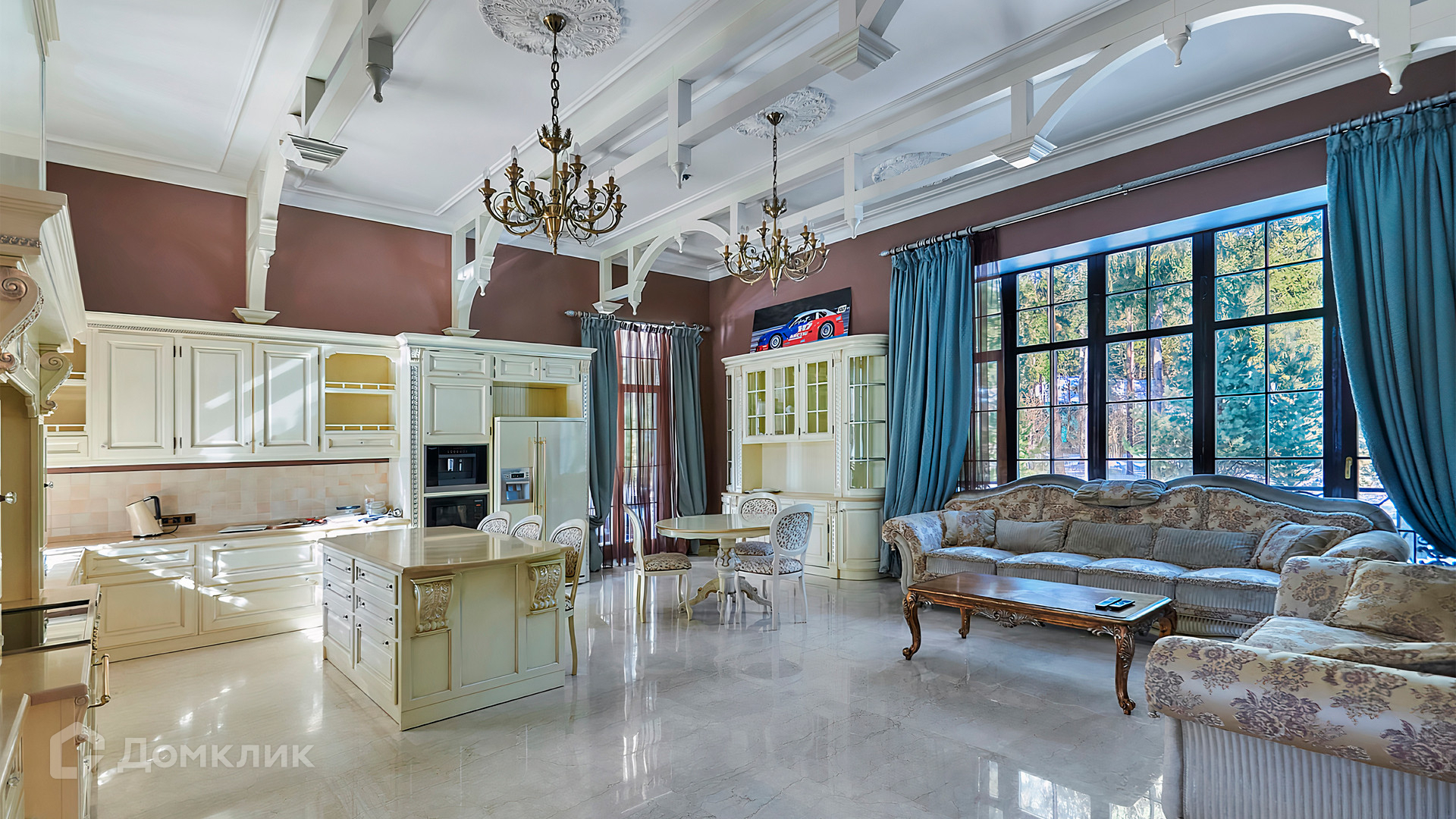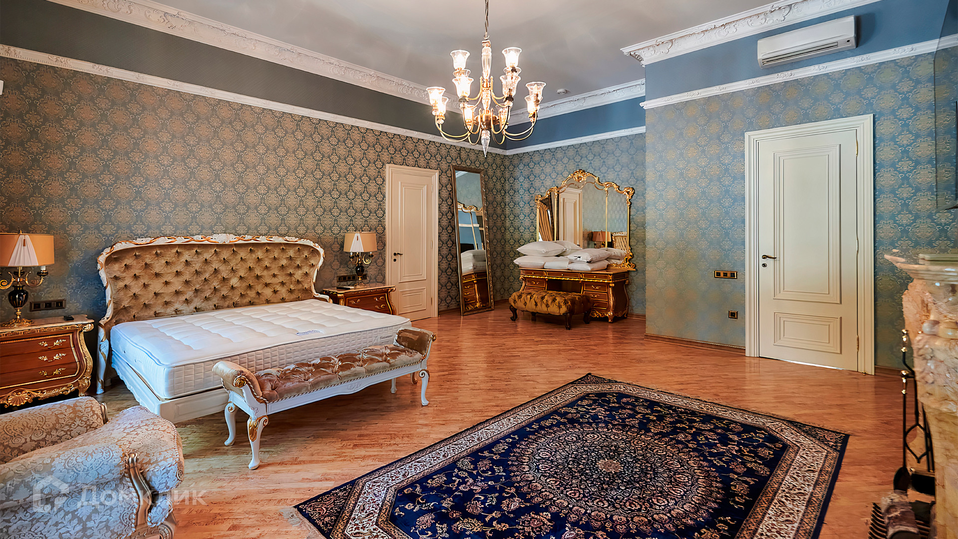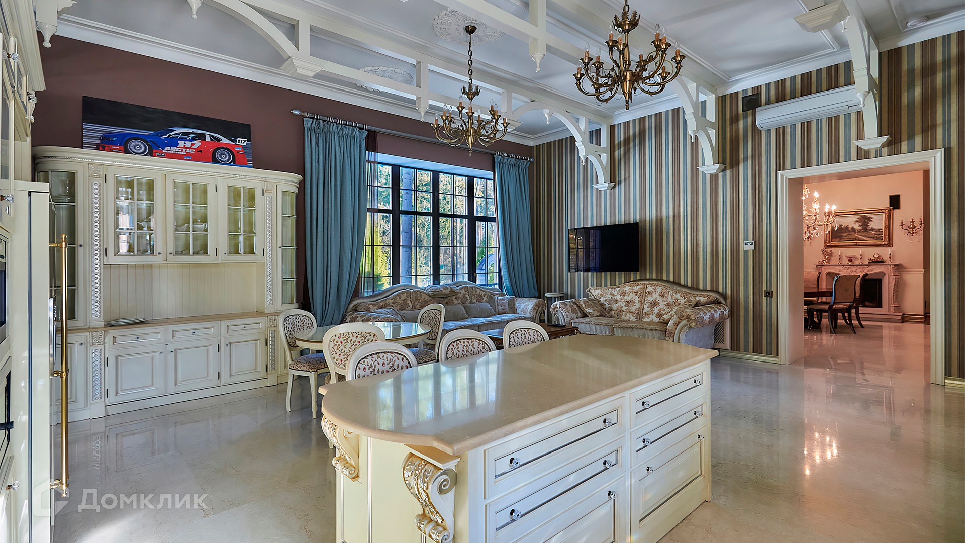 ID 10 803. Горки-7, Юрлово. Просторный особняк площадью 1450 м² расположен на участке 2 гектара с ландшафтным дизайном. Светлый фасад облицован штукатуркой, декорирован рустовкой, наличниками, колоннами, резными капителями и панно. Интерьер выдержан в классическом стиле, в отделке использованы фактура камня и дерева, кованые элементы, орнаменты. Дом оборудован мебелью, бытовой техникой и сантехникой мировых брендов. Внутри разместили 5 спален, гостиную с камином, кухню и столовую, профессиональную кухню с лифтом для подачи блюд, салон красоты, кабинет. В цоколе обустроены бассейн, сауна, хамам, бильярдная и домашний кинотеатр. На участке построены дом для барбекю, дровяная баня, дом для персонала, гостевой дом с автомойкой и гаражом на 4 машины, теннисный корт.