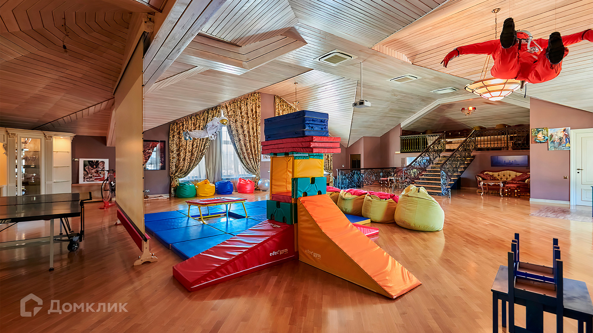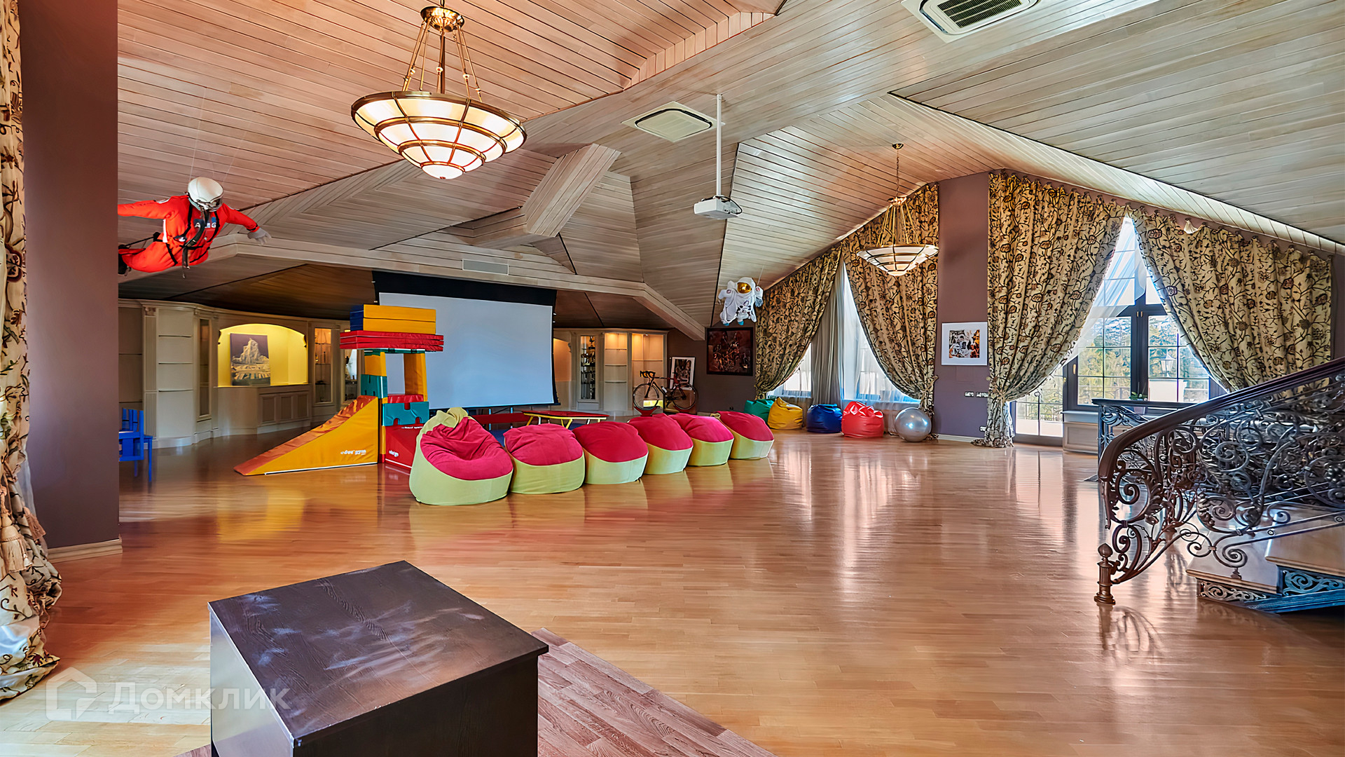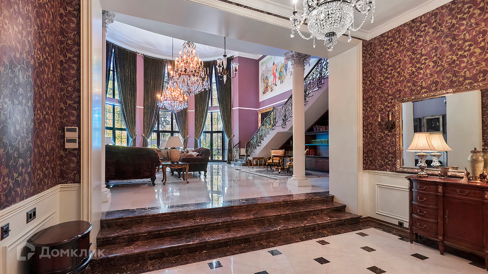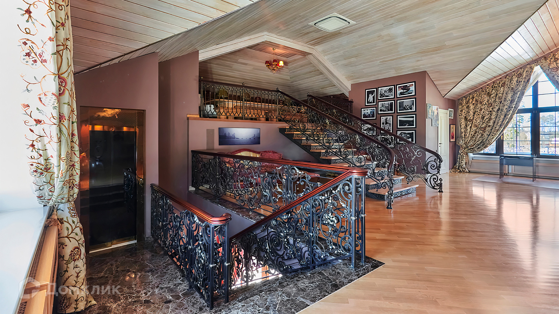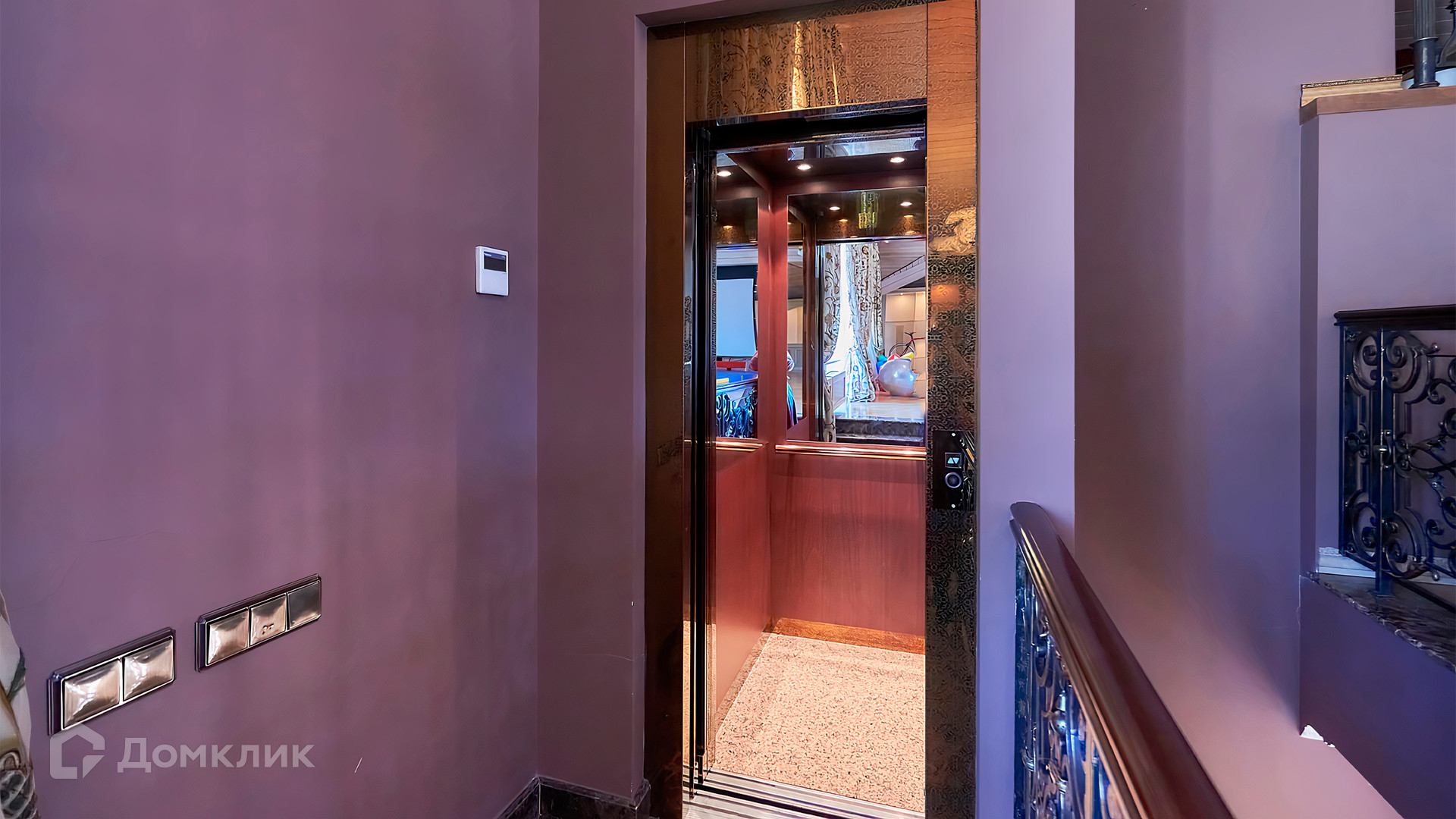 1-й уровень: холл, гардеробная, гостиная, кладовка с лифтом для доставки еды, кухня, столовая, домашний салон красоты, санузел, спальня с 2-мя гардеробными и санузлом, кабинет, пассажирский лифт.