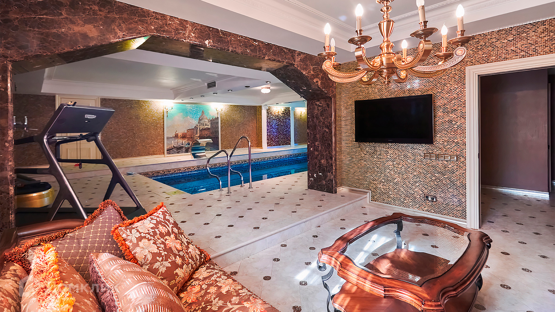 Цоколь: бассейн, сауна, душевая, хамам, котельная, санузел, бильярдная, домашний кинотеатр, санузел, сумочная и винная, профессиональная кухня с лифтом для подачи блюд, постирочная.