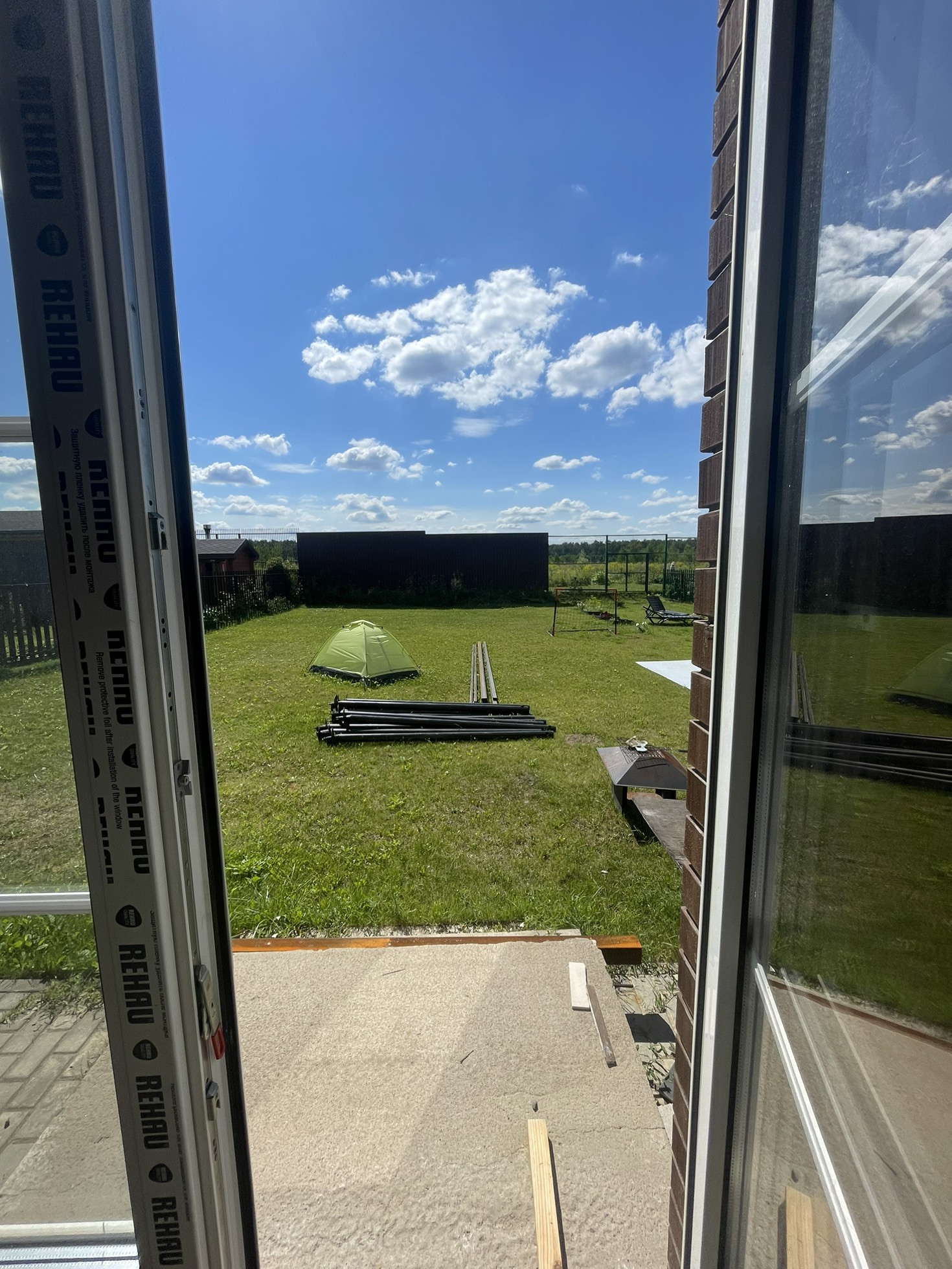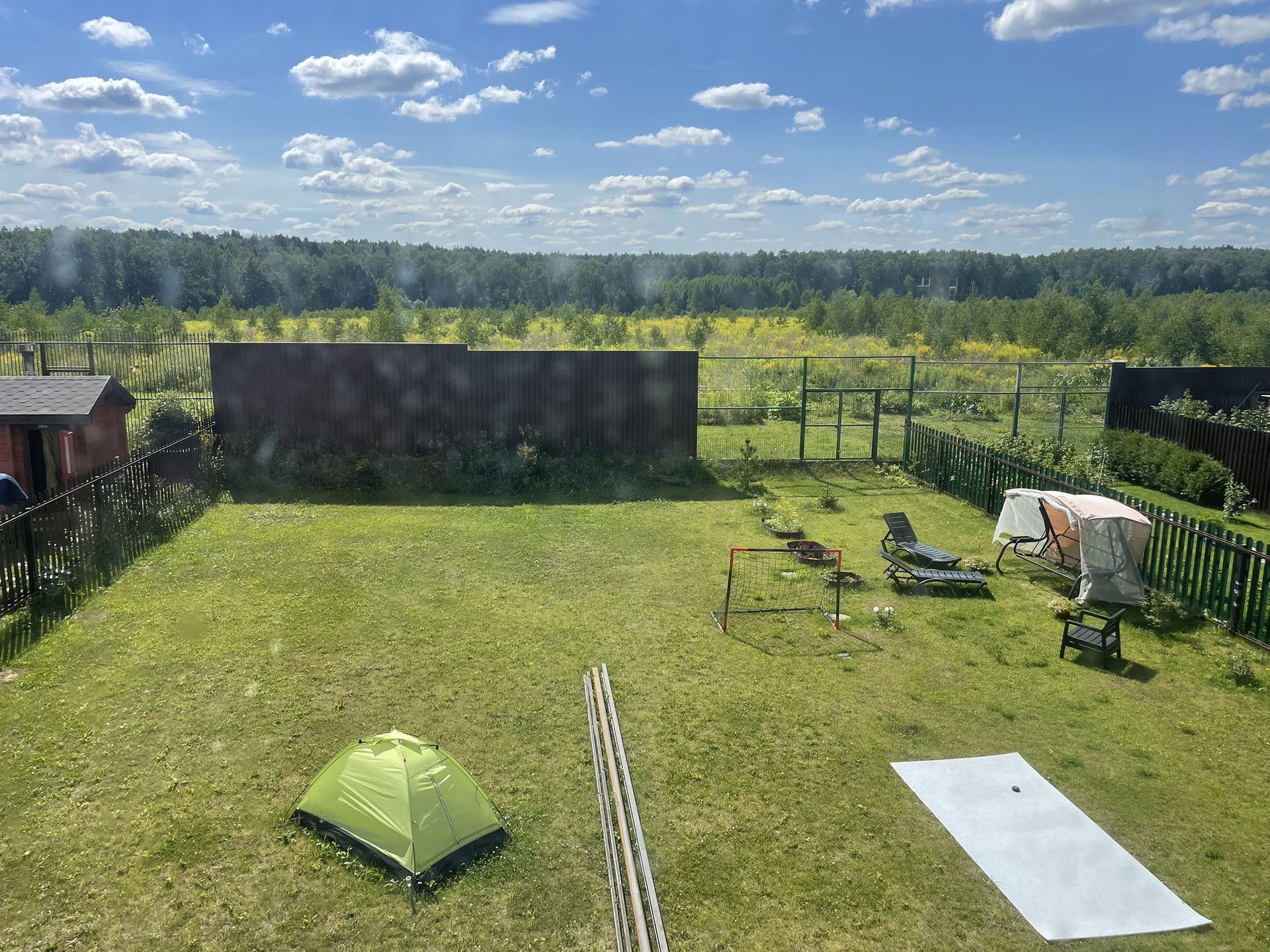 На заднем дворе выполнена вертикальная планировка, устроен газон.
