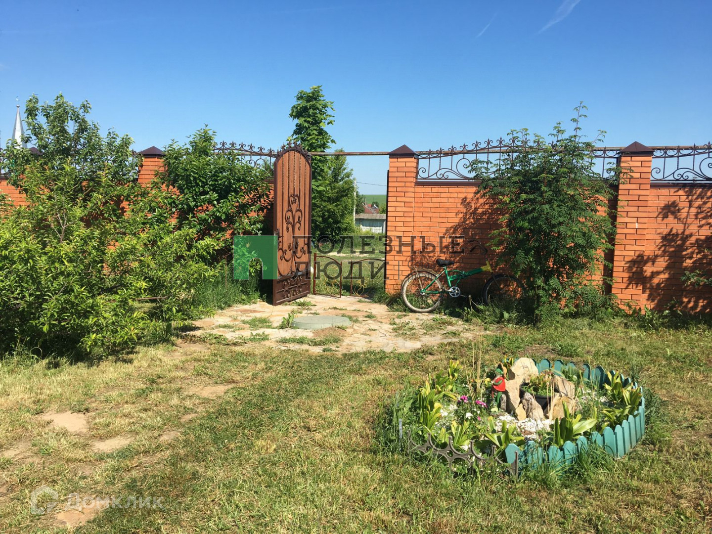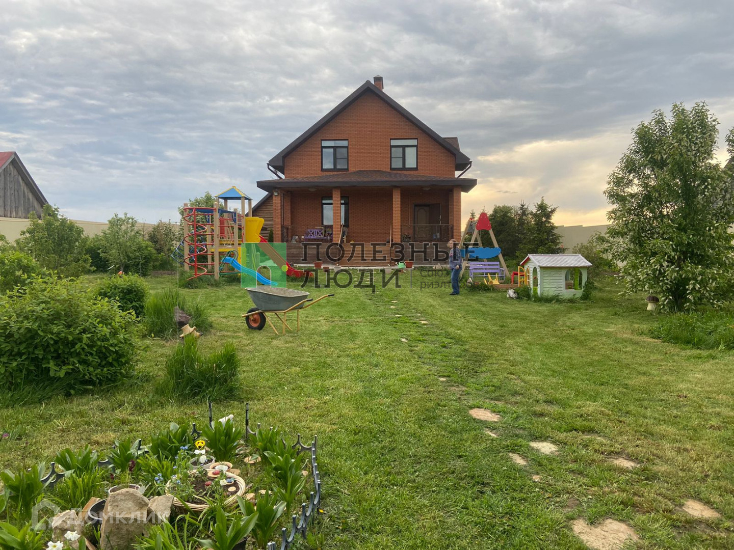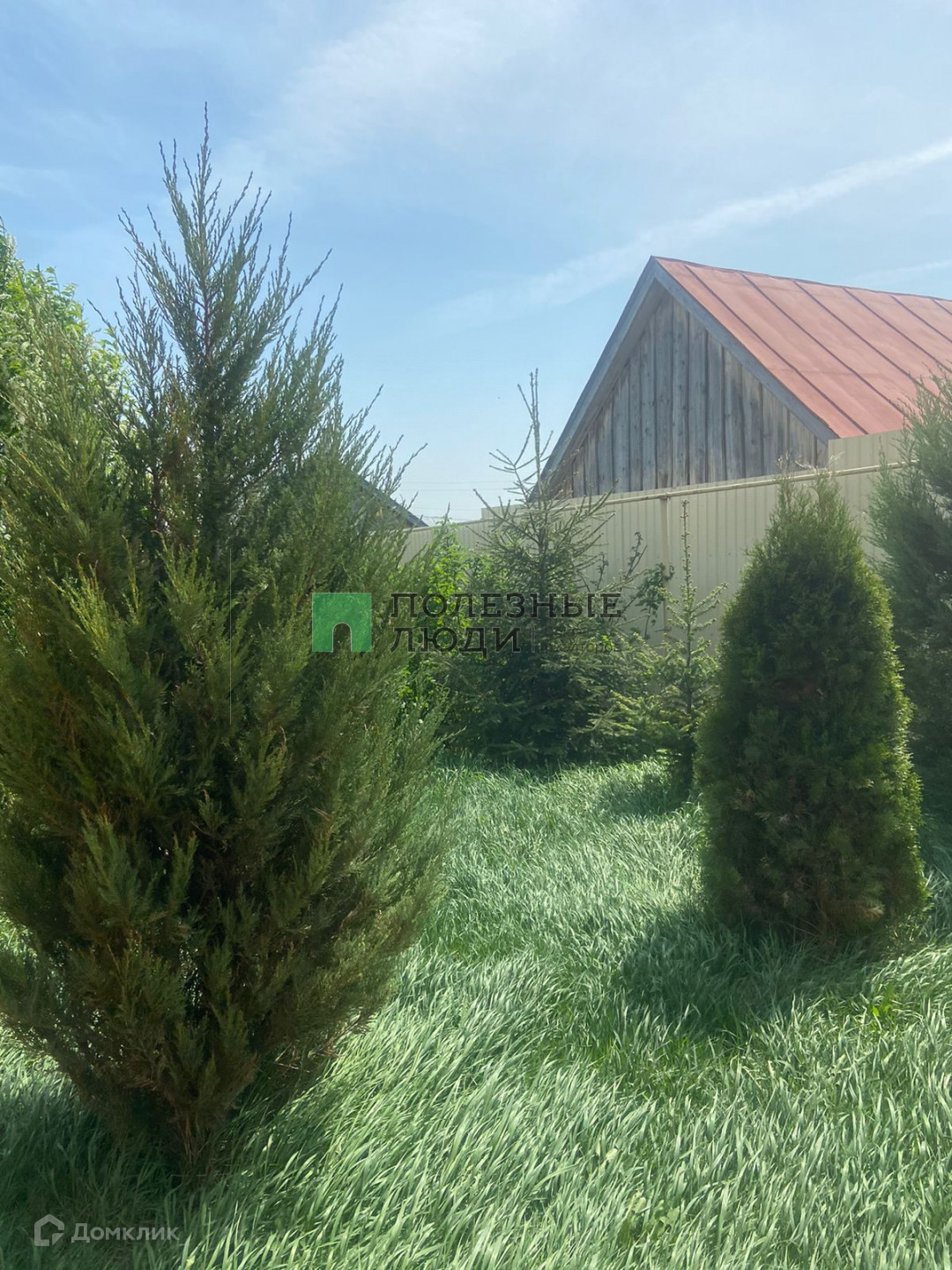 На участке своя детская площадка, есть теплица, беседка. Посажены туи, ели, яблони, груши, черешня, малина, смородина, можевельник, орешник, рябина.