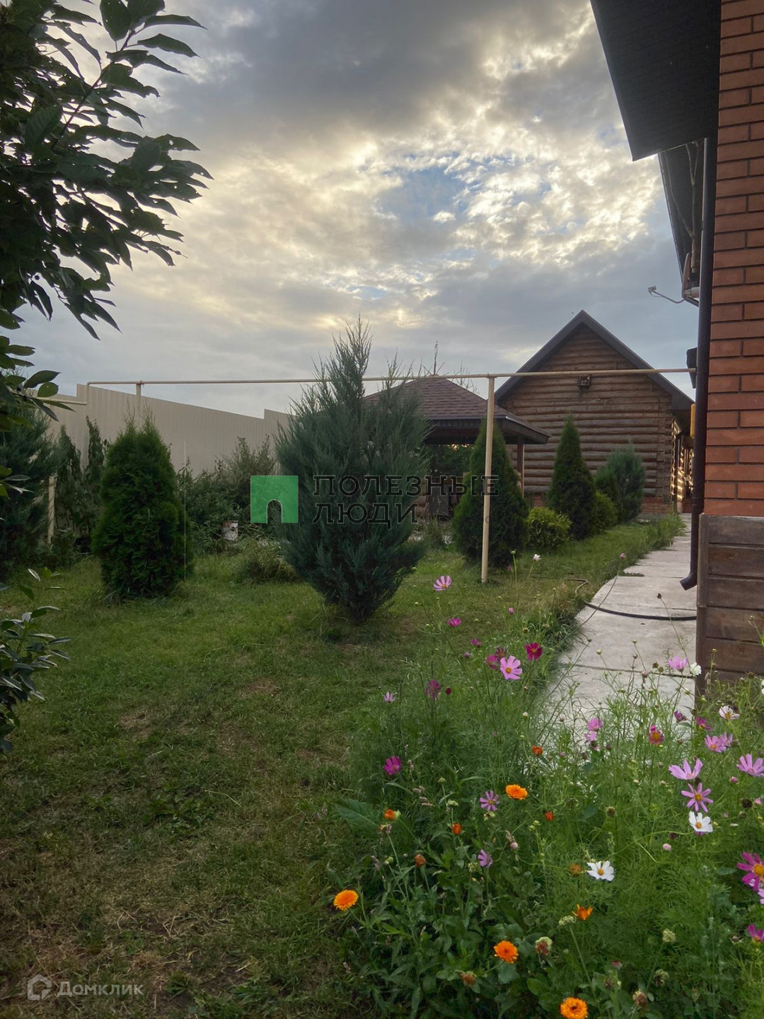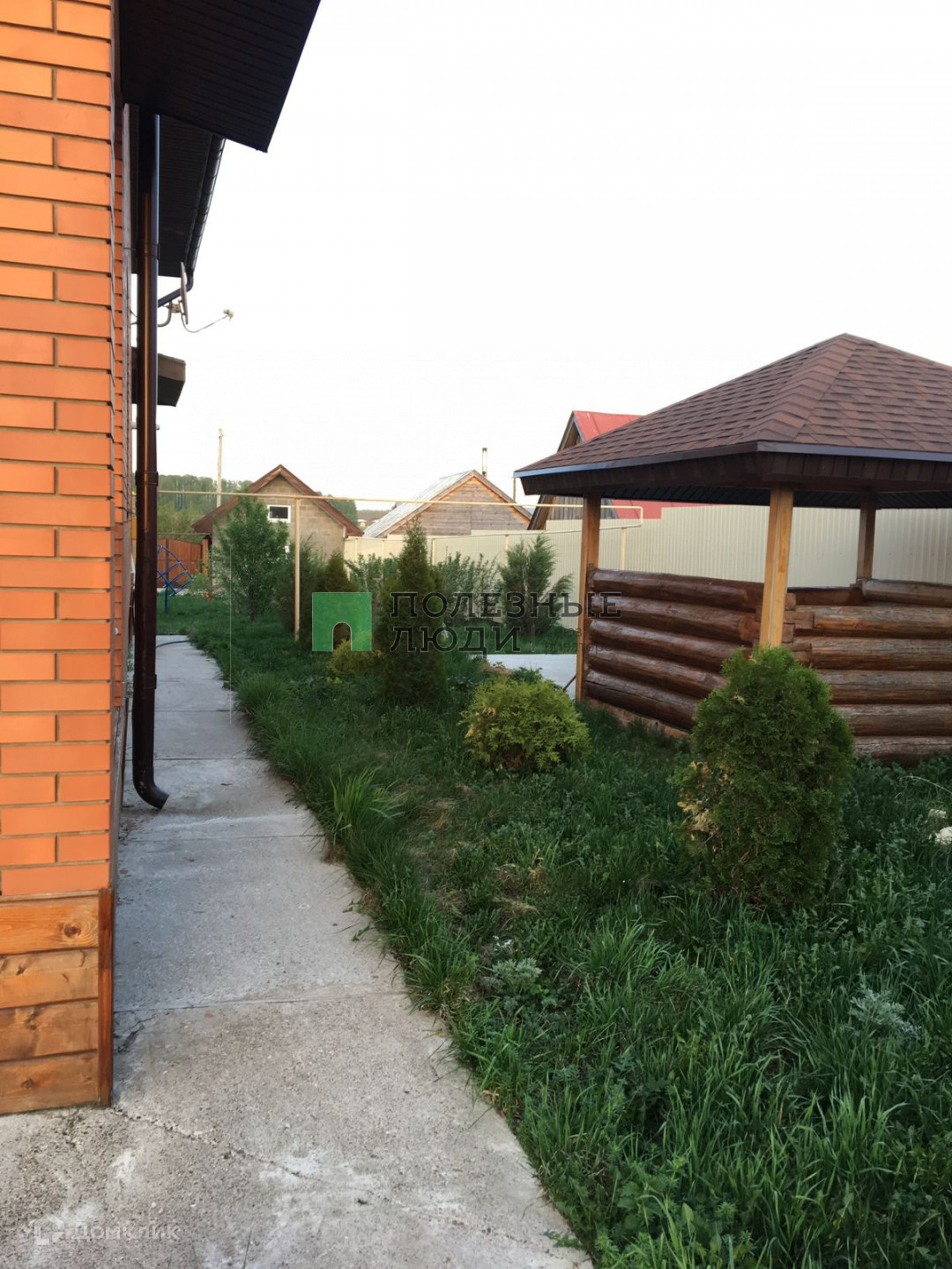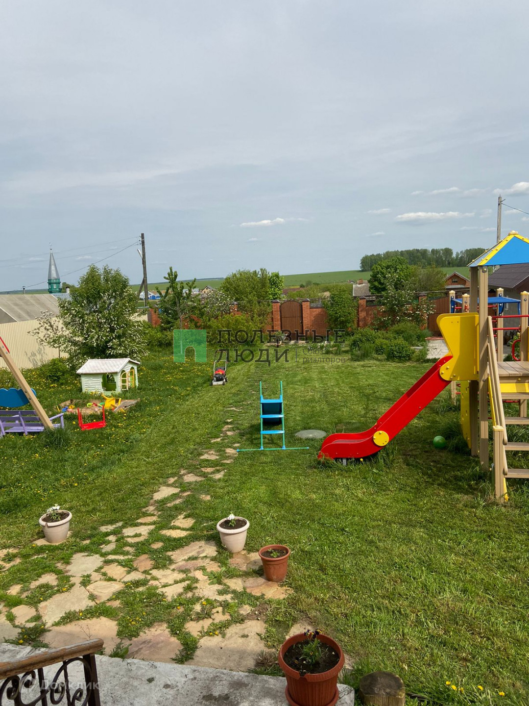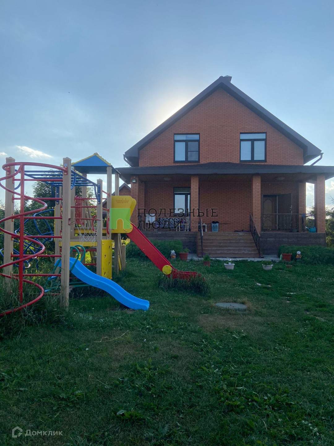 На участке своя детская площадка, есть теплица, беседка. Посажены туи, ели, яблони, груши, черешня, малина, смородина, можевельник, орешник, рябина.